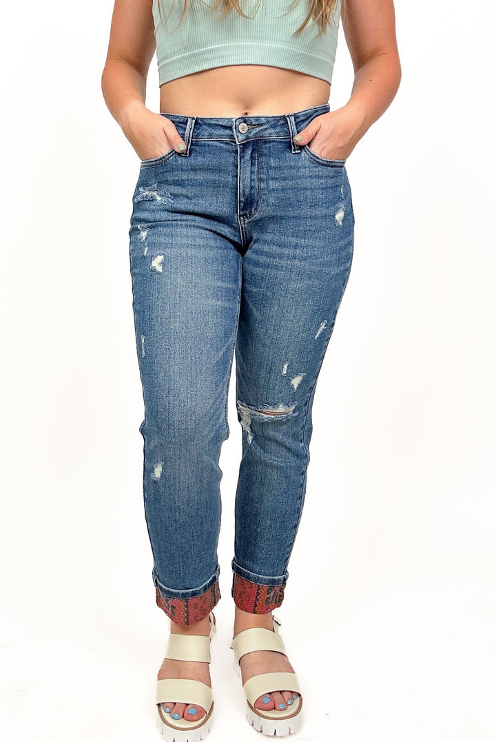 Judy Blue Paisley Patch Cuff Boyfriend Jeans