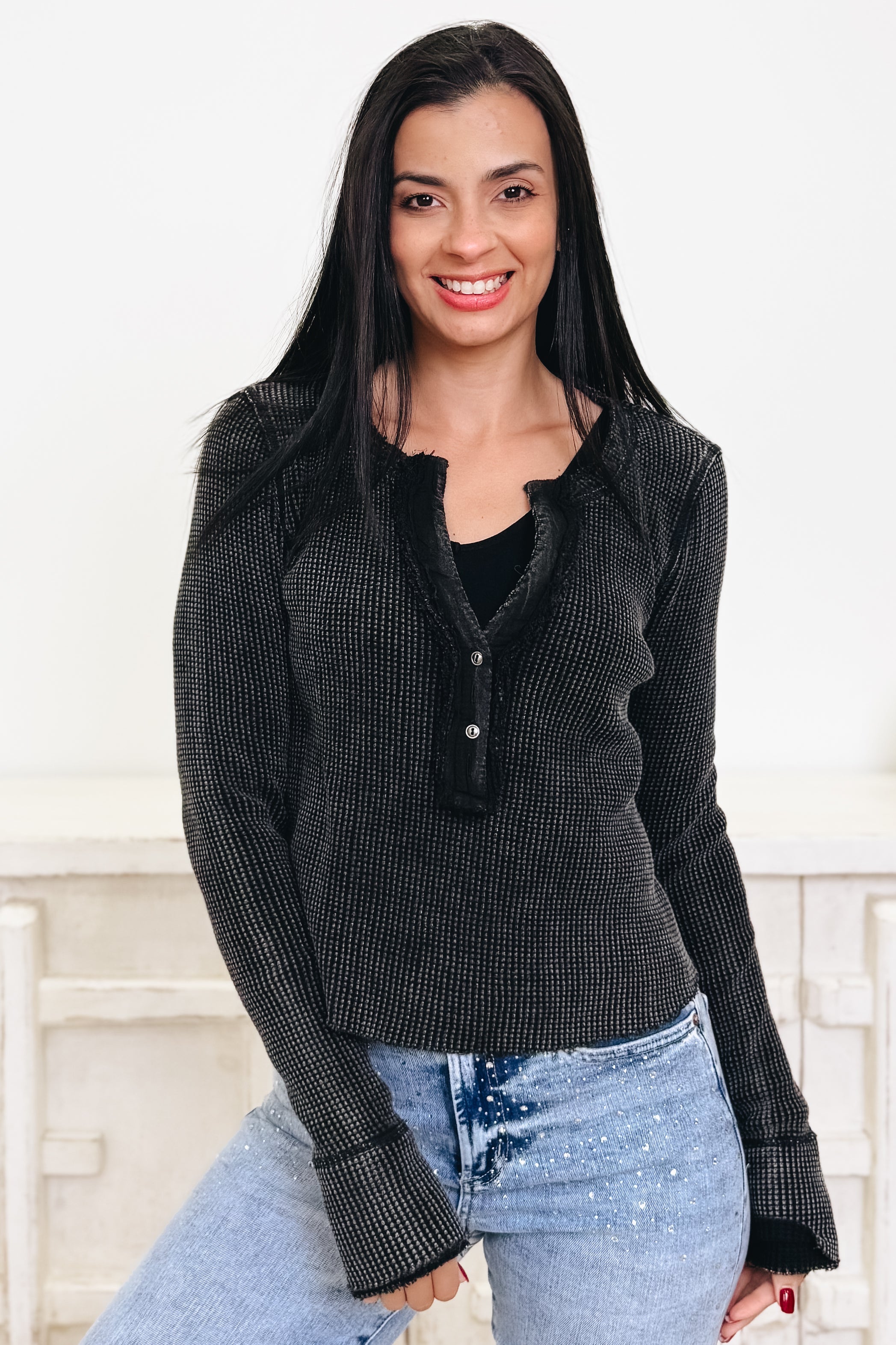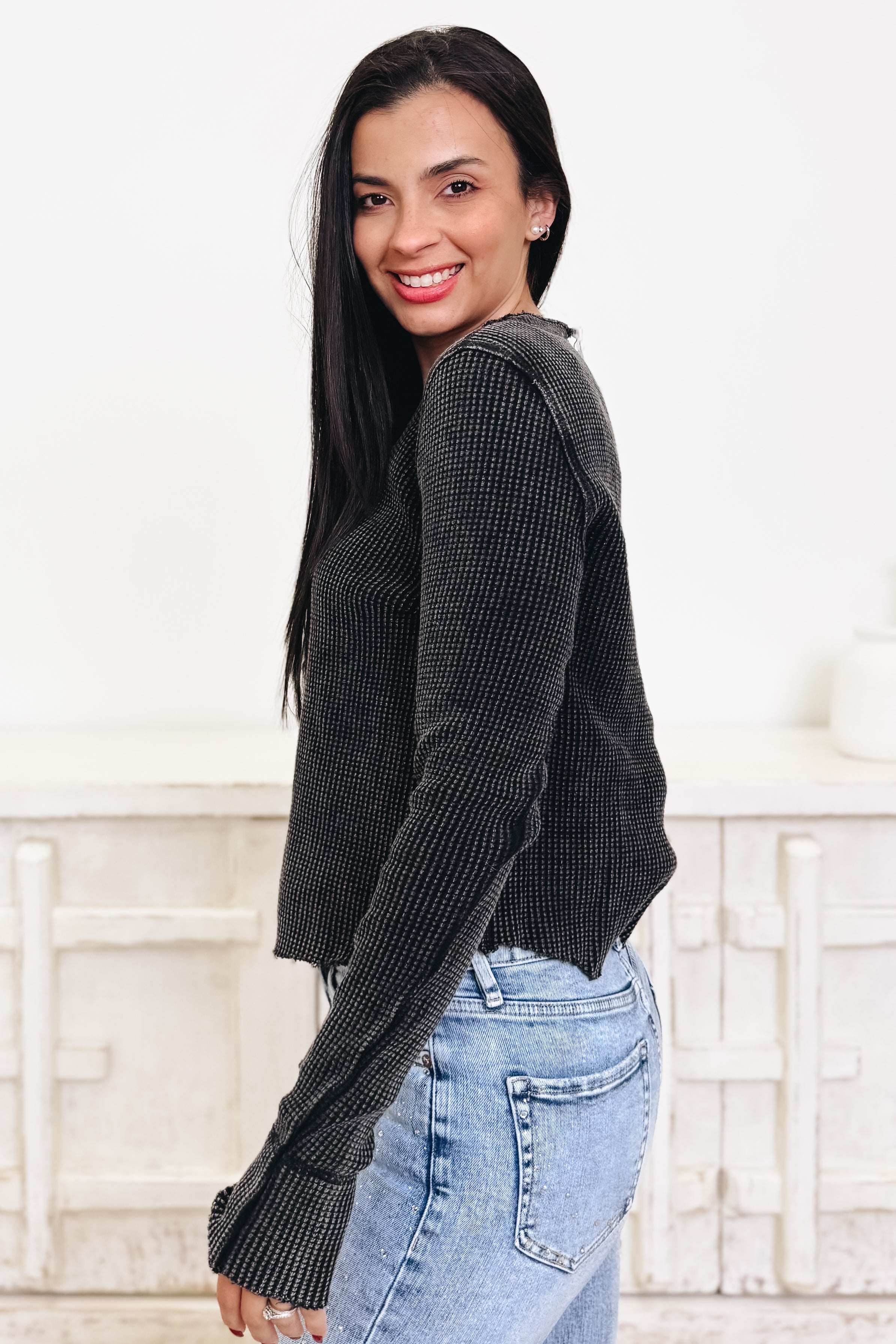 The easiest little “throw on and look cute” top. This waffle-knit henley has a comfy fitted feel with a button-front neckline, extra-long sleeves with a fun cuff, and a slightly cropped, casual hem that pairs perfectly with high-rise denim. Layer it or wear it solo — either way, it’s a closet staple with personality.