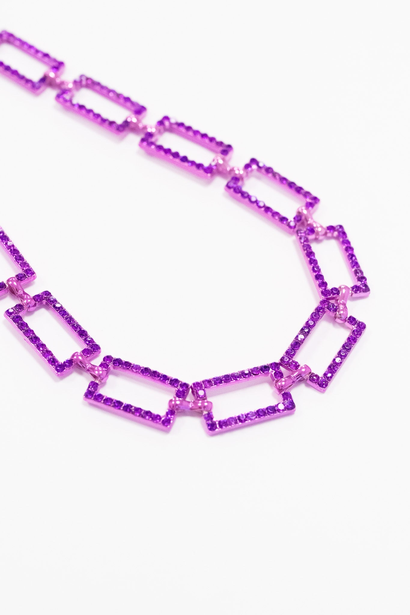 Elevate your outfit with our super lightweight All Night Long necklace, featuring stunning rectangles linked together with all the bling in the world. Available in a perfect liquid bright purple color, this necklace is not only super cute but also lays beautifully on your neck. With a magnetic closure and a 3" extender, this necklace is both stylish and convenient for everyday wear.
