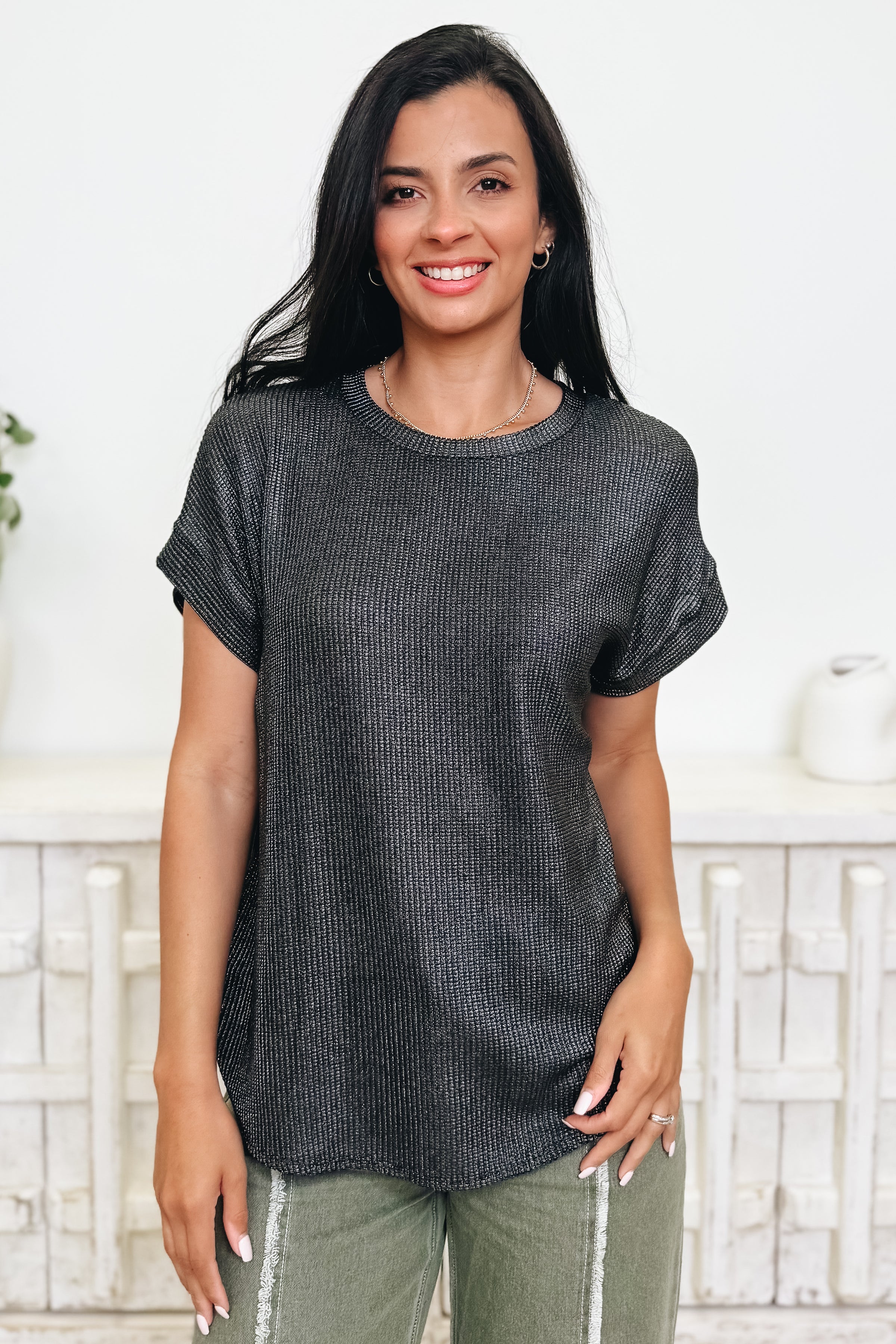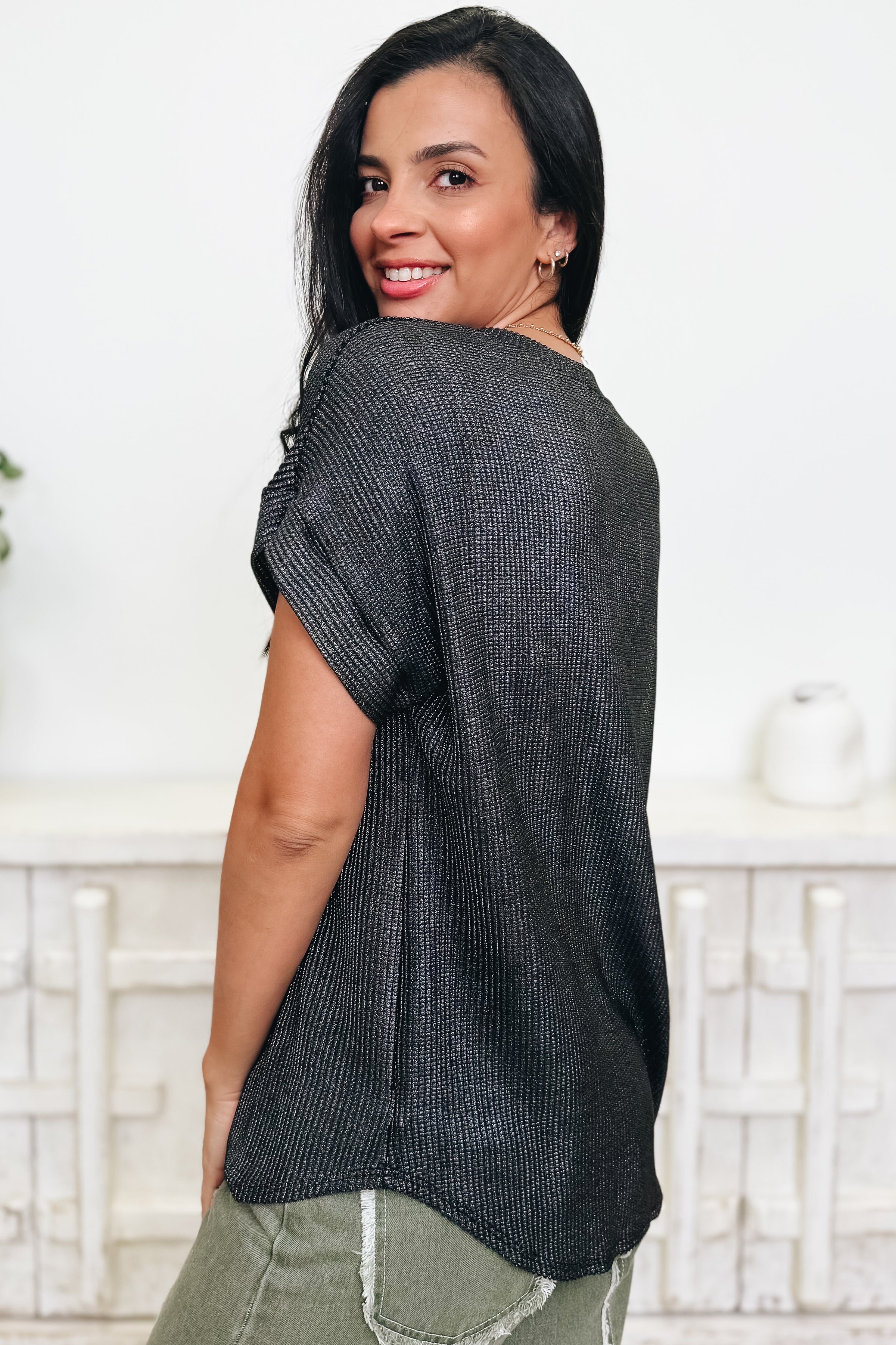 Add a little sparkle to your everyday look with this gorgeous shimmer knit top! Featuring a soft, lightweight fabric with a subtle metallic sheen, this piece blends comfort and style perfectly. The relaxed fit and rolled sleeves give it that effortlessly cool vibe — easy to dress up with statement jewelry or keep casual with your favorite denim. A must-have staple for when you want comfy and cute with just the right touch of shine!