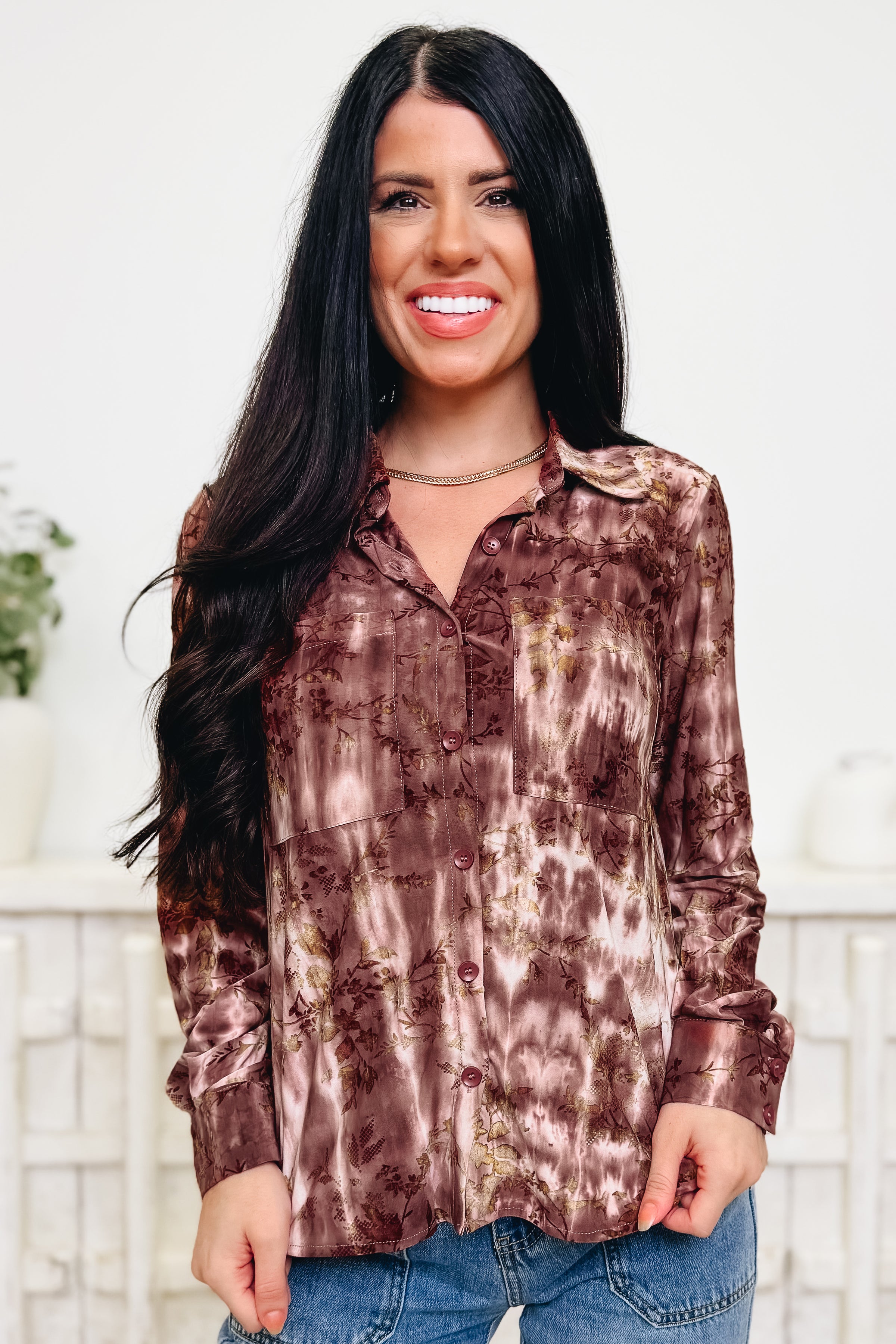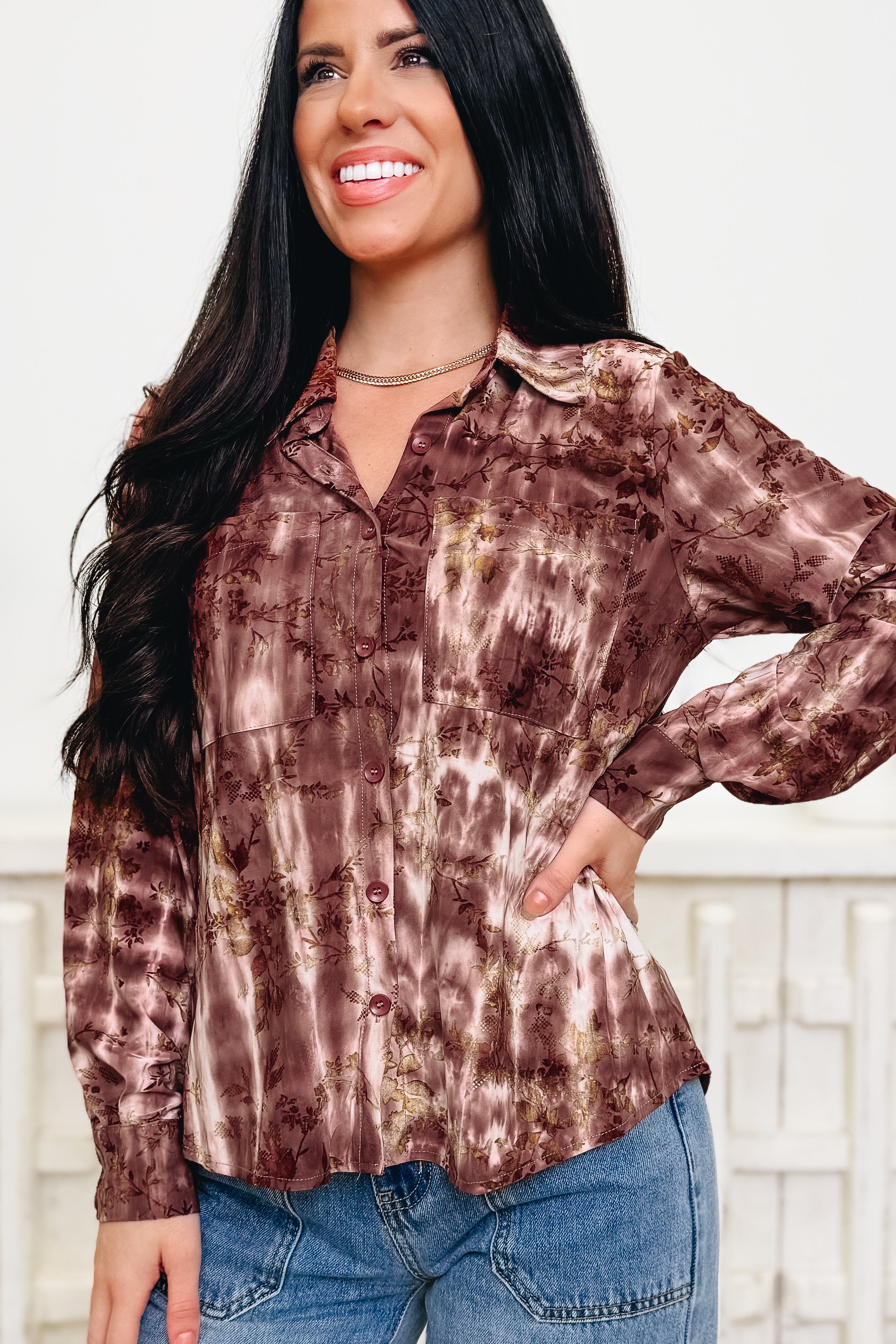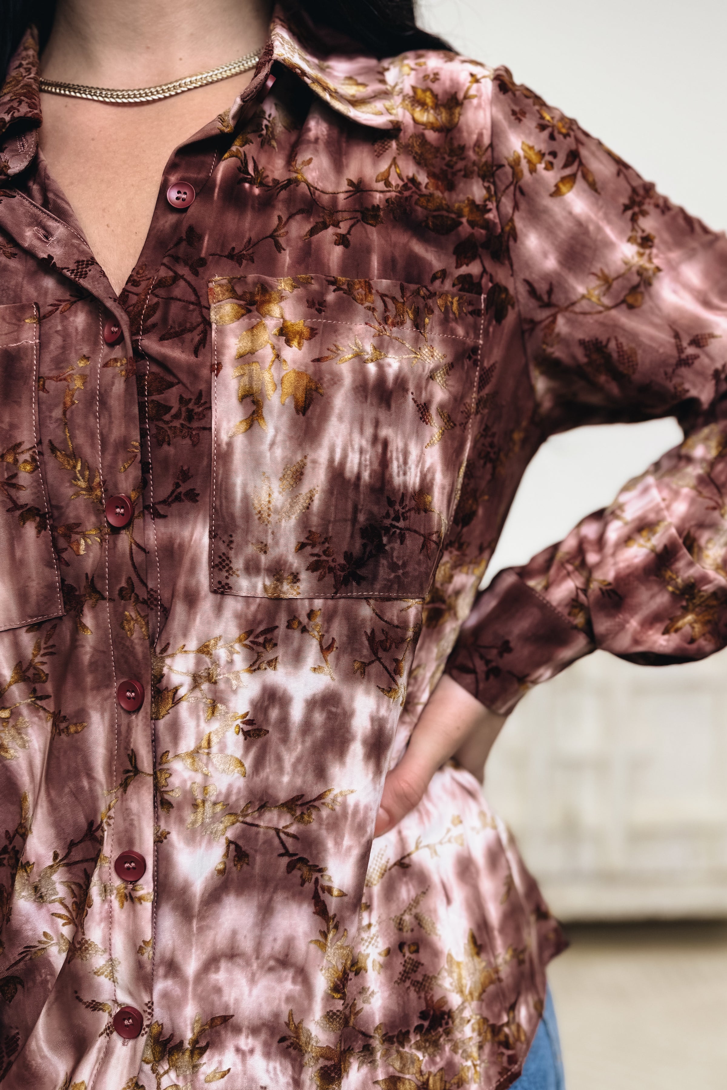 Turn heads in this stunning satin-inspired blouse! The rich blend of earthy tones and unique tie-dye pattern give it that effortlessly chic, one-of-a-kind vibe. The silky-soft fabric drapes beautifully, while the button-front and collared design add a polished touch. Dress it up with trousers or keep it casual with denim — either way, this top brings the perfect mix of classy and cool.