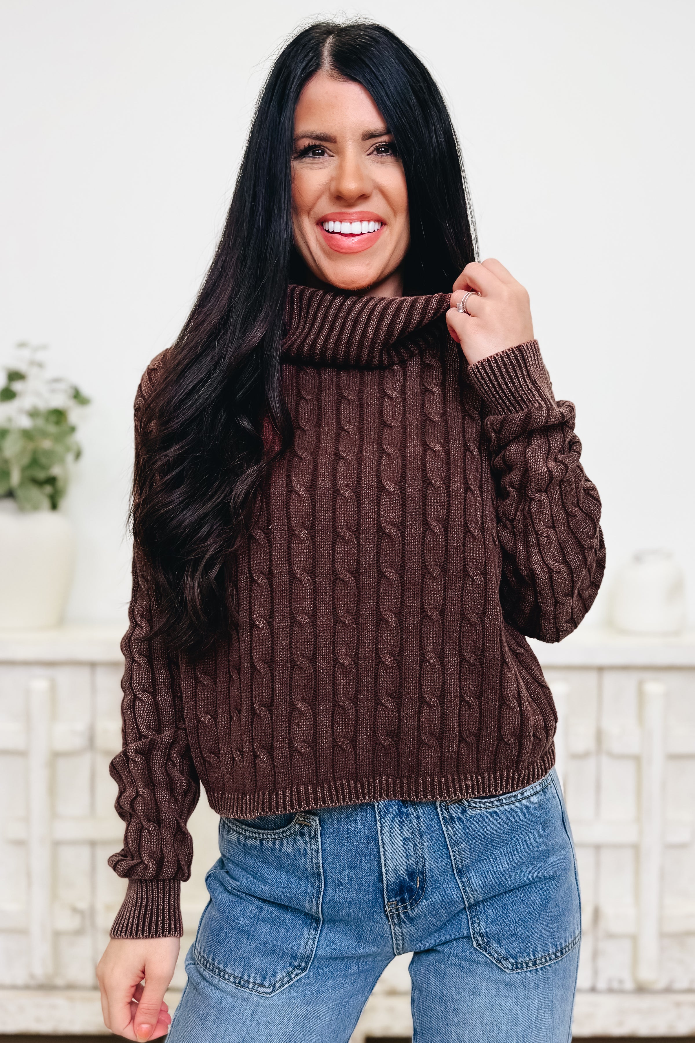 Cozy never looked so cute! This cable knit turtleneck sweater is everything you need for chilly days — soft, warm, and effortlessly stylish. The rich chocolate hue gives it that perfect fall vibe, while the chunky knit and slightly cropped fit make it super flattering. Pair it with denim, skirts, or leggings for an instant outfit that’s equal parts comfy and chic. Trust us, you’ll be reaching for this one on repeat!