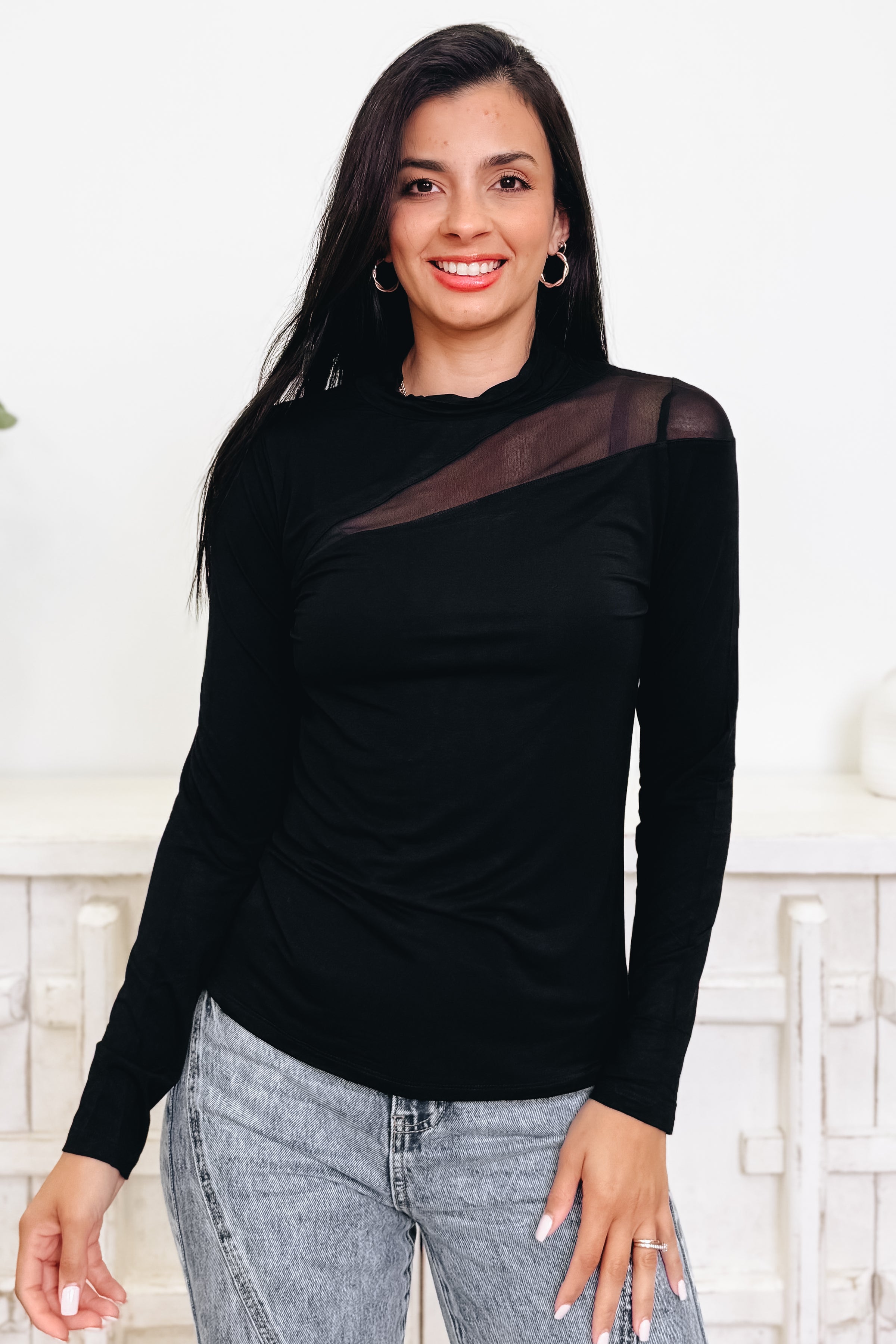 This top is giving subtle edge in the best way. With a sleek, fitted silhouette and long sleeves, it’s already a closet staple—but that diagonal mesh panel across the neckline takes it straight to main-character status. The peek of sheer detail is flirty without being too much, making it perfect for date night, girls’ night, or dressing up your favorite denim. Toss it on with jeans and heels or tuck it into a skirt and you’ve got an instant chic, all-black moment.