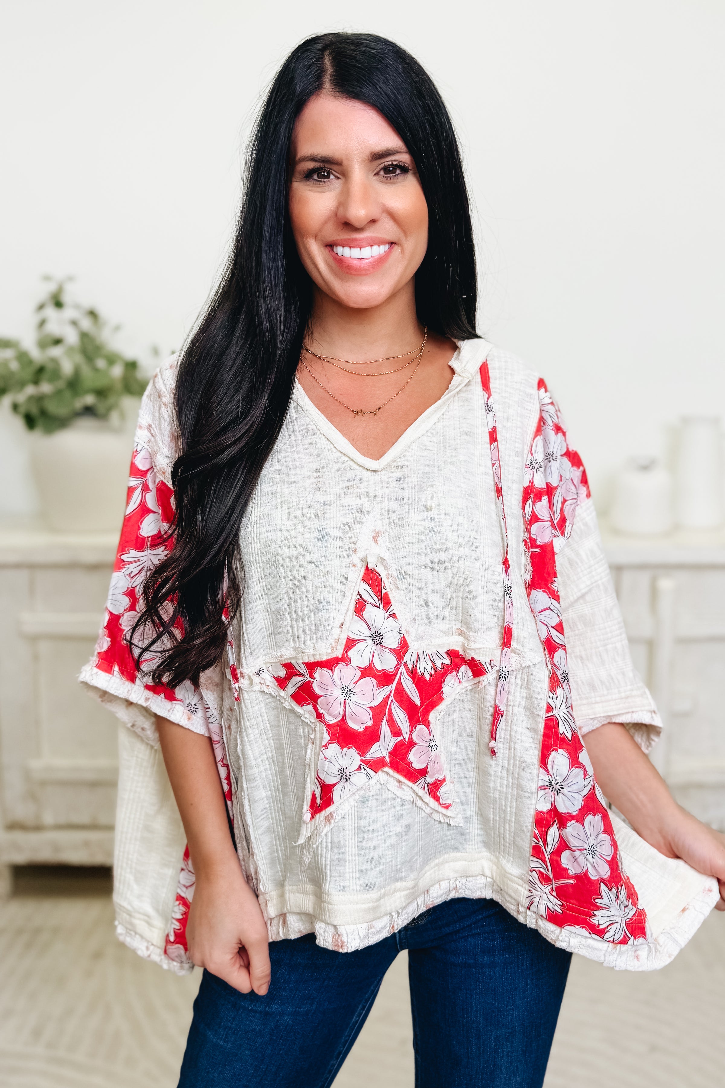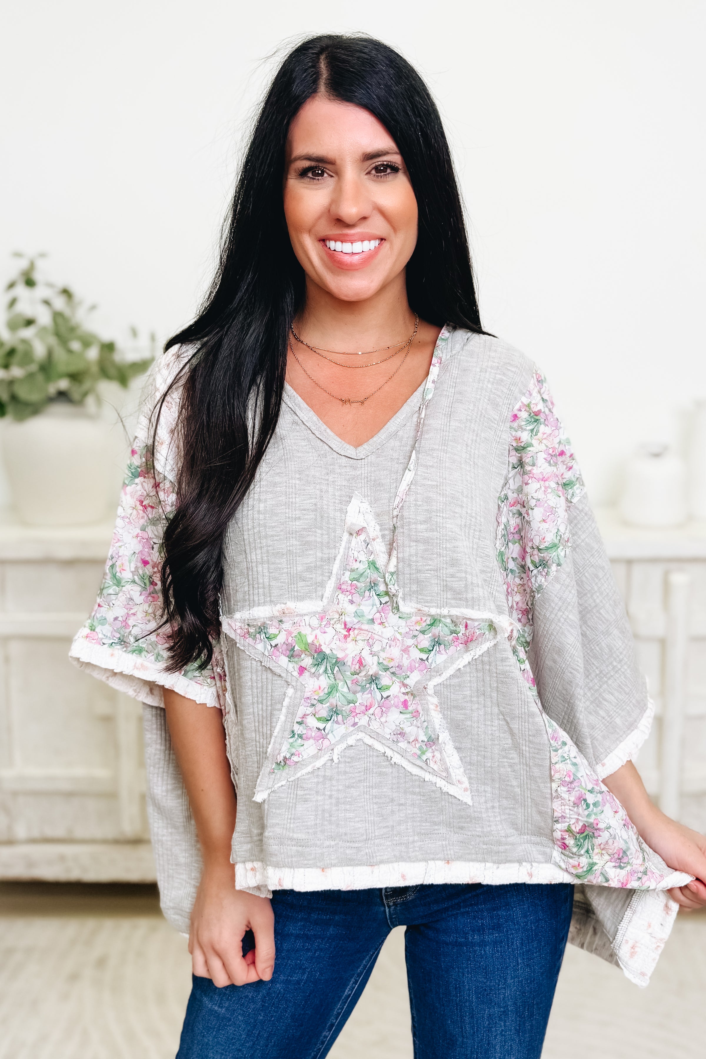 Meet your new wardrobe obsession! This boxy oversized top features an adorable sewn-on star that steals the show, paired with a gorgeous floral patchwork design that's totally unique. Adjustable functioning ties let you customize the fit to your vibe, while the relaxed silhouette keeps things effortlessly cool. Available in four stunning colors, this is the kind of piece that makes getting dressed actually fun. Cozy, quirky, and undeniably charming—your closet called, and it wants this top!