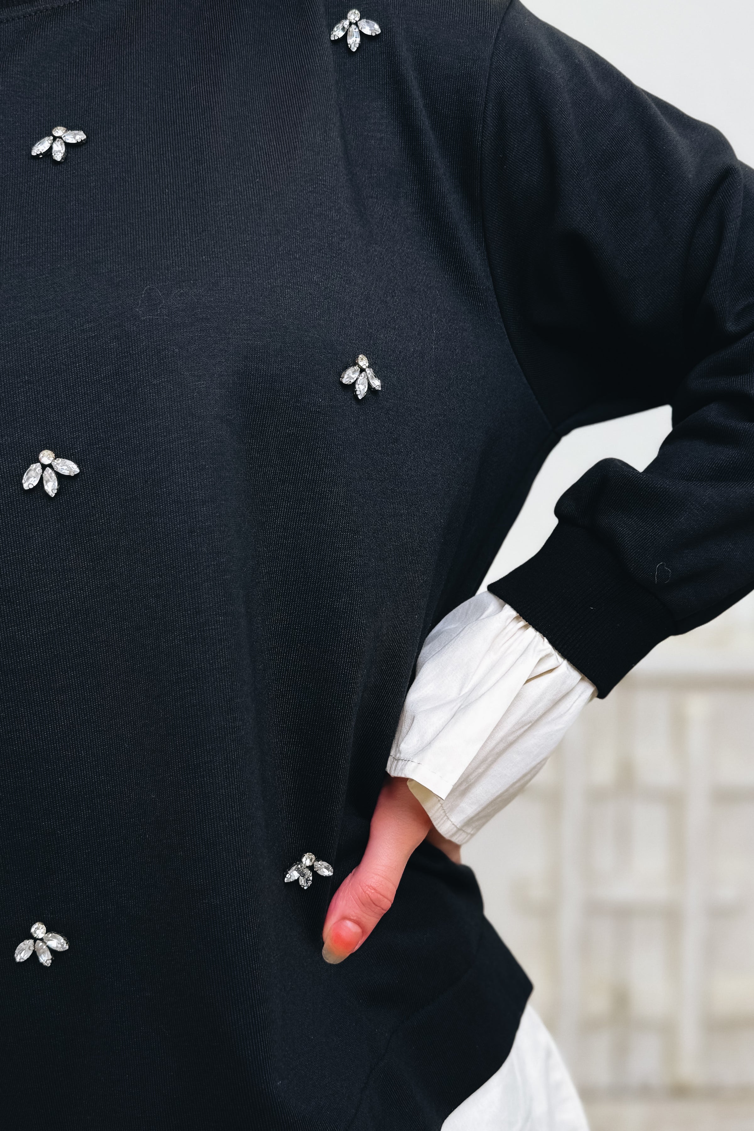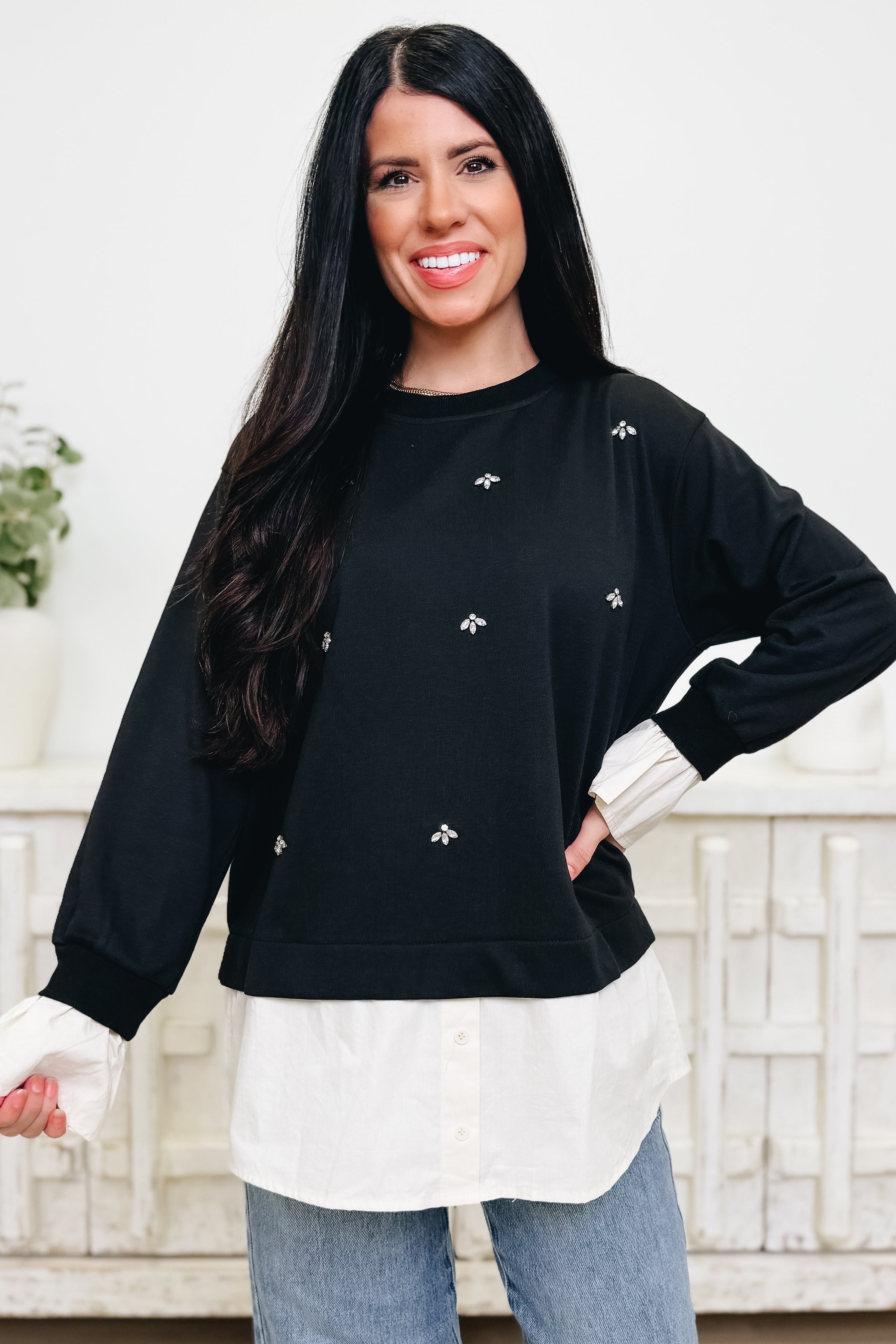 Polish meets playful in this gorgeous jeweled pullover! ✨ Featuring dainty rhinestone embellishments scattered across a soft, ribbed knit body, this sweatshirt gives your everyday look a luxe little glow-up. The layered design with a peek of crisp white shirting adds instant sophistication — think preppy chic with a glam twist.