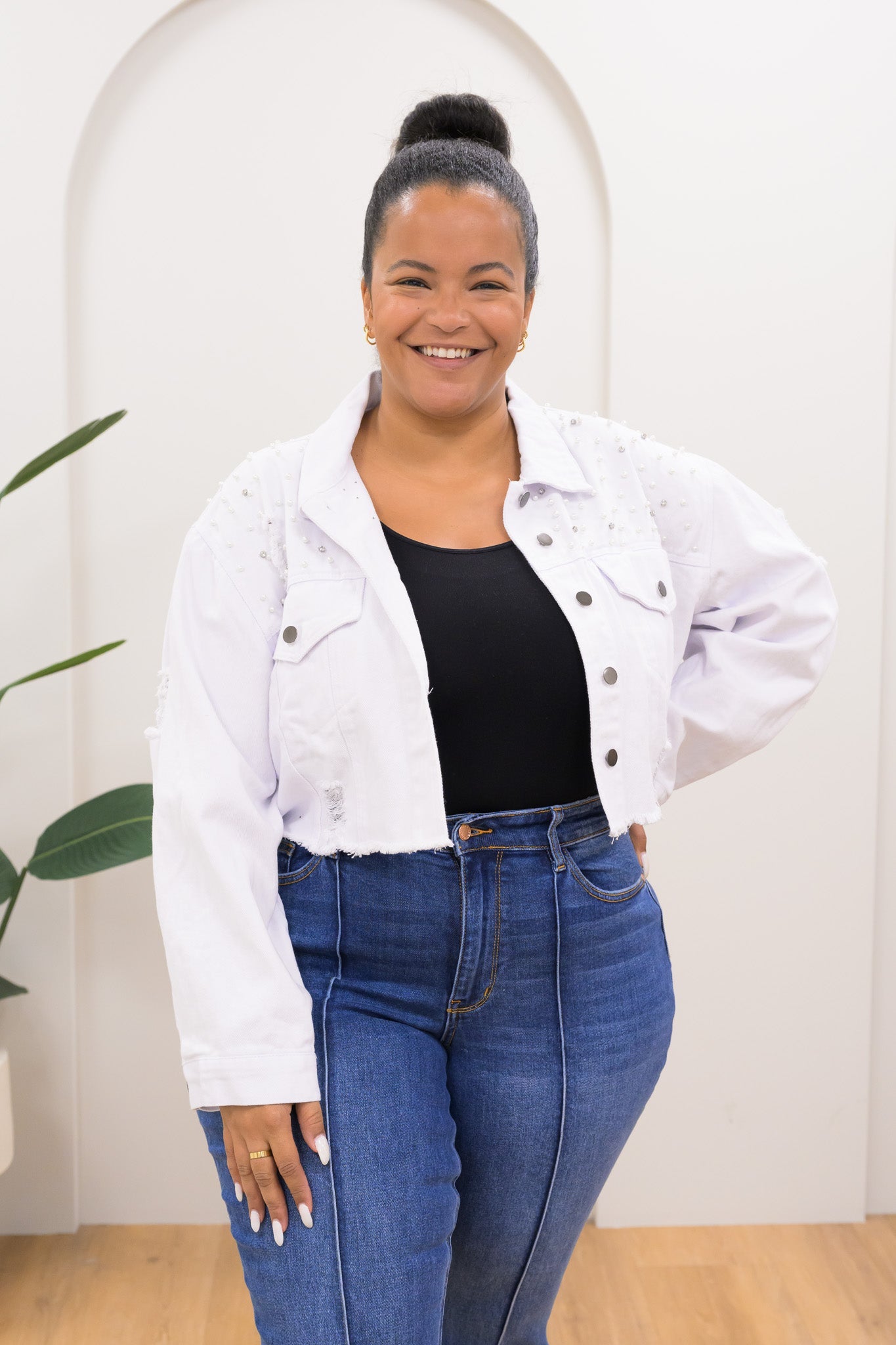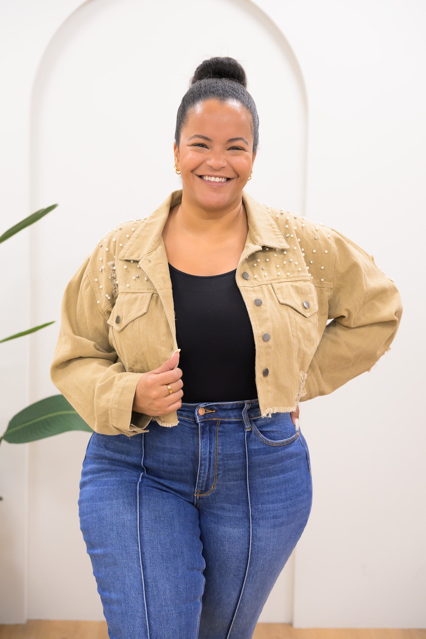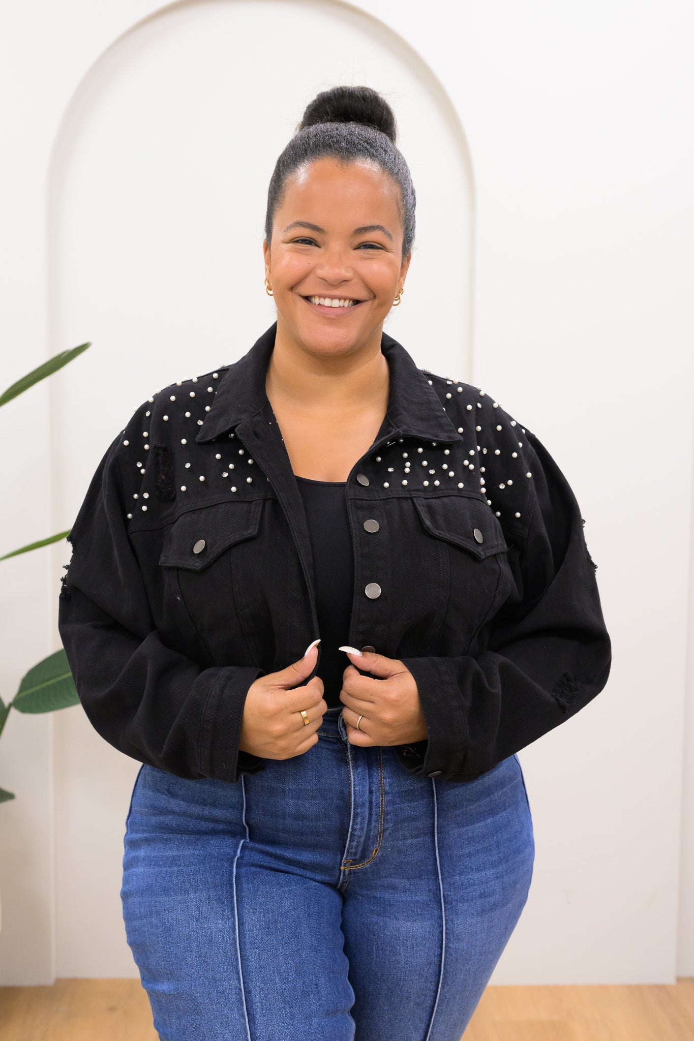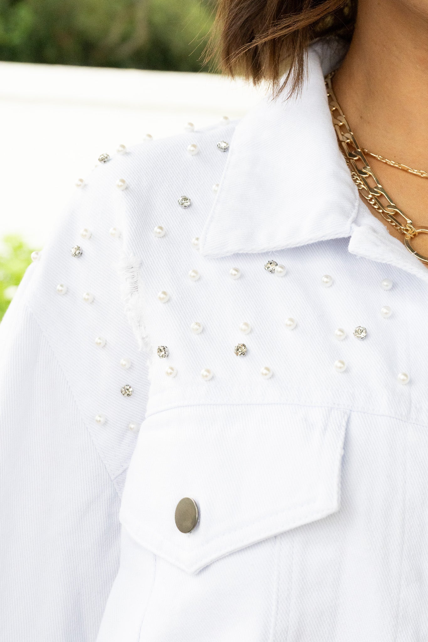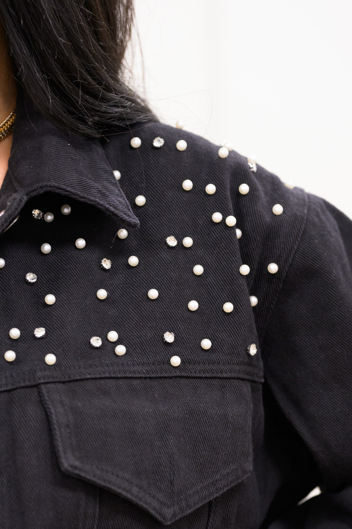 Elevate your wardrobe with the stunning BAR X POL jacket that will leave you speechless! This cropped denim jacket comes in a variety of gorgeous custom colors, making it impossible to pick just one. The intricate pearl and bling detailing on the shoulders adds a touch of glamour, while the distressed raw cut seam at the bottom gives it a trendy edge. With functional buttons and a lightweight denim material, this jacket is perfect for any season. Don't miss out on this must-have piece that will instantly elevate any outfit!