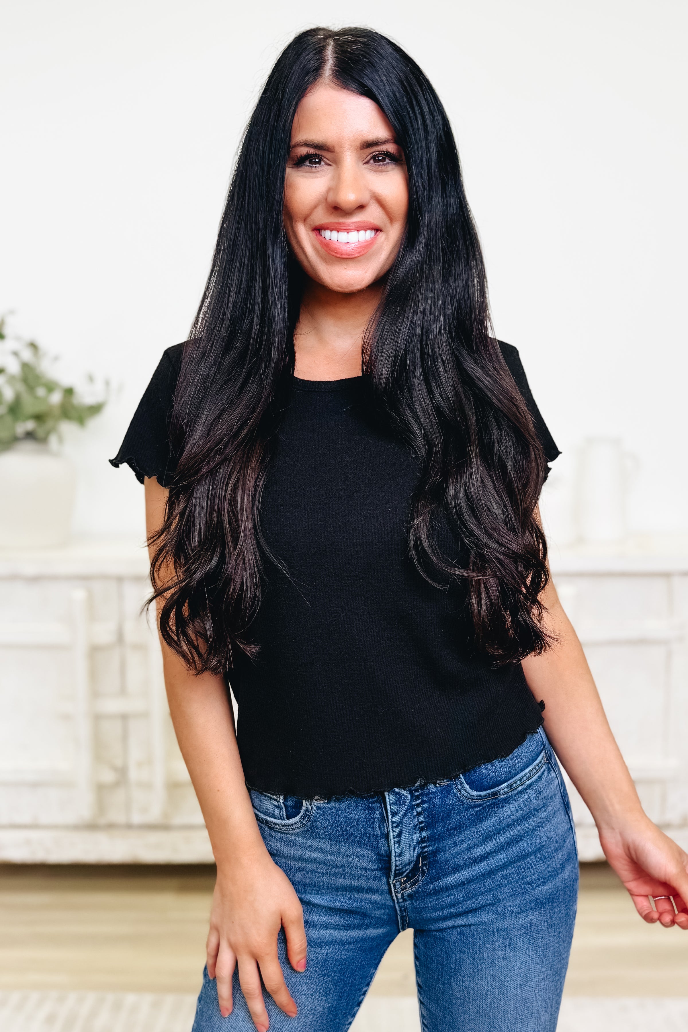 This is the ultimate everyday top—and it’s absolute perfection! Crafted from super soft and stretchy fabric, it features the most flattering long cropped length and the cutest ribbed texture. The delicate lettuce hem adds just the right touch of charm, while the dreamy colors make it easy to pair with everything in your closet. Whether you're dressing it up or keeping it casual, this top is your new go-to. We’re completely obsessed!