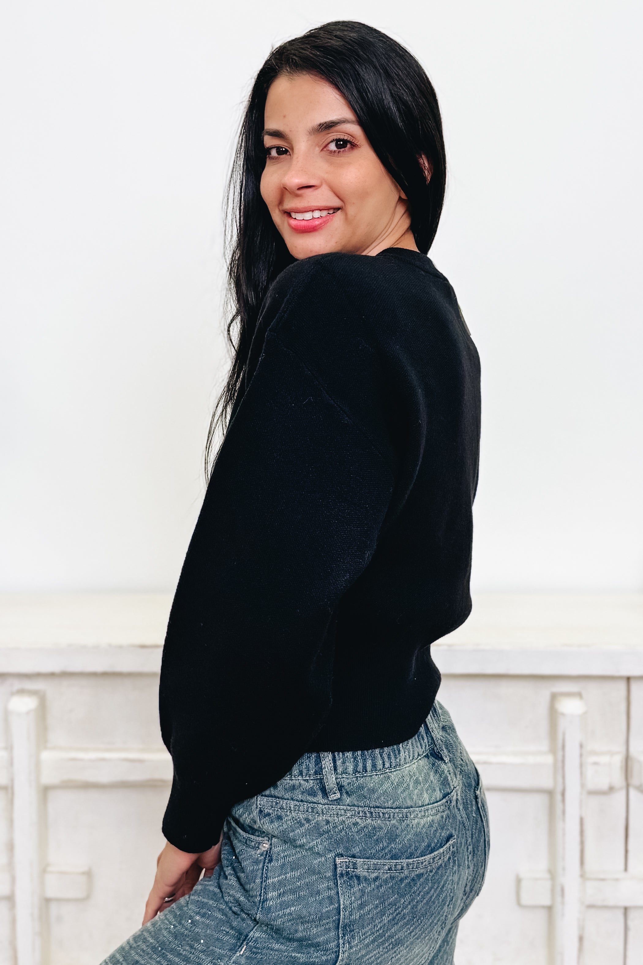 Turn heads and break hearts in the sassiest little cardigan of the season! This black cutie comes decked out with bold gold rose buttons that scream main character energy. It’s cozy, chic, and just the right amount of extra — basically everything your wardrobe’s been begging for.mDress it down with denim for a cute coffee run or glam it up with leather pants for a night out. Either way, those statement buttons are doing all the flirting for you.
