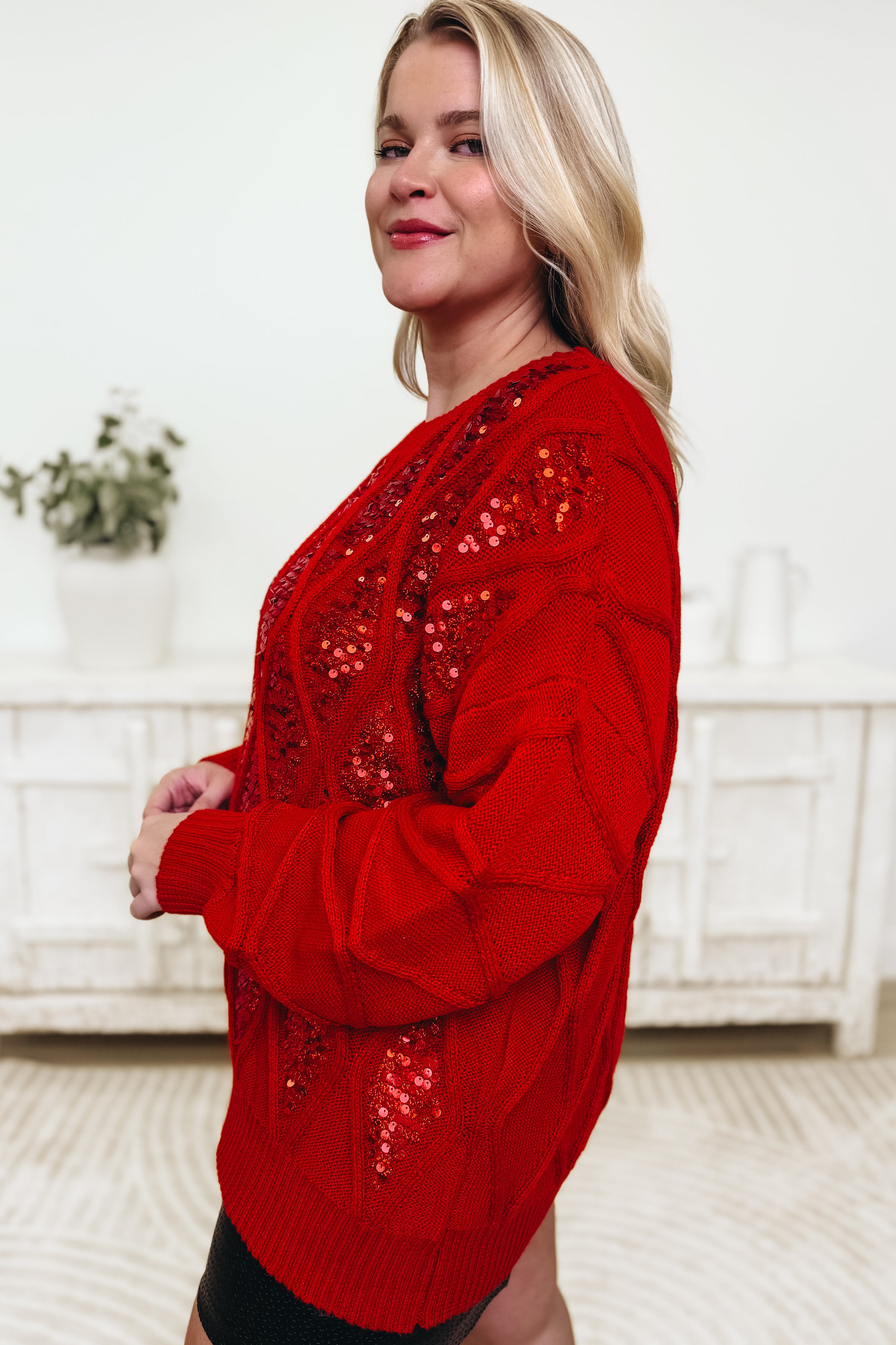 Make spirits extra bright in this dazzling holiday must-have. This sweater features a cozy knit base with a bold red hue and shimmering sequin detailing that catches every light (and every compliment). The relaxed fit keeps things comfy while the glam texture makes it perfect for holiday parties, date nights, or anytime you want to shine a little brighter.