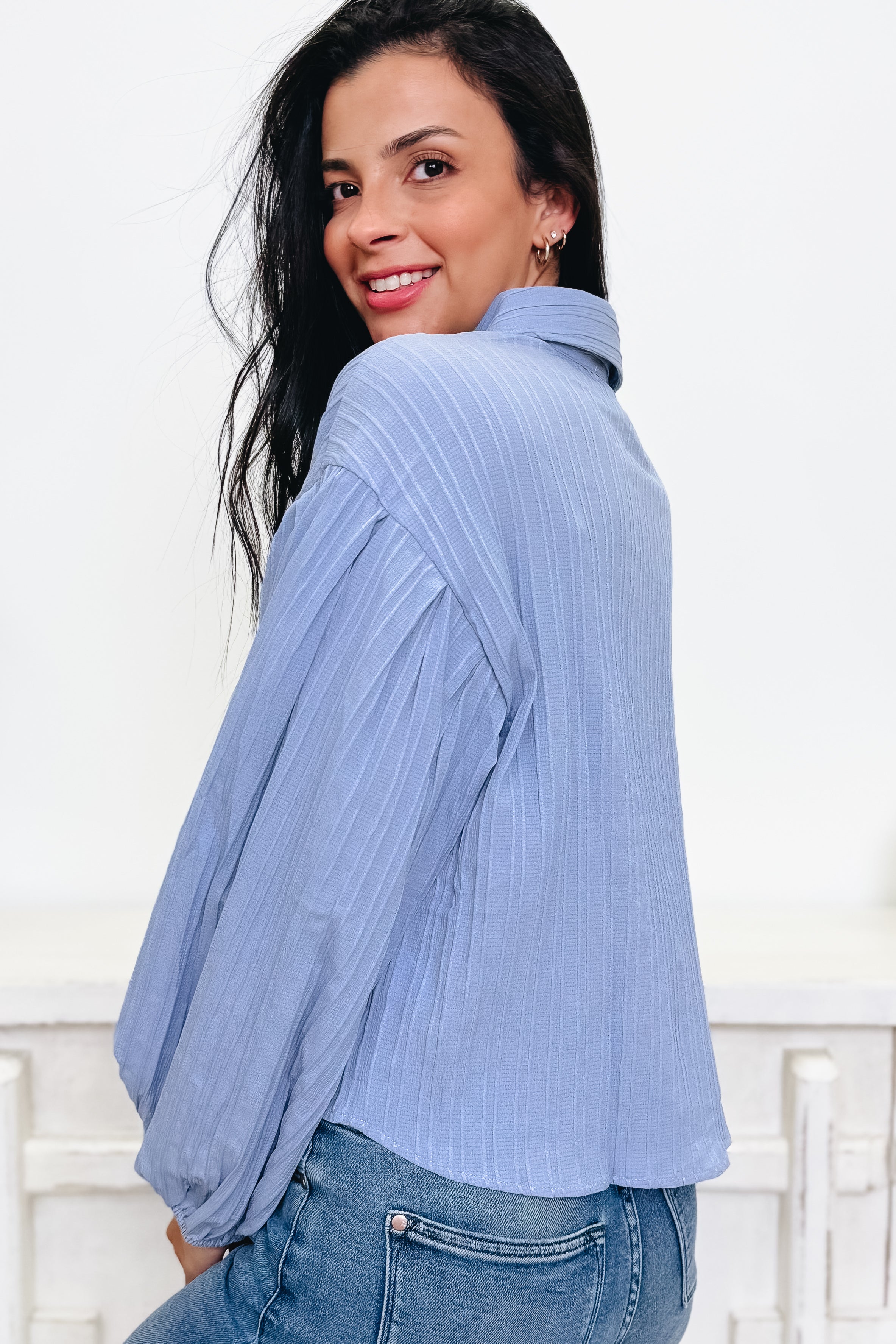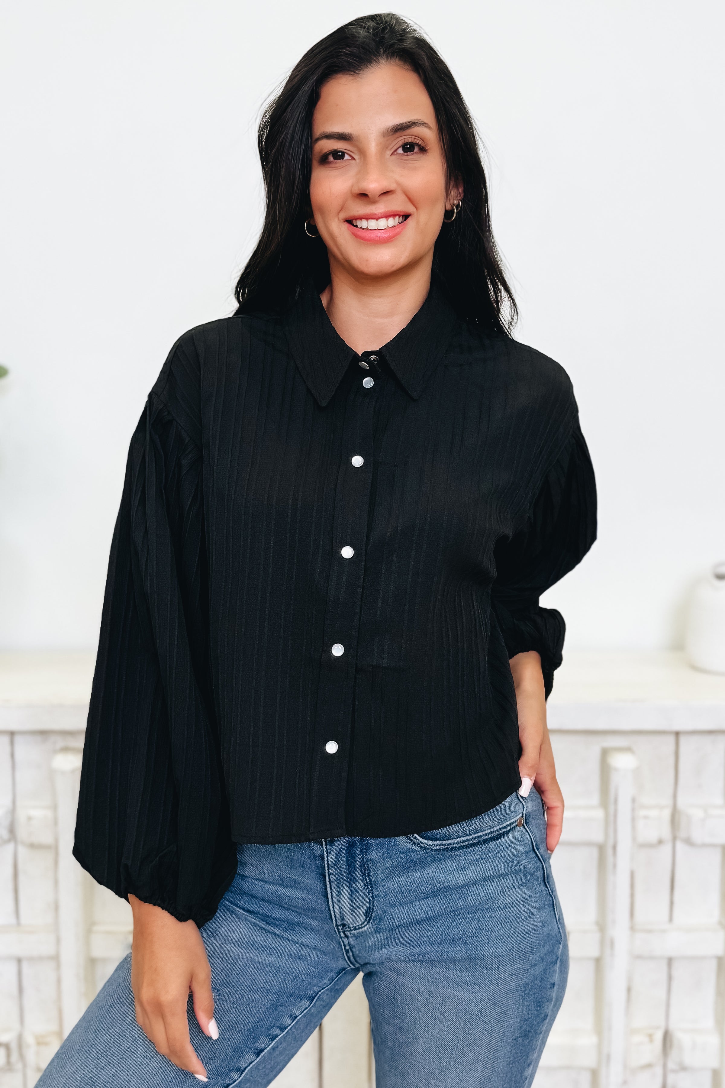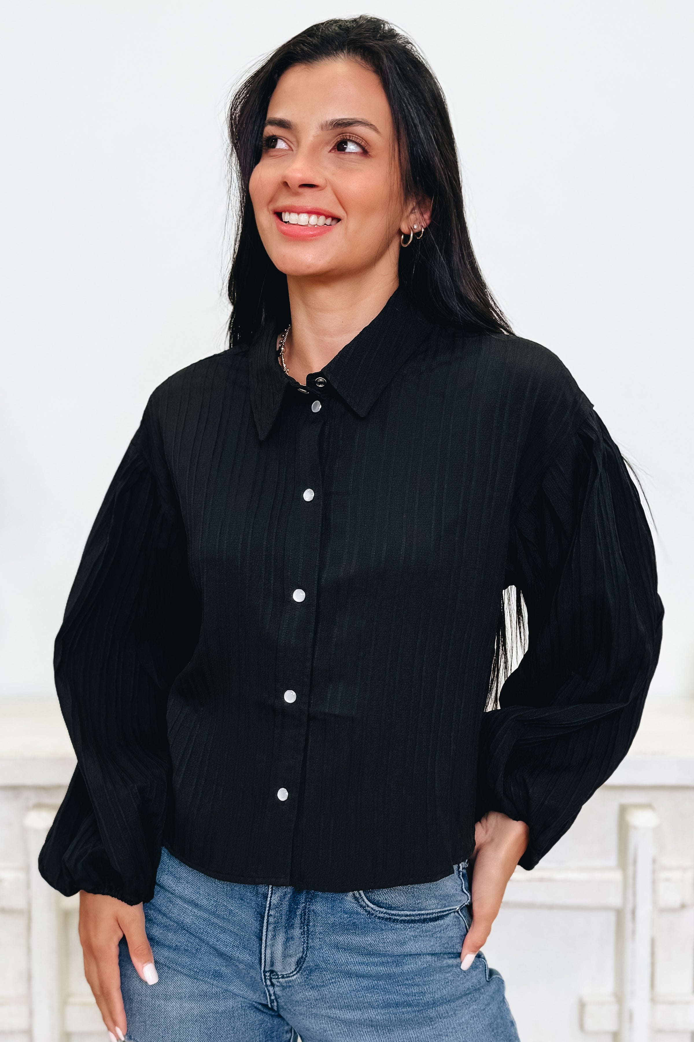 Say hello to your new favorite statement blouse! This black pleated button-down brings timeless sophistication with a fun, flirty twist. The flowy balloon sleeves and soft pleated texture give it that extra touch of elegance — perfect for dressing up denim or pairing with tailored pants. From workdays to weekends, this top is all about chic made easy.
