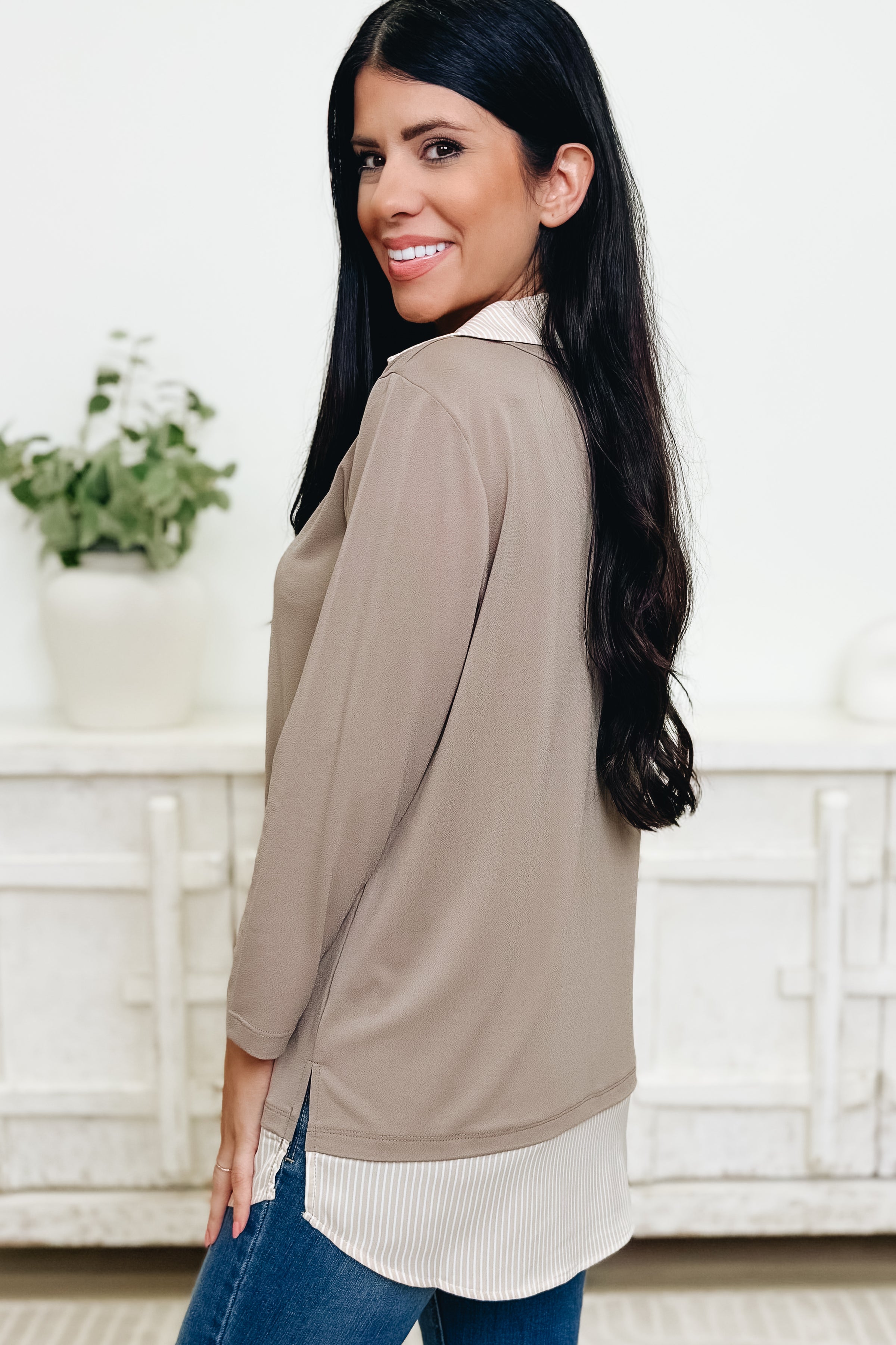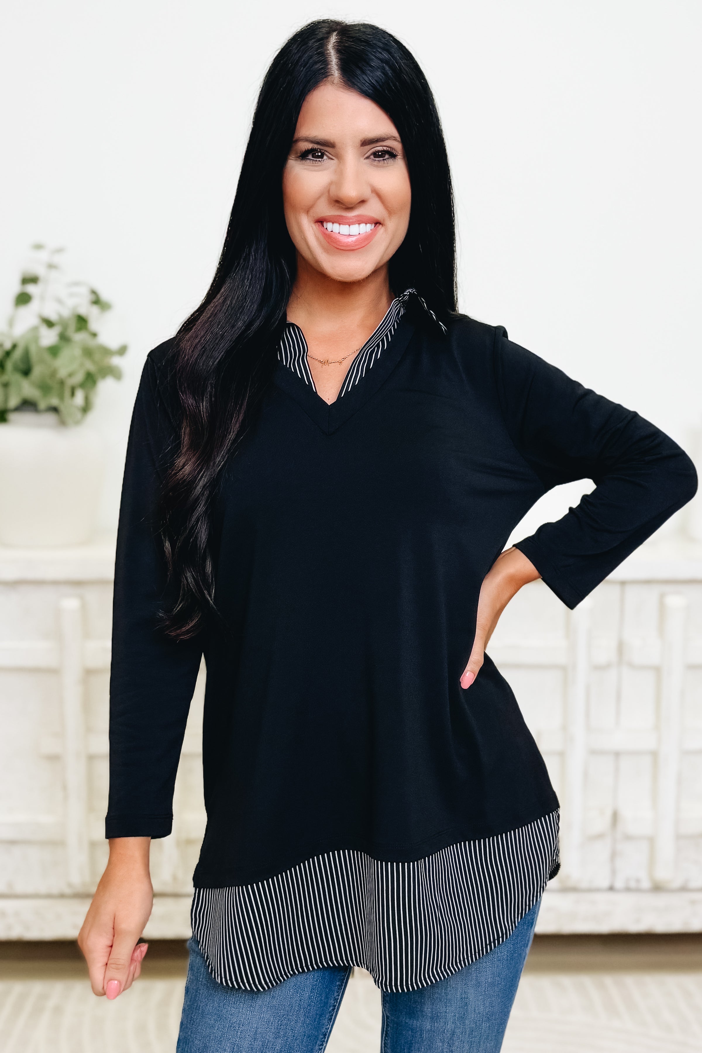 Effortlessly classy with a hint of edge — this top does all the work for you! Featuring a layered look with a collared neckline and striped contrast hem, it gives you that put-together vibe without any fuss. The soft, stretchy fabric keeps it comfy while the longer length makes it perfect for pairing with denim or leggings. From workdays to weekends, this one’s a total winner!