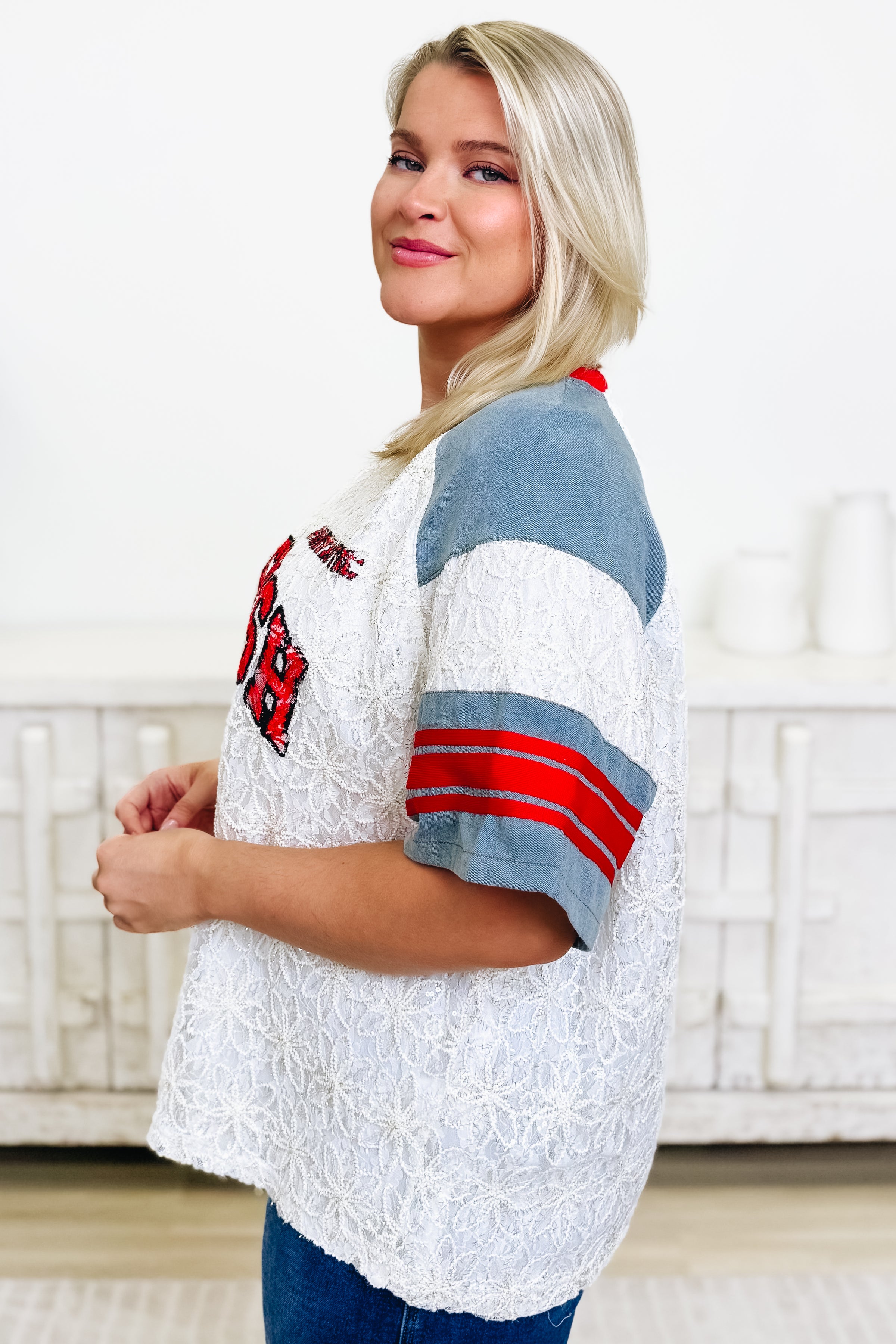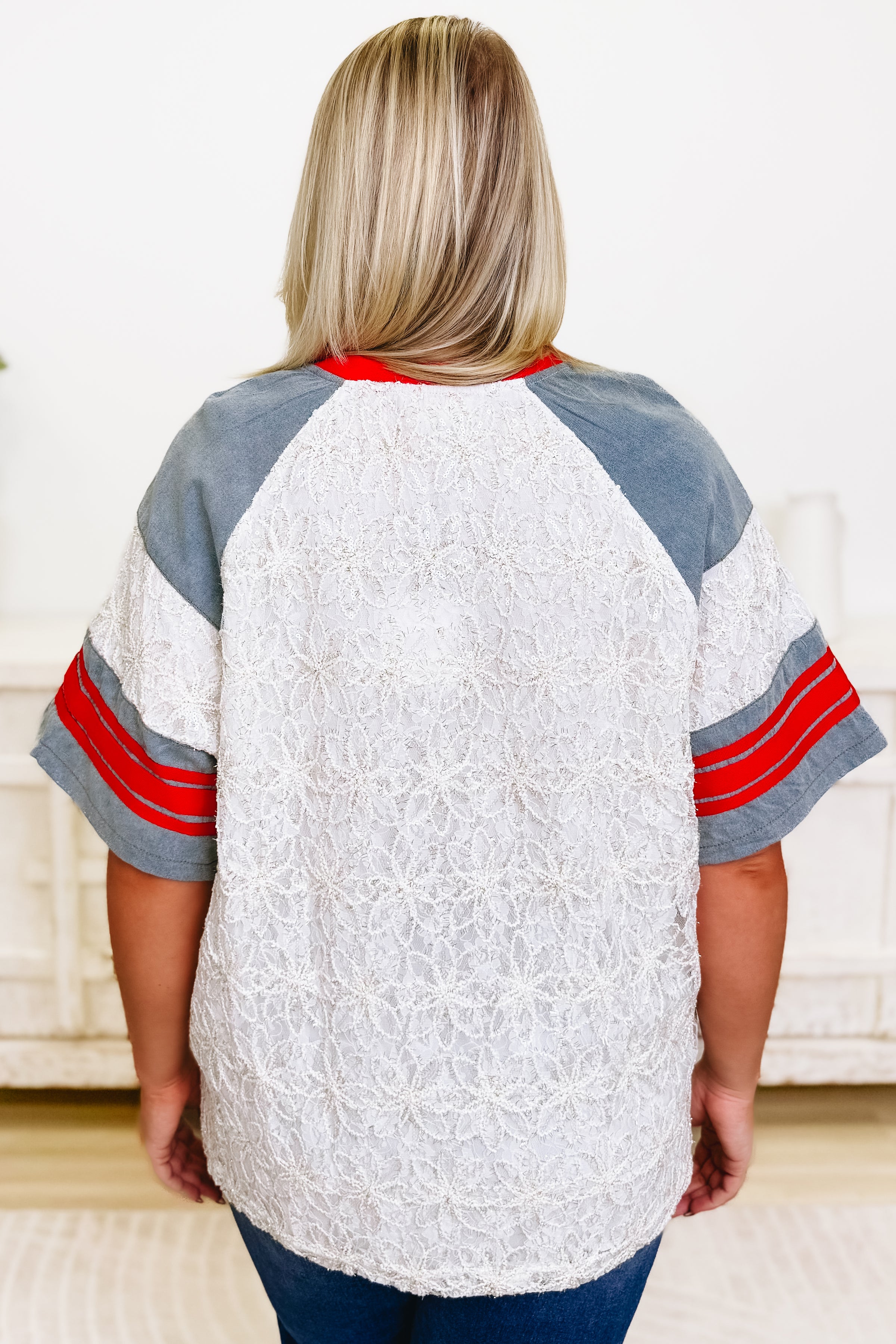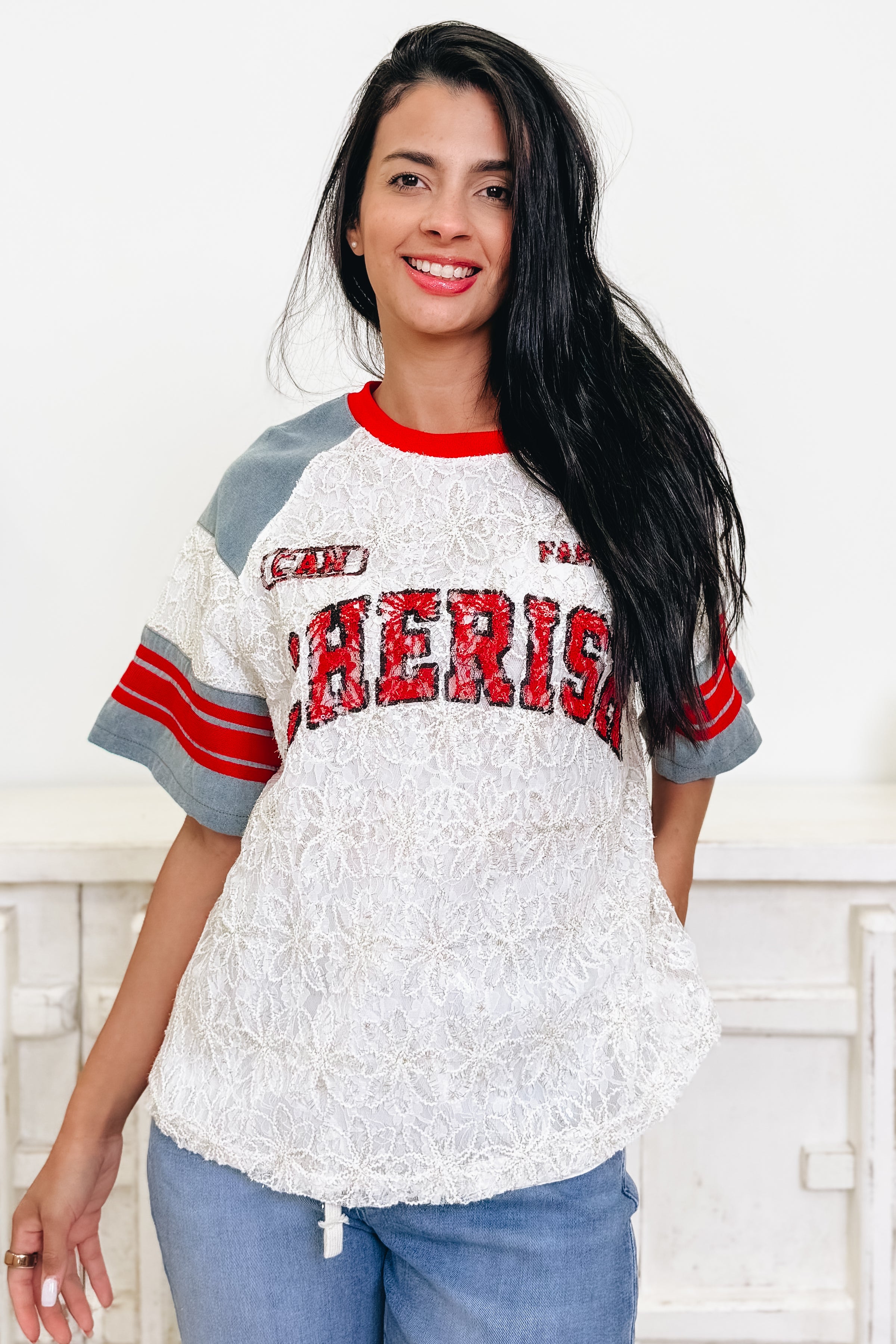Meet your new favorite top! The Cherish The Moment Top is a lace baseball tee that's equal parts sporty and sweet. With "CHERISH" proudly displayed across the chest, this beauty combines delicate lace with a relaxed athletic silhouette. The ultra-soft, stretchy fabric moves with you while delivering the coverage you're looking for—no awkward gaps, just pure comfort. Dress it down with jeans or layer it over a slip for extra edge. Honestly? We're head over heels for this one, and we know you will be too!