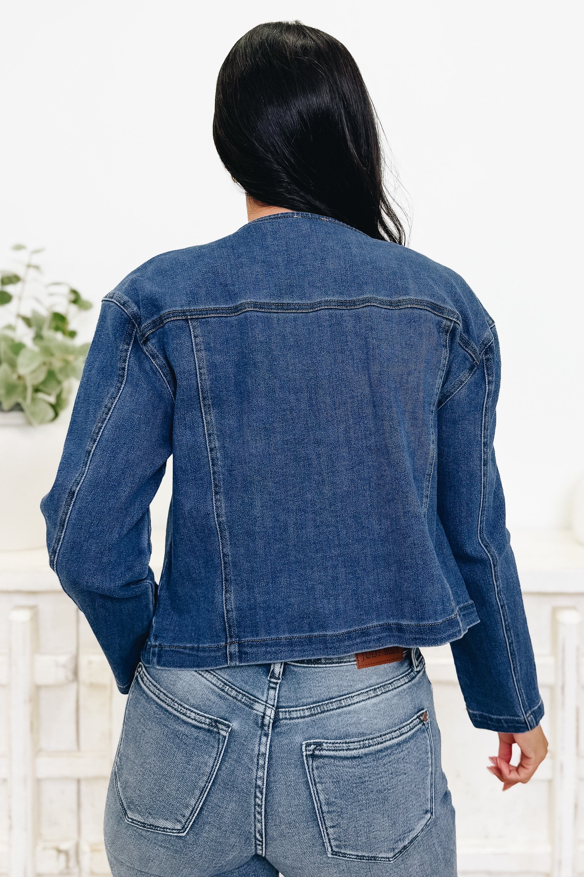 This is the ultimate denim jacket! Chic and effortlessly cool, it features functioning buttons, a sleek no-collar design, and the perfect wash for everyday wear. Stylish, versatile, and totally on-trend—we are completely OBSESSED!
