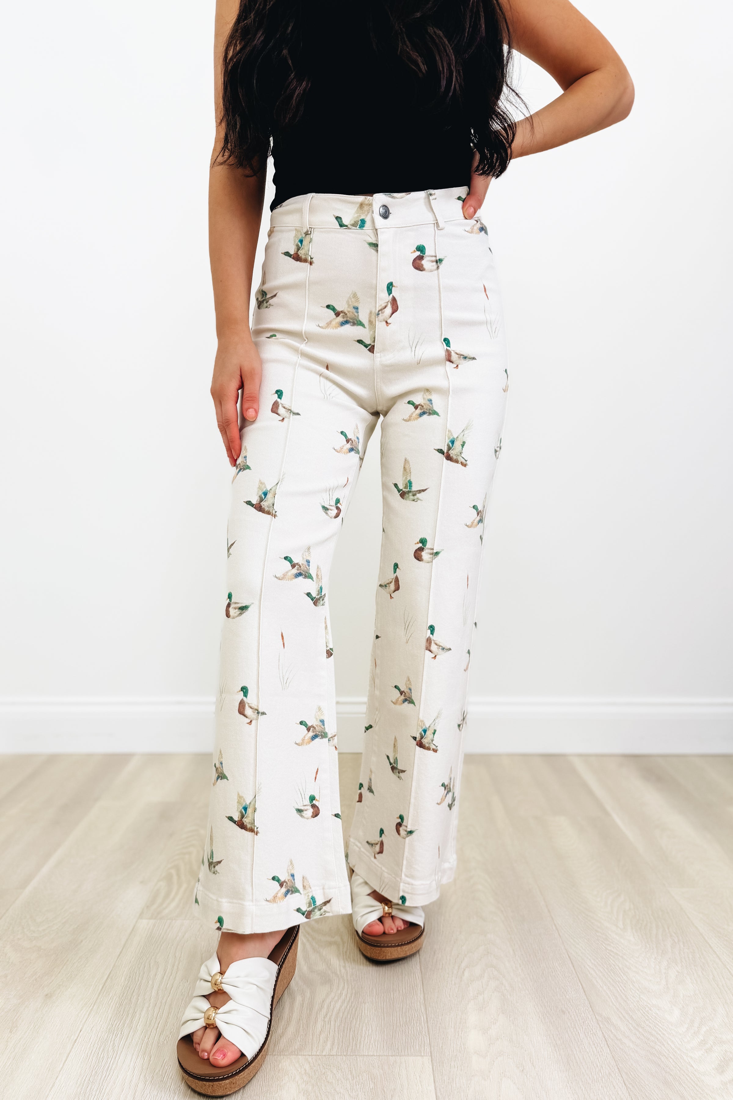 Say hello to the Duck Duck Groove Mallard Denim Wide Leg Pants—where playful style meets everyday comfort! These ivory beauties feature the most adorable mallard duck print that's totally unique and impossible to ignore. Made from super soft, stretchy denim that moves with you, they're designed for all-day wear without the all-day discomfort. The sleek single-button zip fly keeps things streamlined while the wide-leg silhouette gives major fashion-forward vibes. The gorgeous ivory coloring is the perfect canvas for those charming ducks. Get ready to turn heads and spread smiles wherever you go!