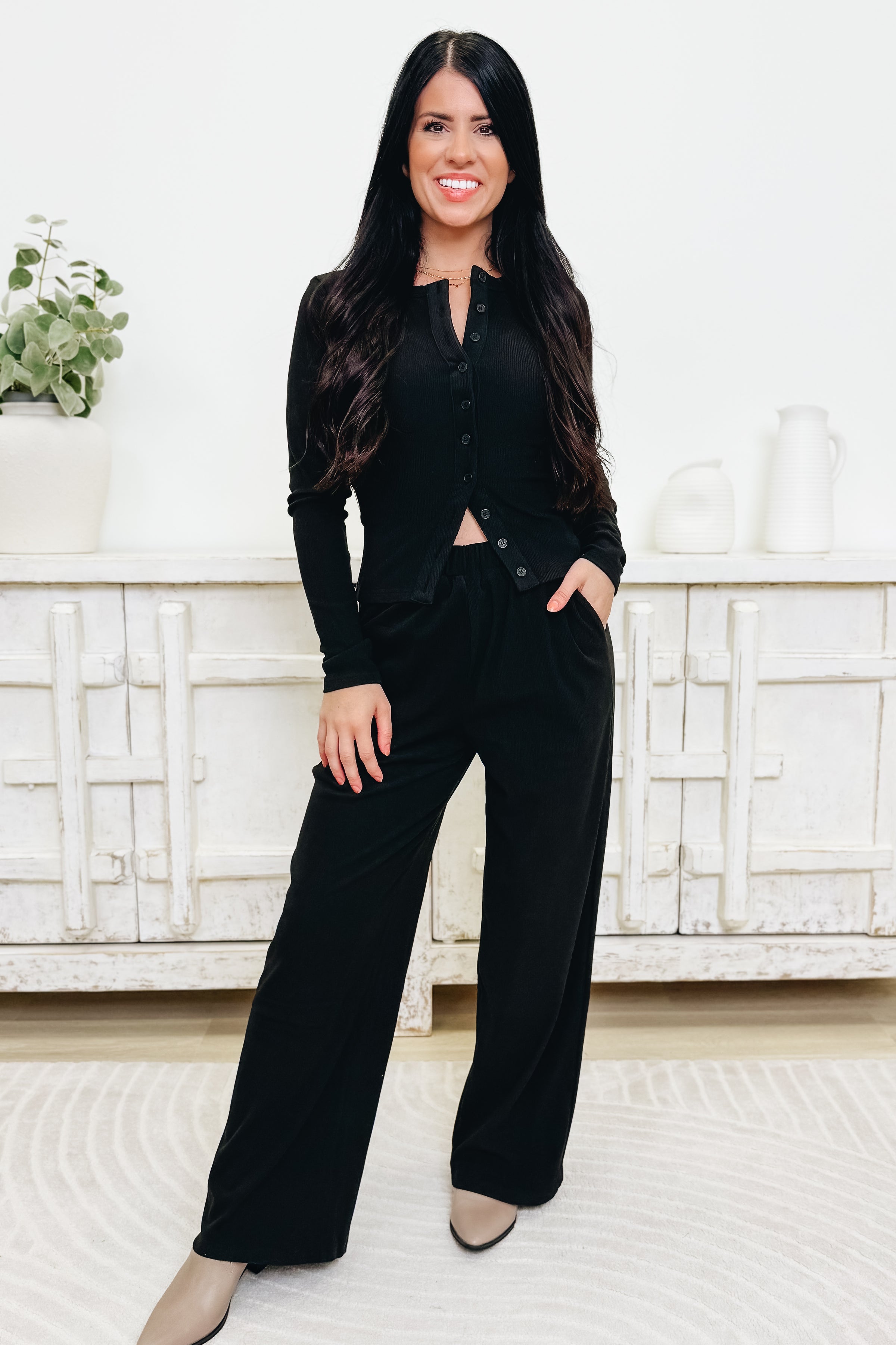 This pants set is next-level perfection! Super soft and flowing, the top features functional buttons and pairs effortlessly with your favorite bottoms. The wide-leg pants are flattering and comfy, making this set both chic and cozy. Cute, versatile, and totally obsession-worthy—we are completely in love!