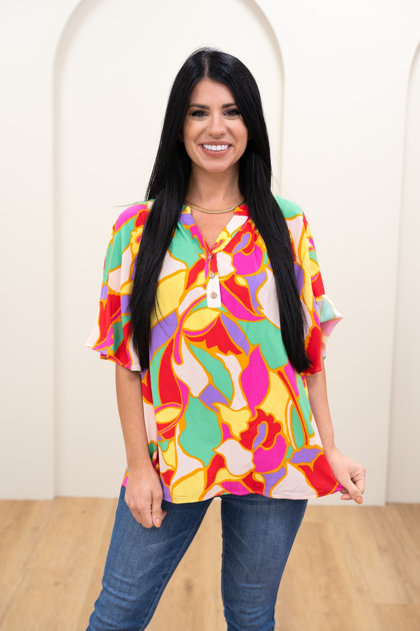 This stunning top features a vibrant color palette and a playful print, making it a truly beautiful piece. The flowy design adds a touch of elegance and movement to the garment, perfect for any occasion.