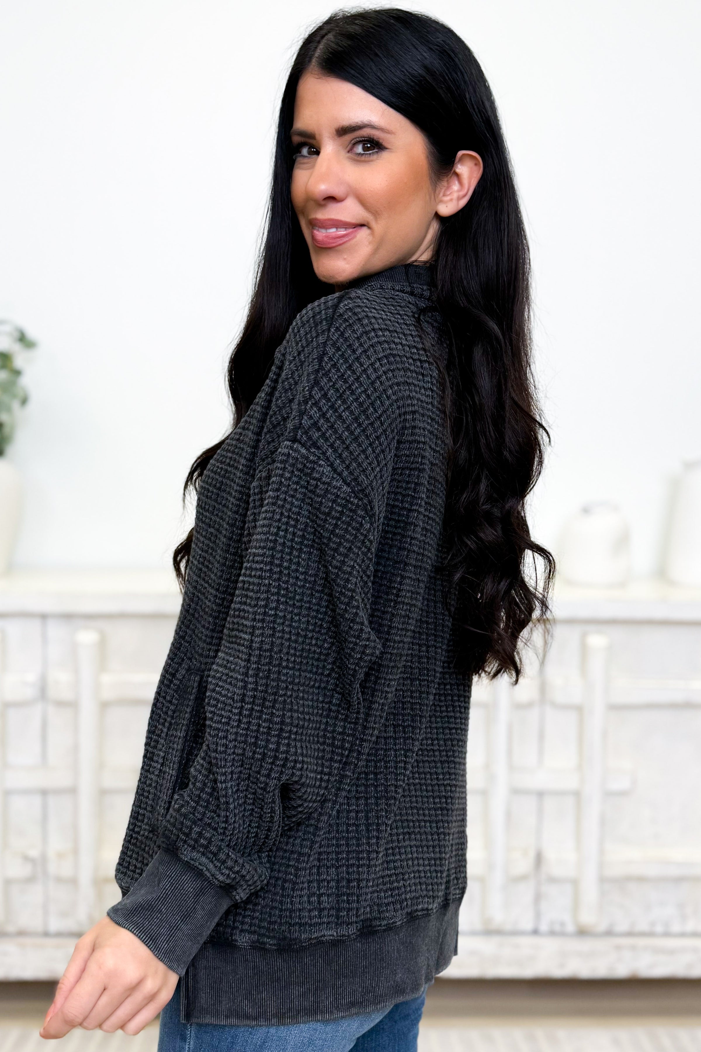 This waffle-knit top is that effortless, cozy staple you’ll reach for nonstop. It features a relaxed, easy fit with a soft textured feel that’s lightweight but still warm enough for layering, plus a cute split neckline and collar detail that instantly makes it feel a little more polished than your average pullover. The cuffed sleeves and ribbed hem add a comfy, lived-in vibe, and the longer length gives you great coverage for leggings or your favorite denim. Dress it up with boots and a necklace or keep it casual with sneakers — either way, it’s an everyday winner you’ll love wearing on repeat.