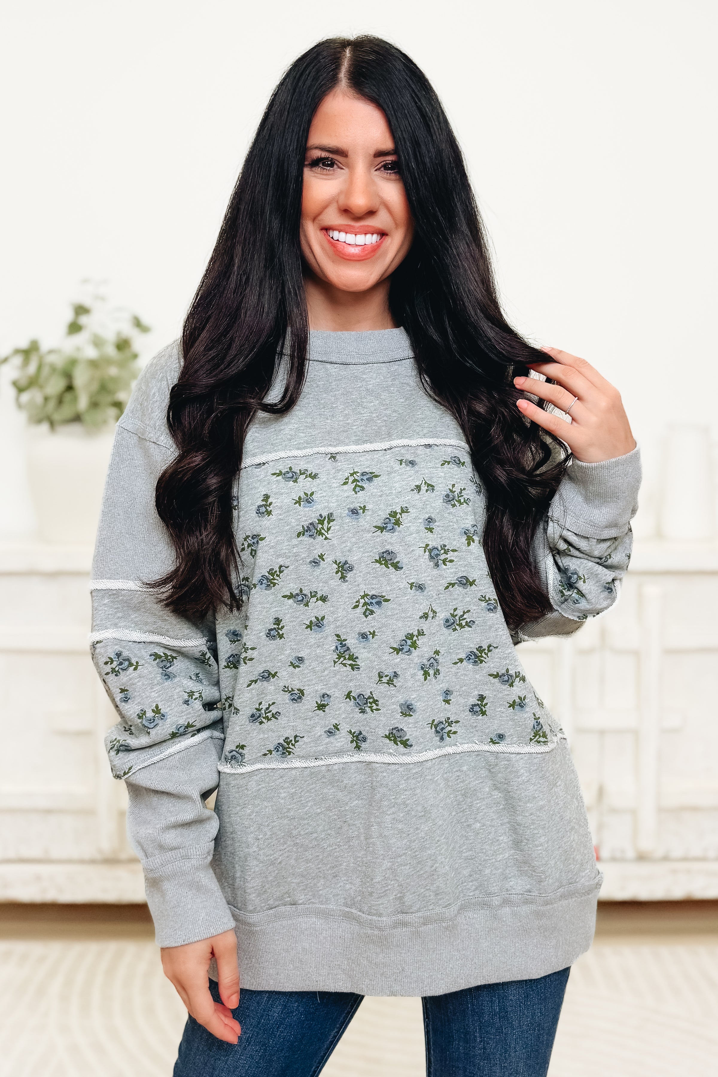 This sweatshirt is giving cozy girl meets girly girl and we are obsessed. The body is a soft sweatshirt knit, dressed up with the sweetest floral panels through the front and sleeves for that subtle pop of pretty. Exposed seam details and mixed textures make it look boutique and special, while the relaxed fit, drop shoulders, and longer tunic length keep it comfy enough for couch days and coffee runs. The ribbed neckline, cuffs, and hem give it that classic sweatshirt feel, and the floral print keeps it feeling fresh and feminine. Pair with your favorite denim and sneakers or throw it on with leggings and boots—either way, you’re comfy, cute, and ready to go.