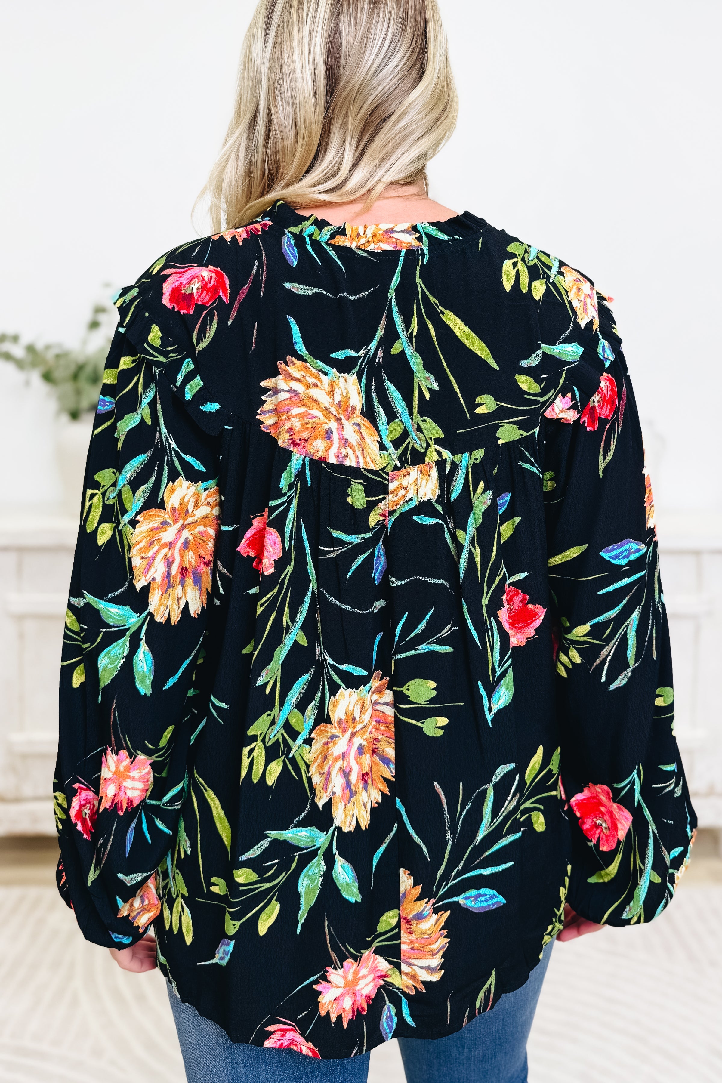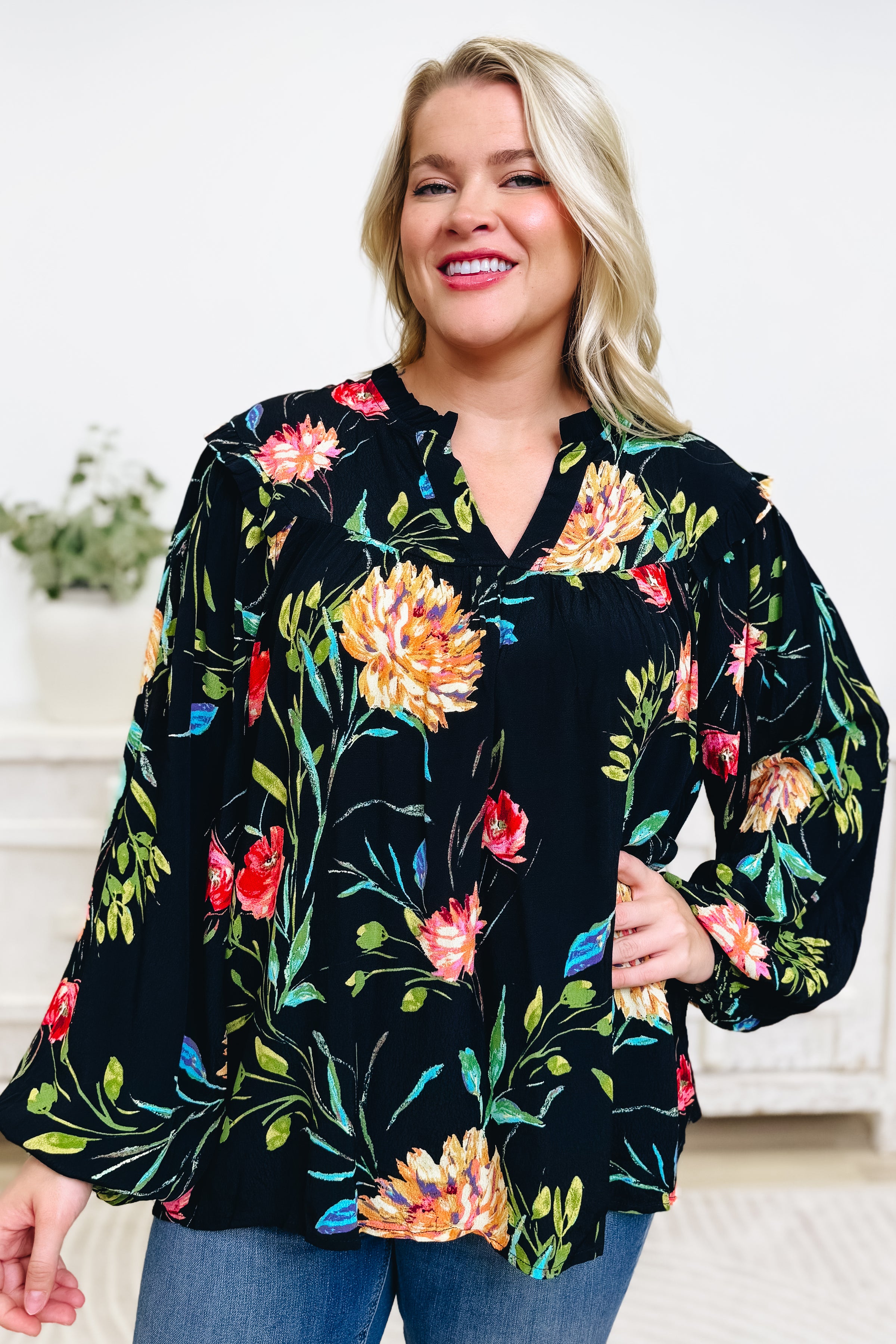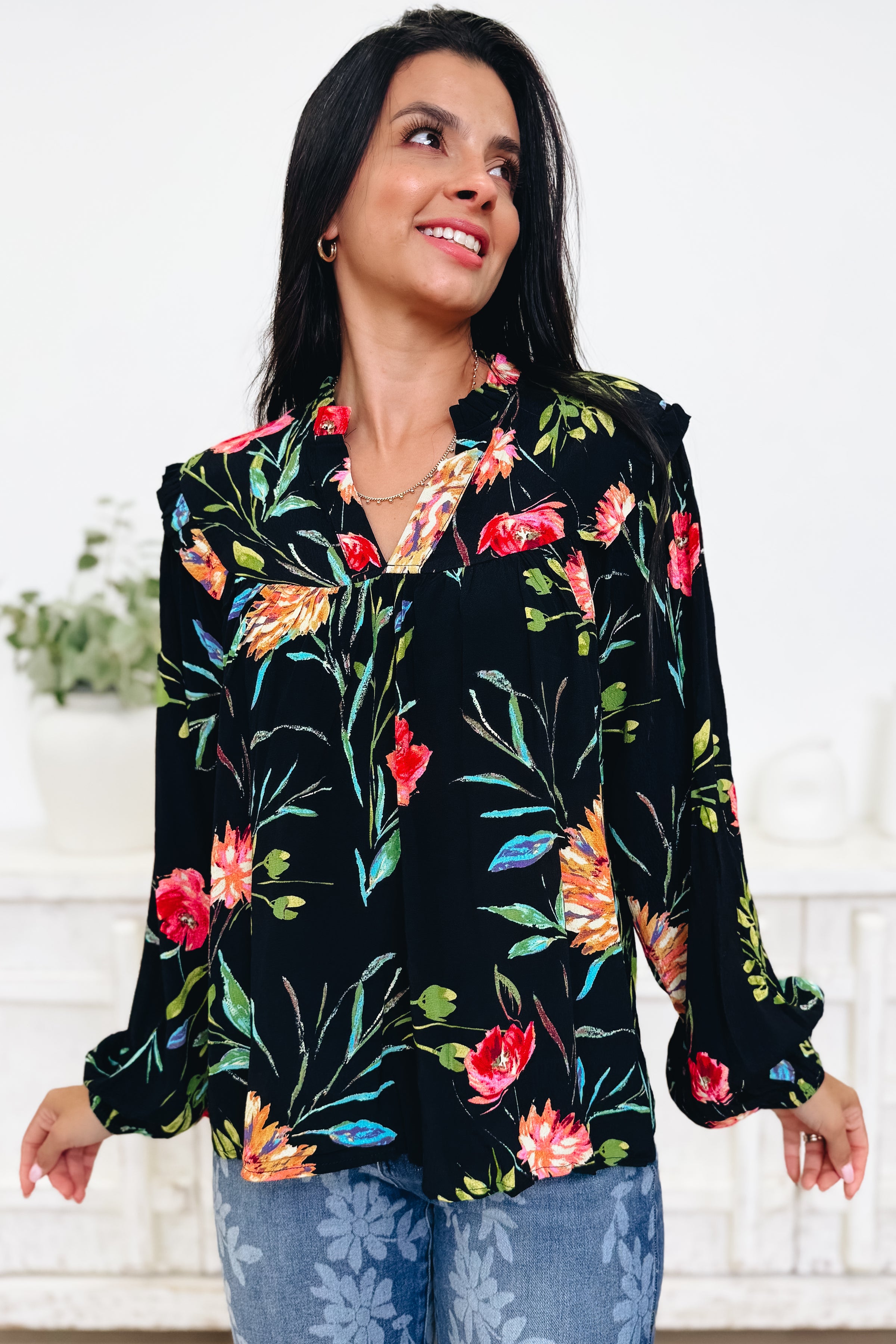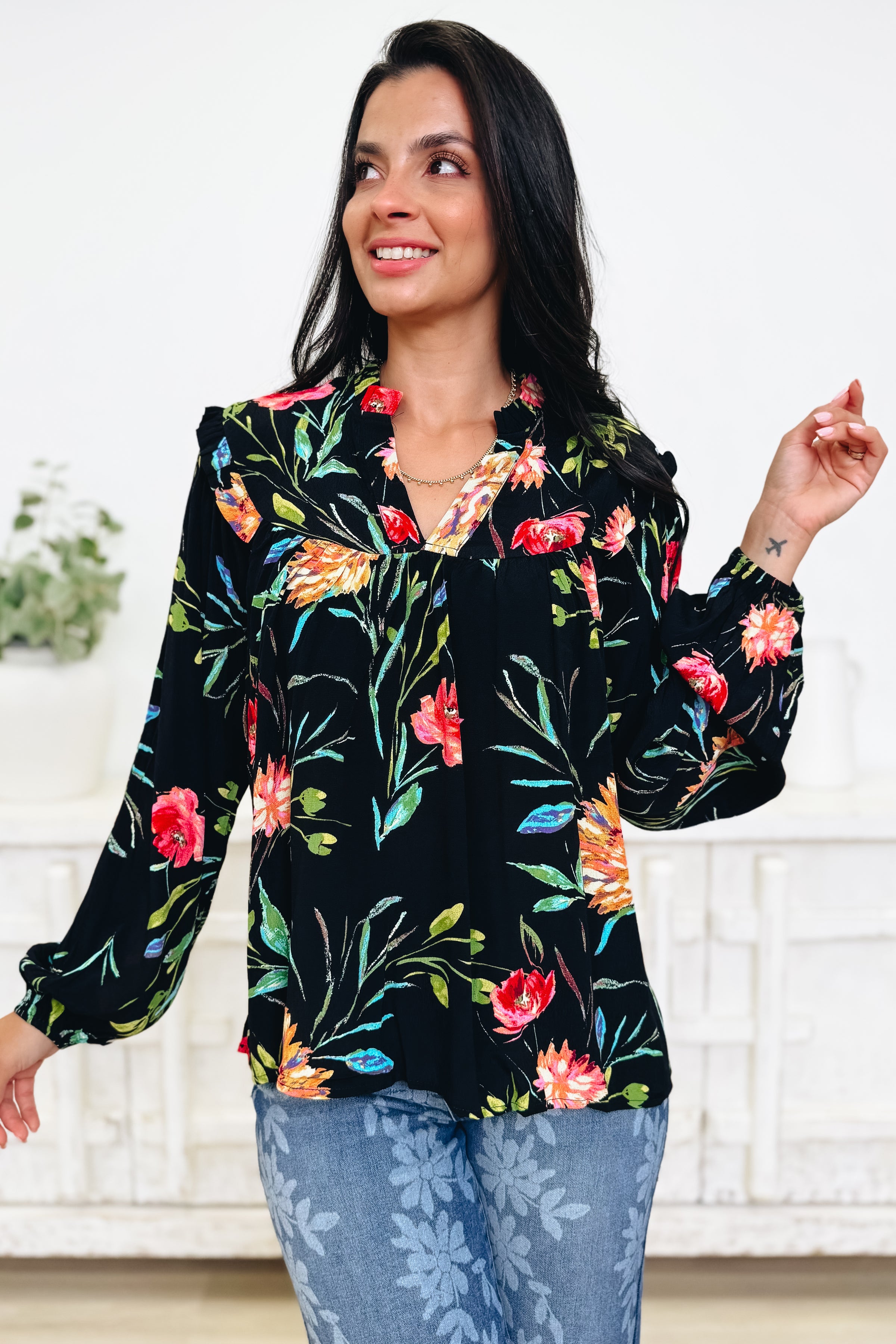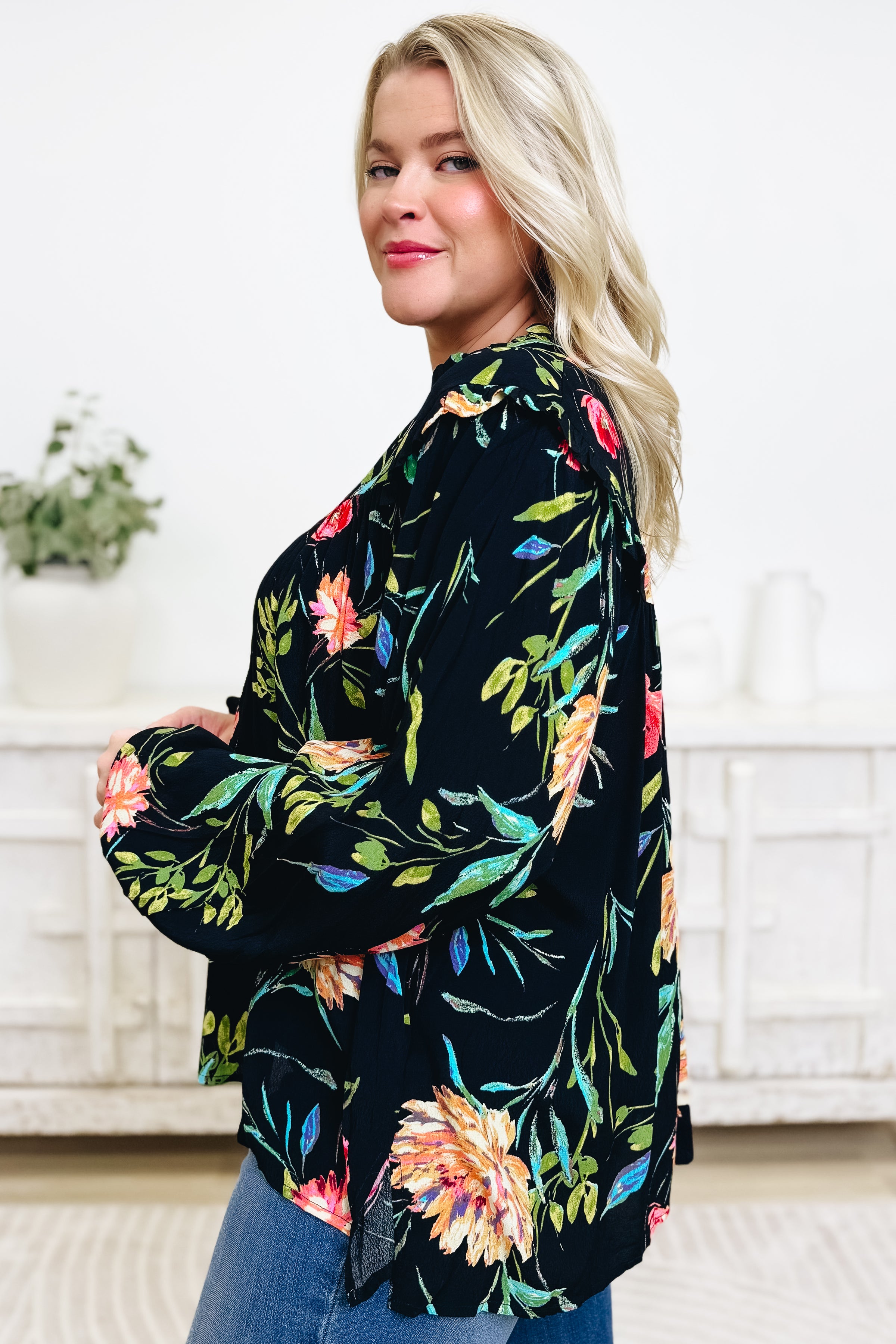 This top is pure perfection! Super lightweight and flowing, it features the most stunning floral print in colors that pop just right. The open V-neckline with a chic collar adds a touch of sophistication, making it perfect for both casual days and dressed-up looks. Effortlessly stylish and oh-so-comfy, this top is destined to be your go-to favorite.