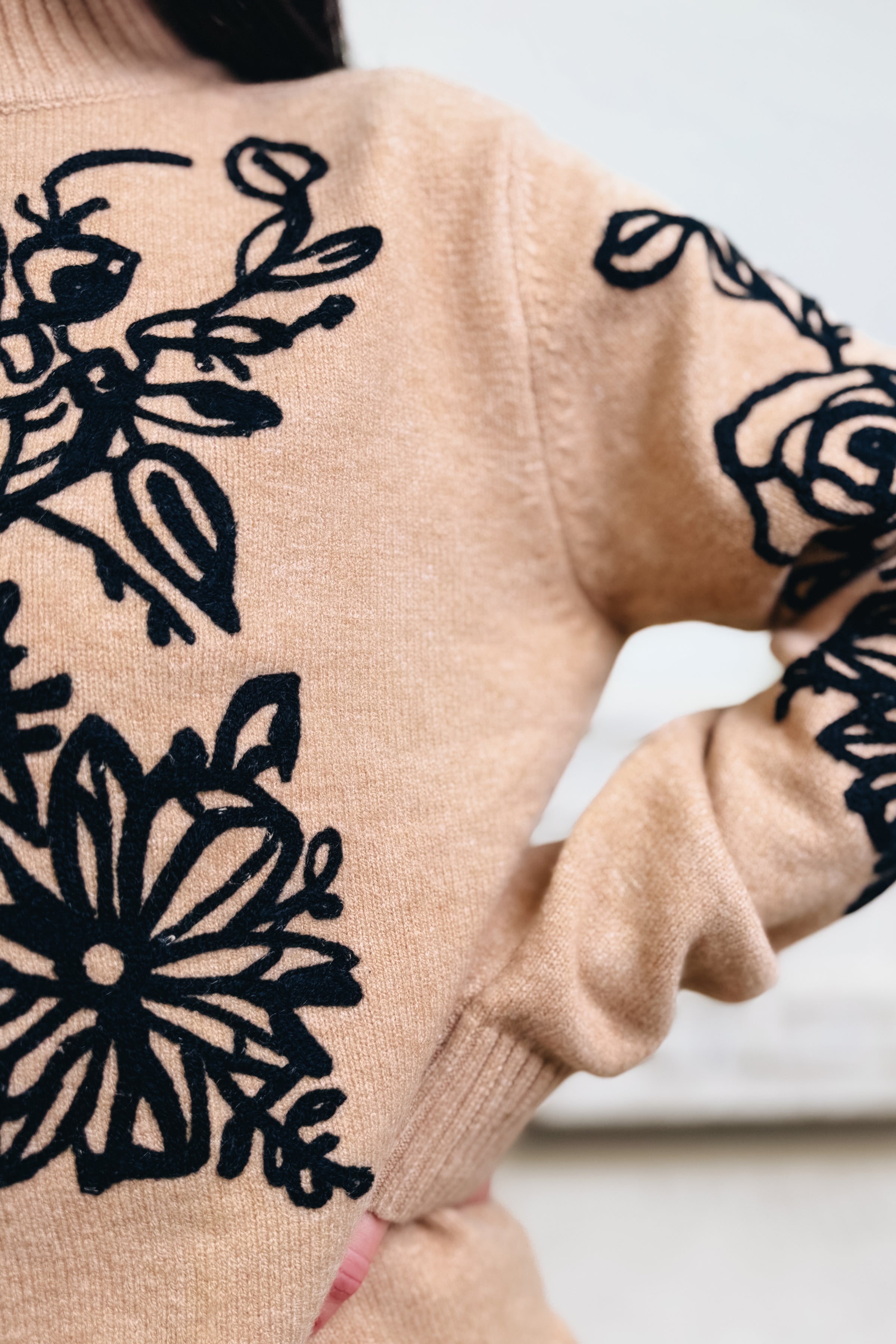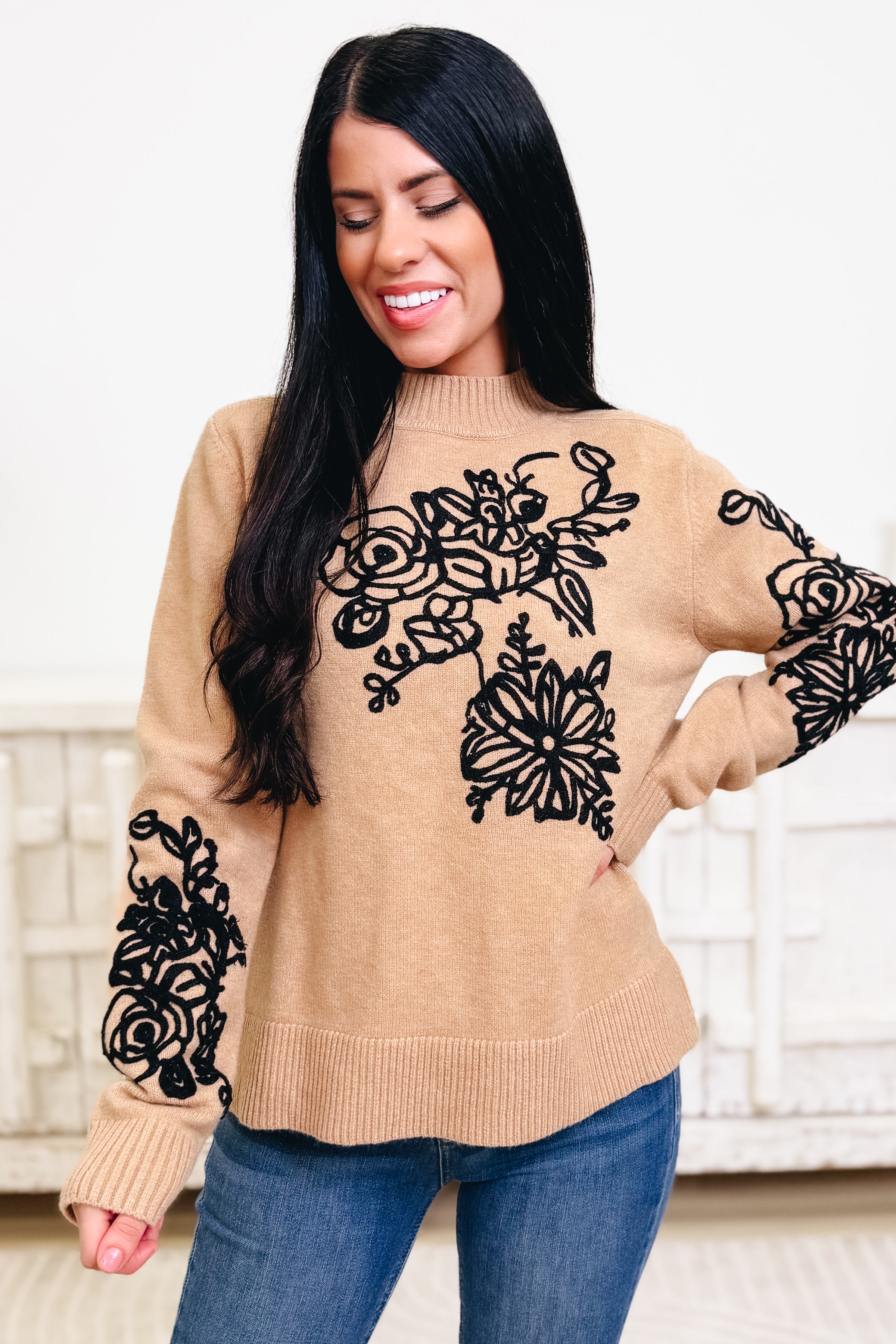 This sweater is such a pretty statement piece without even trying. The warm camel knit is super flattering, and the black floral embroidery gives it that wow factor while still being totally wearable. Finished with a cozy mock neckline and classic ribbed trim, it’s the perfect mix of comfy and dressed up for workdays, dinner dates, church, or any day you want to feel a little extra cute.