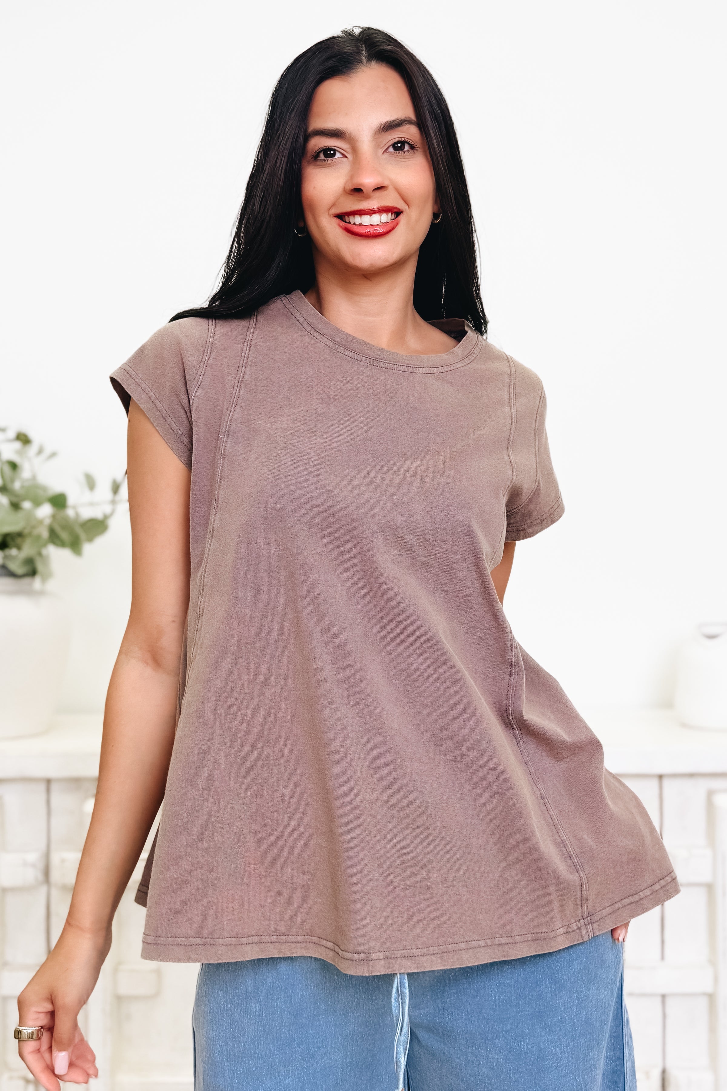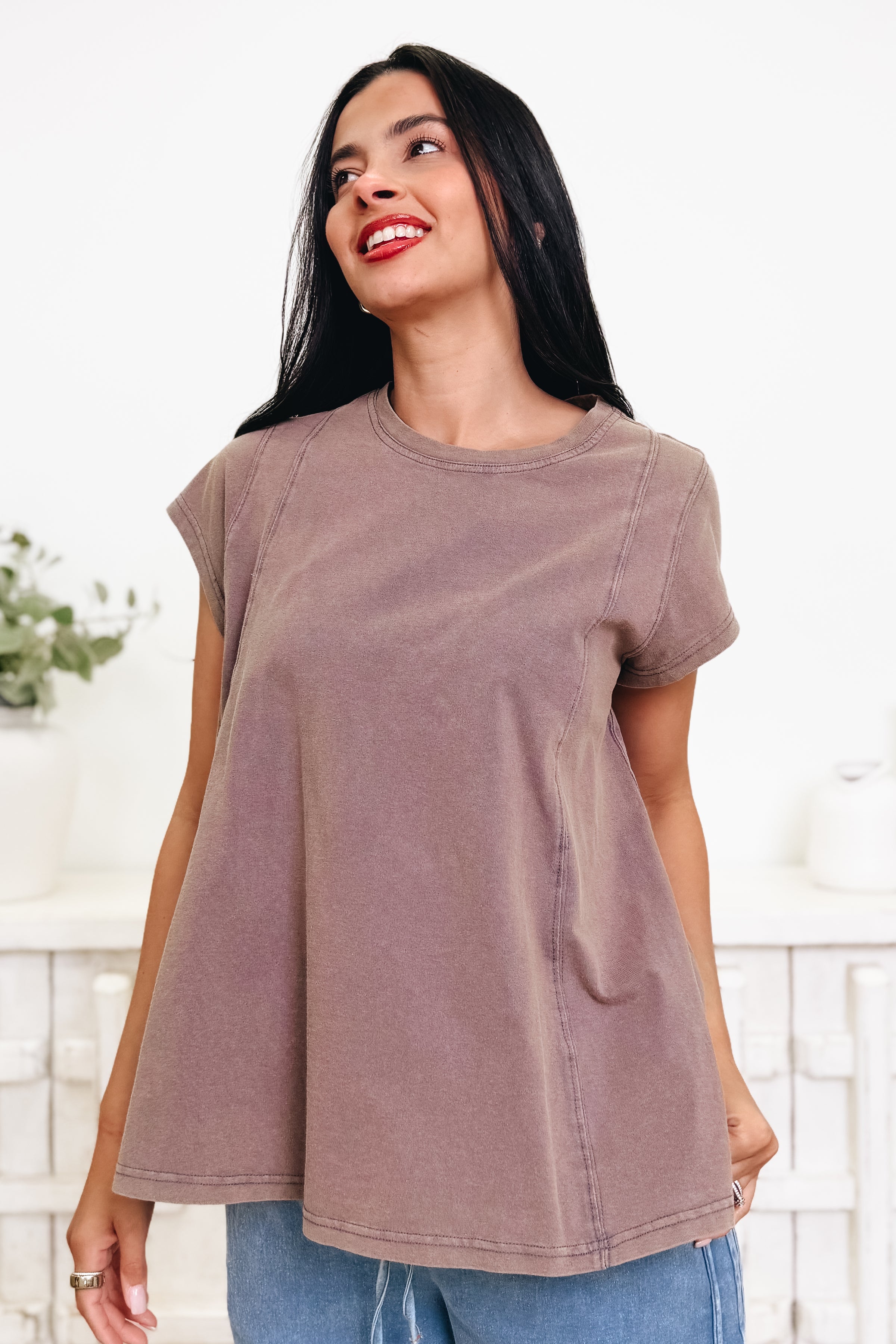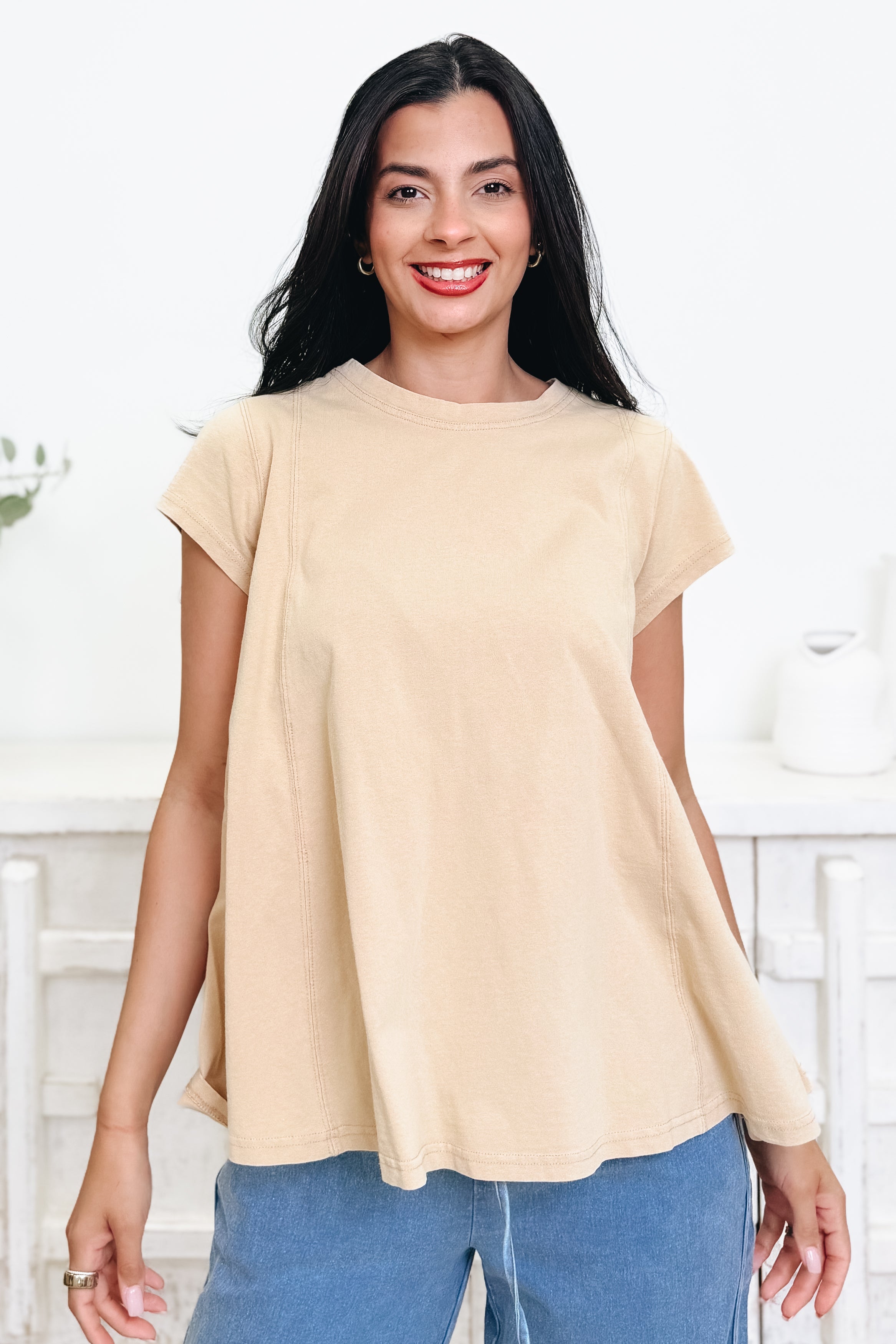 This perfect basic top is one you’ll reach for again and again! It has the most beautiful flow that drapes so effortlessly, giving it that relaxed, easy fit we all love. The colors are absolutely gorgeous and make it so fun to style with anything in your closet. Comfy, cute, and made for everyday wear — we are completely obsessed with this one.