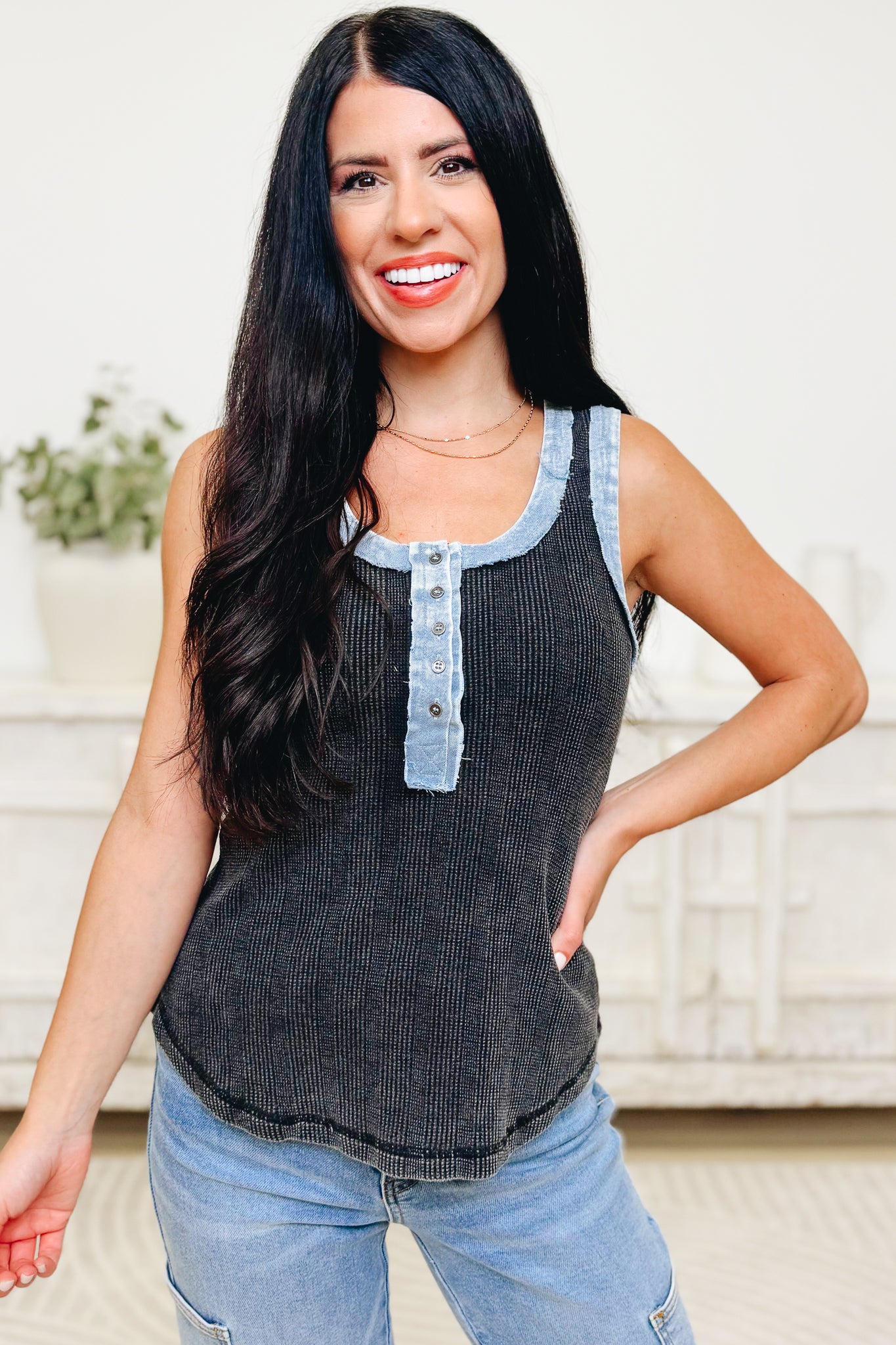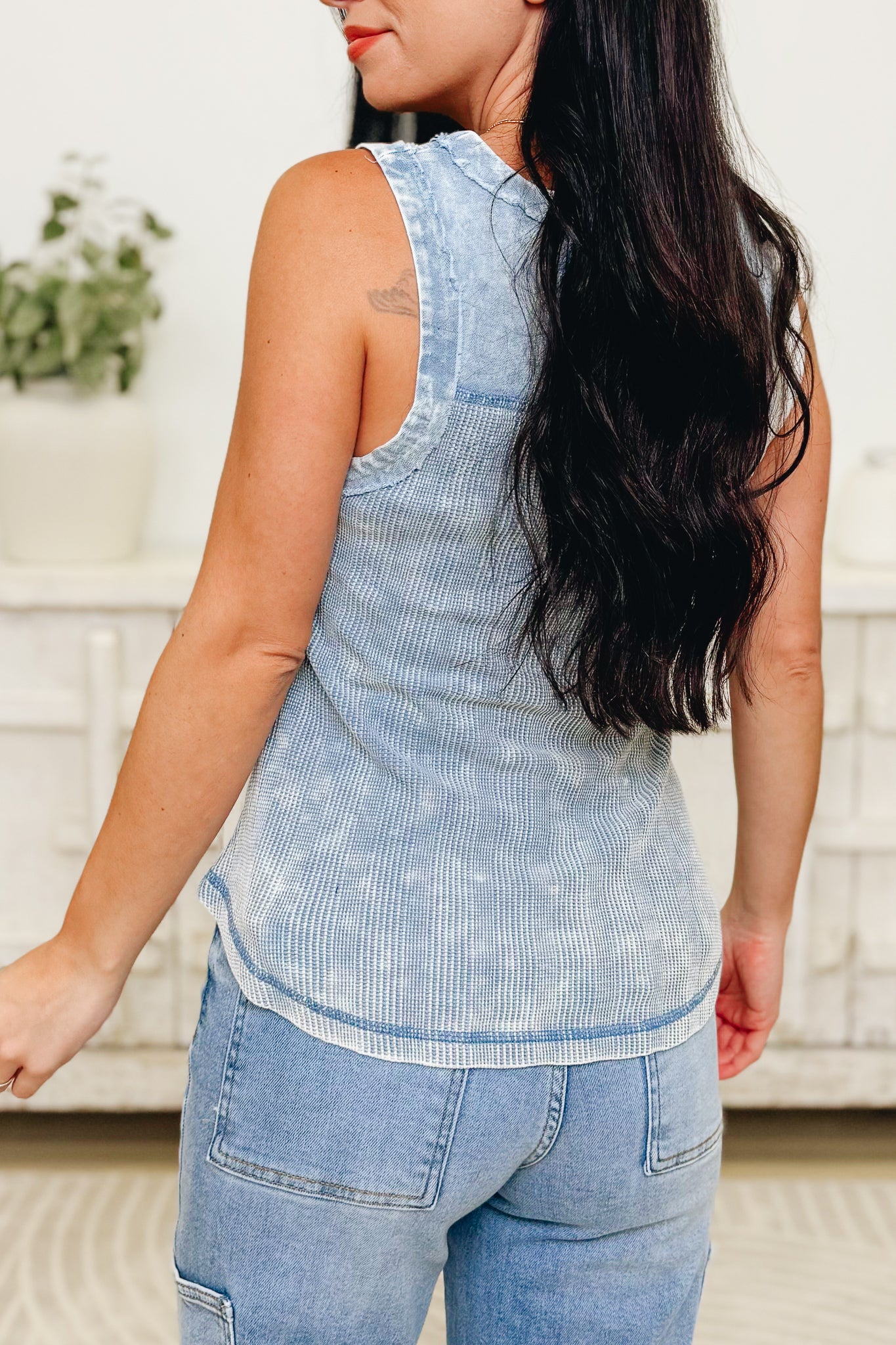 This is the most perfect tank top—super soft, stretchy, and insanely comfy! It features the coolest texture paired with a lightweight denim lining that gives it that effortlessly cool vibe. The mineral wash material is absolutely dreamy, and the colors? Next level. This is your new go-to for everyday wear—we are completely obsessed!