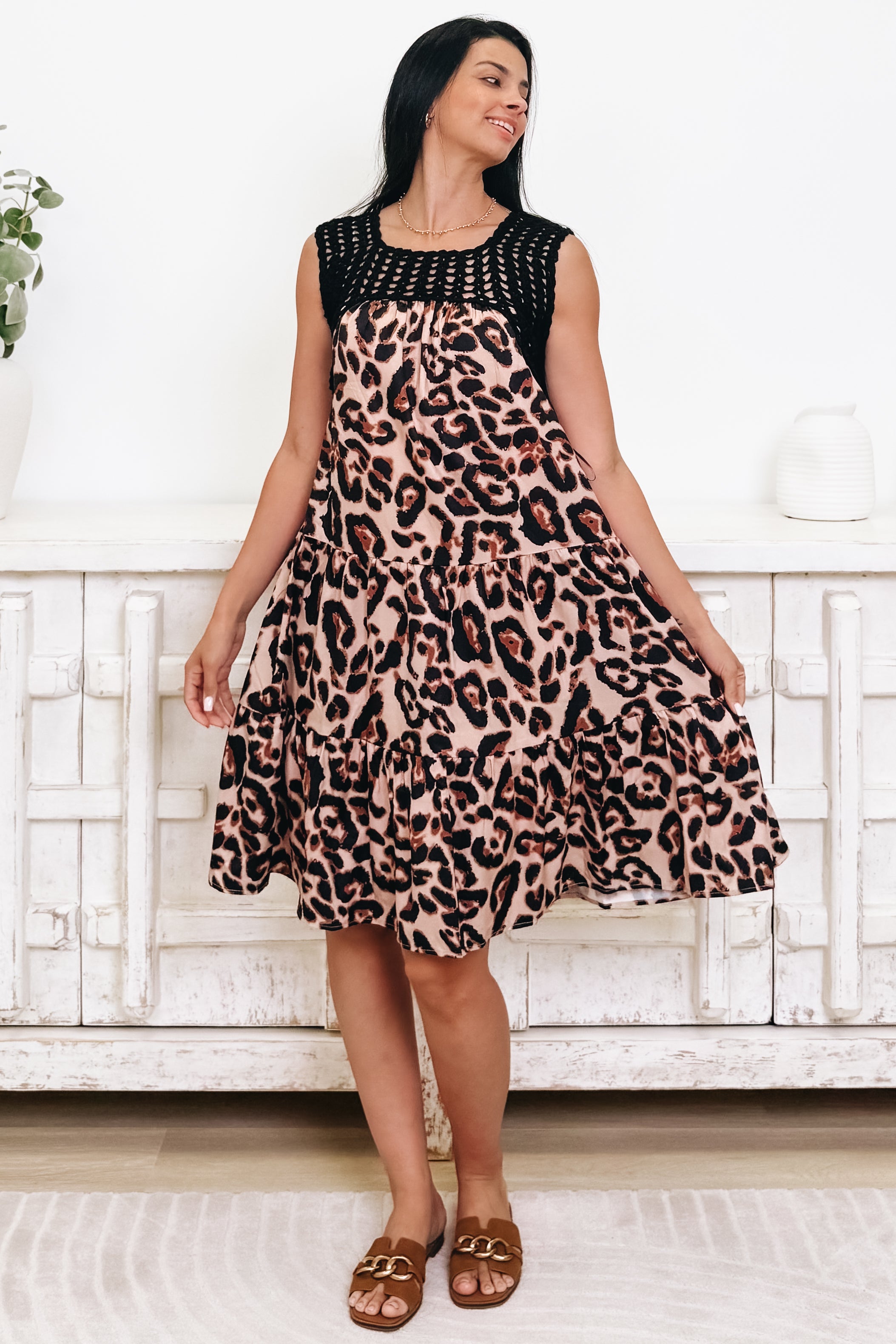 This dress is pure sweetness! With all the flow, stretch, and the cutest crochet top, it’s the ultimate combo of comfort and style. Hidden pockets add that extra touch of practicality, while the perfect length and soft leopard print make it effortlessly chic. The smocked back gives just the right stretch for a flawless fit. We are totally OBSESSED and absolutely IN LOVE!
