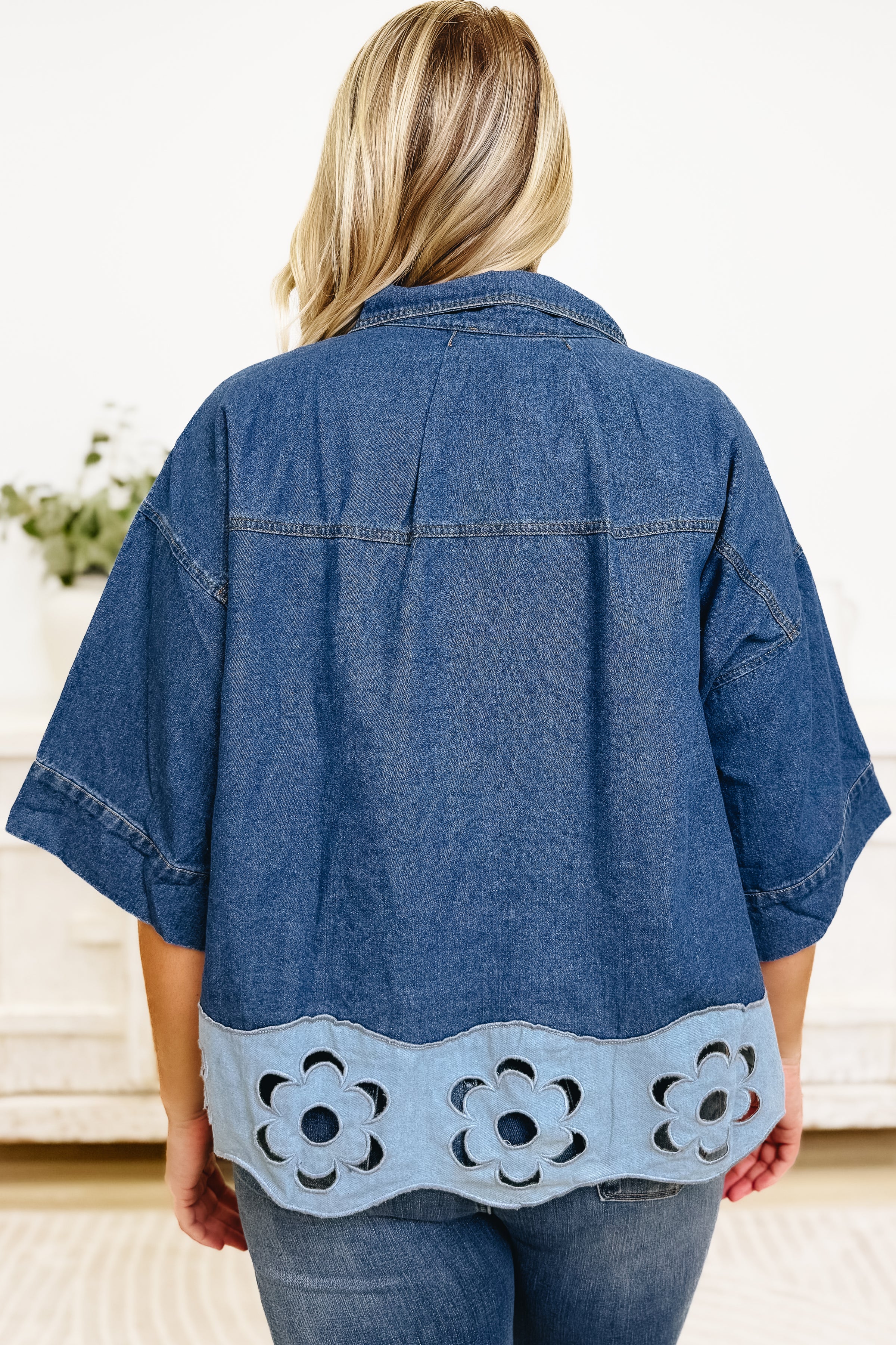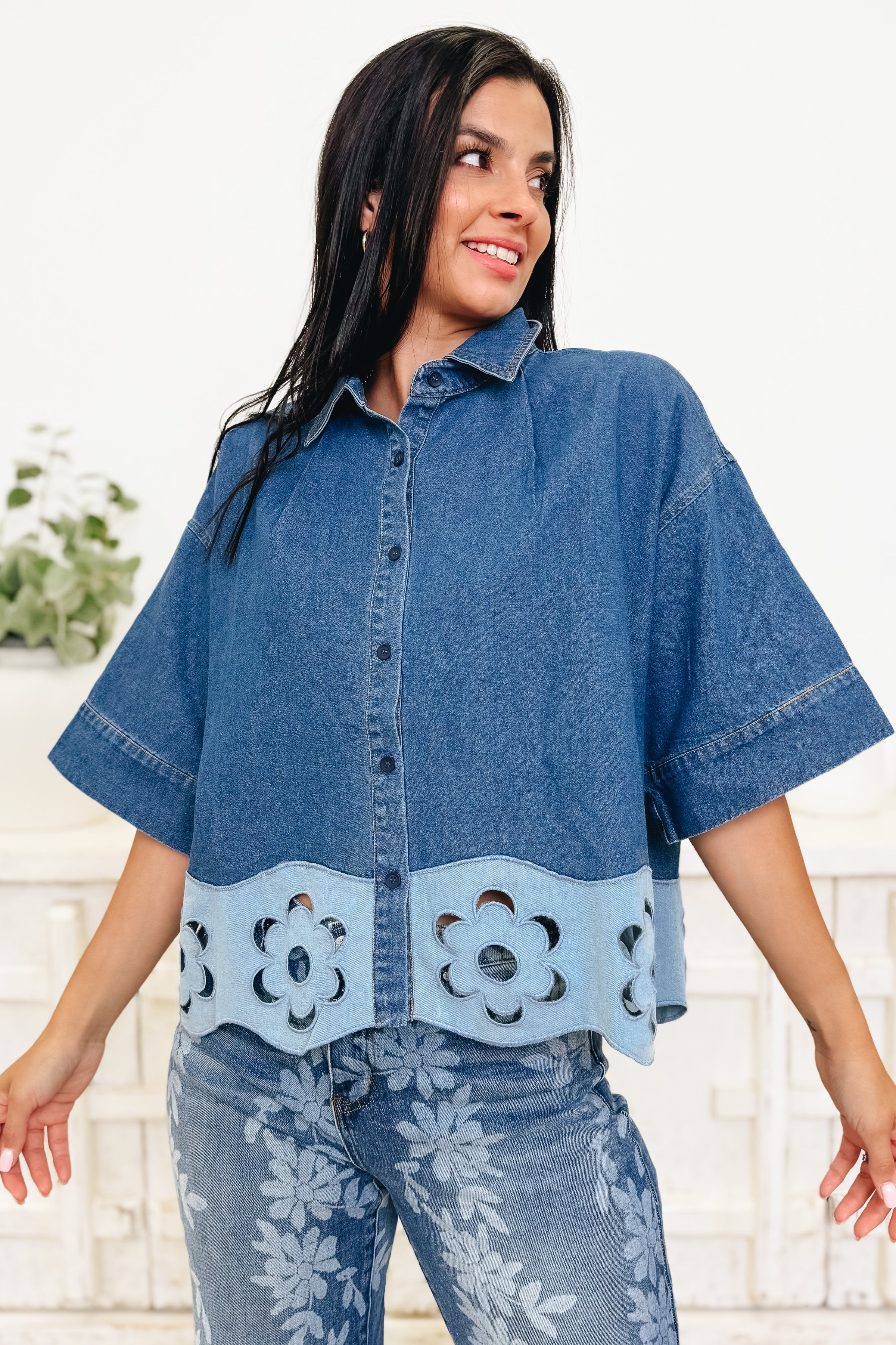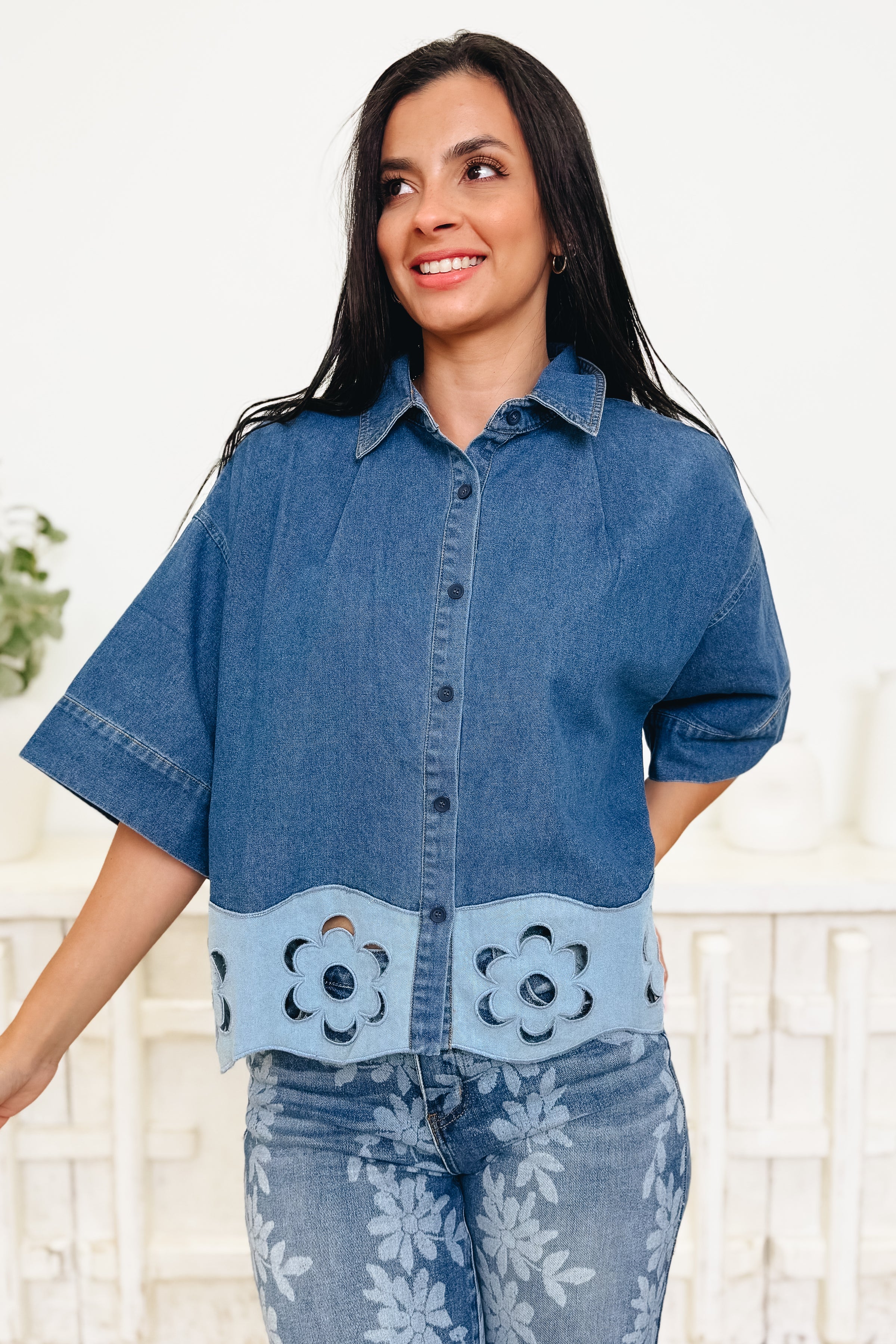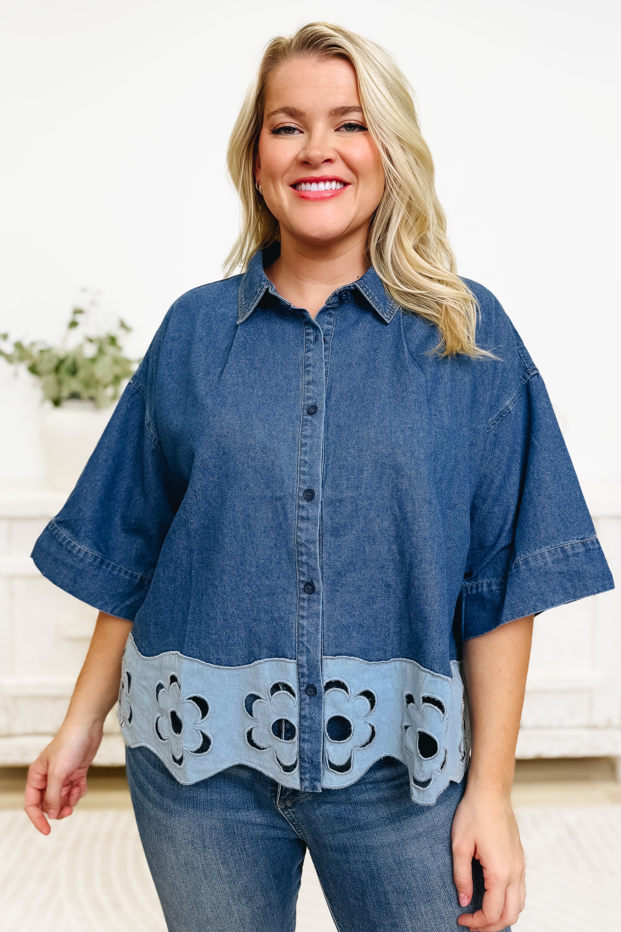 Meet your new denim obsession! This top takes classic jean style and gives it a playful twist with its floral cutout detailing and contrast hem. The relaxed fit and mid-length sleeves make it effortlessly chic — perfect for dressing up or keeping it casual. Pair it with your favorite denim for a bold, coordinated look or mix it up with white jeans for a fresh vibe. We’re completely blooming over this one!