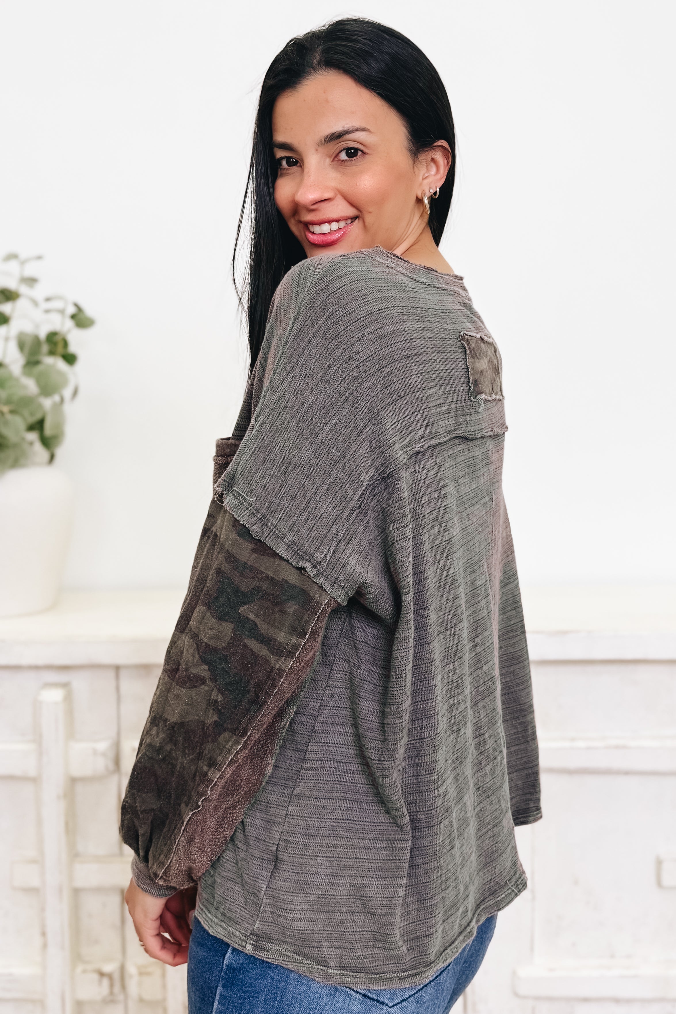This top is the perfect everyday go-to with a little extra cool built in. The soft, washed charcoal body has that comfy, lived-in feel we all love, while the camo long sleeves add a fun pop of pattern that keeps it anything-but-basic. The contrast chest pocket brings in a touch of vintage-inspired detail, and the relaxed fit makes it easy to throw on and feel cute instantly. Pair it with denim, leggings, or lounge pants for that effortless, laid-back look that still has plenty of spunk.