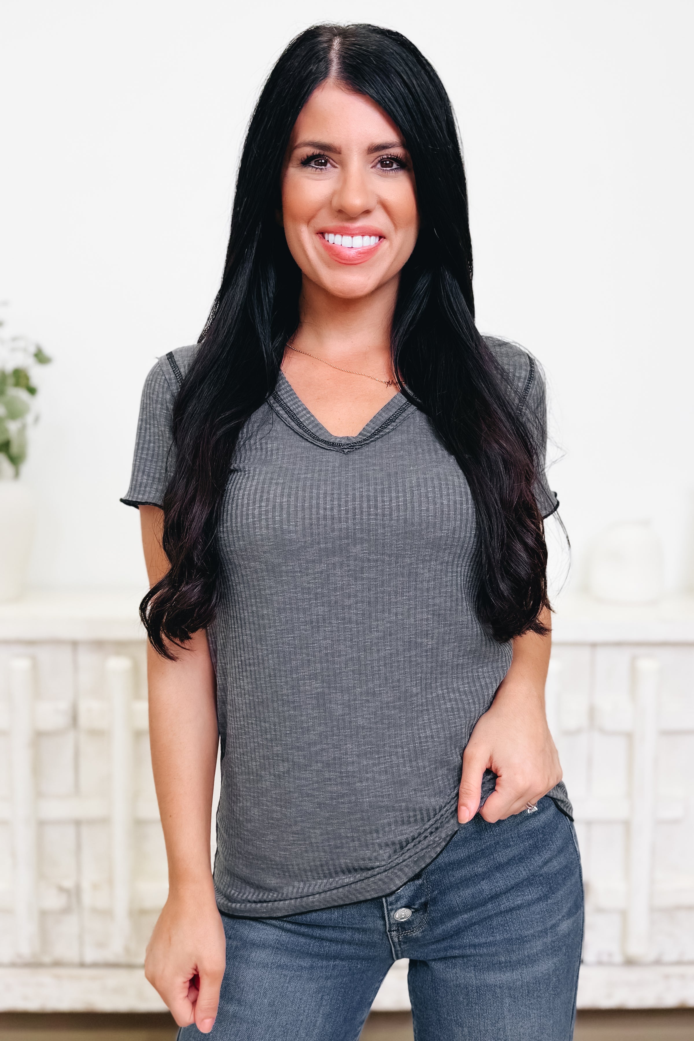 Your grab-and-go tee just got a major glow up. This charcoal ribbed cutie has a flattering v-neck, easy relaxed fit, and that lived-in softness you want to wear 24/7. Finished with raw seam details for a little edge, it’s the kind of basic that’s anything but boring. Toss it on with denim, leggings, or shorts — she plays nice with everything.