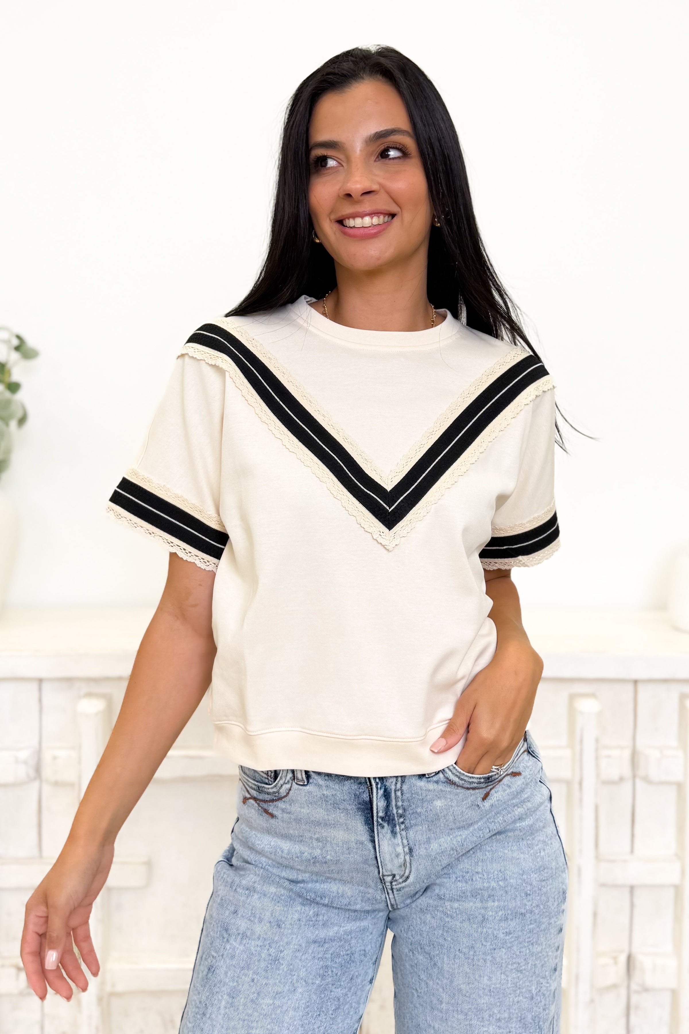 Sporty, sweet, and totally on-trend — this top is the perfect mix of comfort and style! The soft cream fabric keeps things cozy while the bold black chevron detail adds that eye-catching twist. Finished with a touch of lace trim for a dash of feminine flair, this one is cute enough for brunch but comfy enough for lounging.