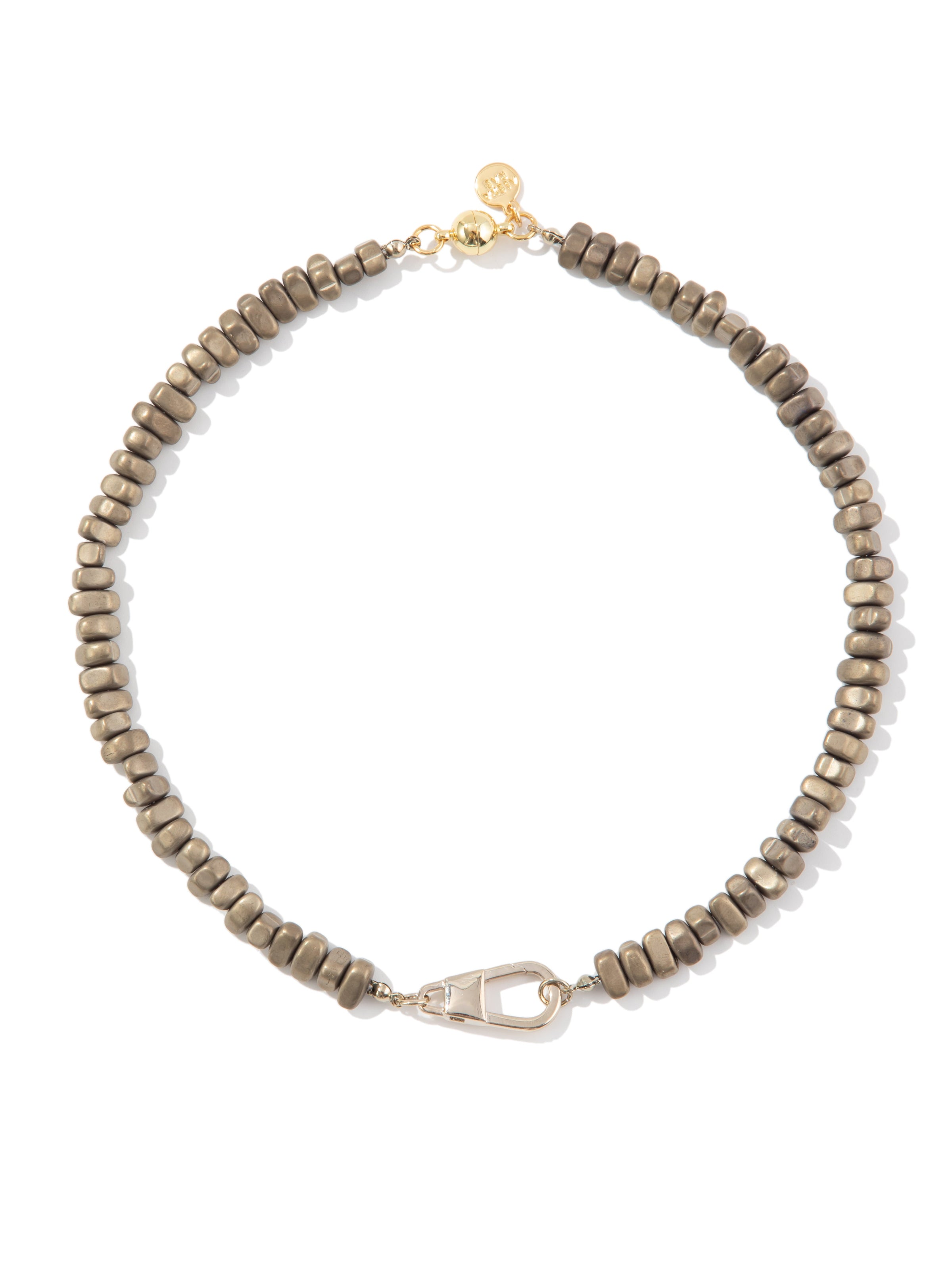 Make a bold statement with the Lara Necklace your ultimate go-to for adding edge and elegance to any look. Featuring a luxe hematite beaded chain in a rich champagne hue and a sleek latch hook detail, this piece delivers major main-character energy. The magnetic clasp with a 3" extender ensures a perfect fit, whether you're layering it up or letting it shine solo. Polished, powerful, and totally unforgettable the Lara is a showstopper.