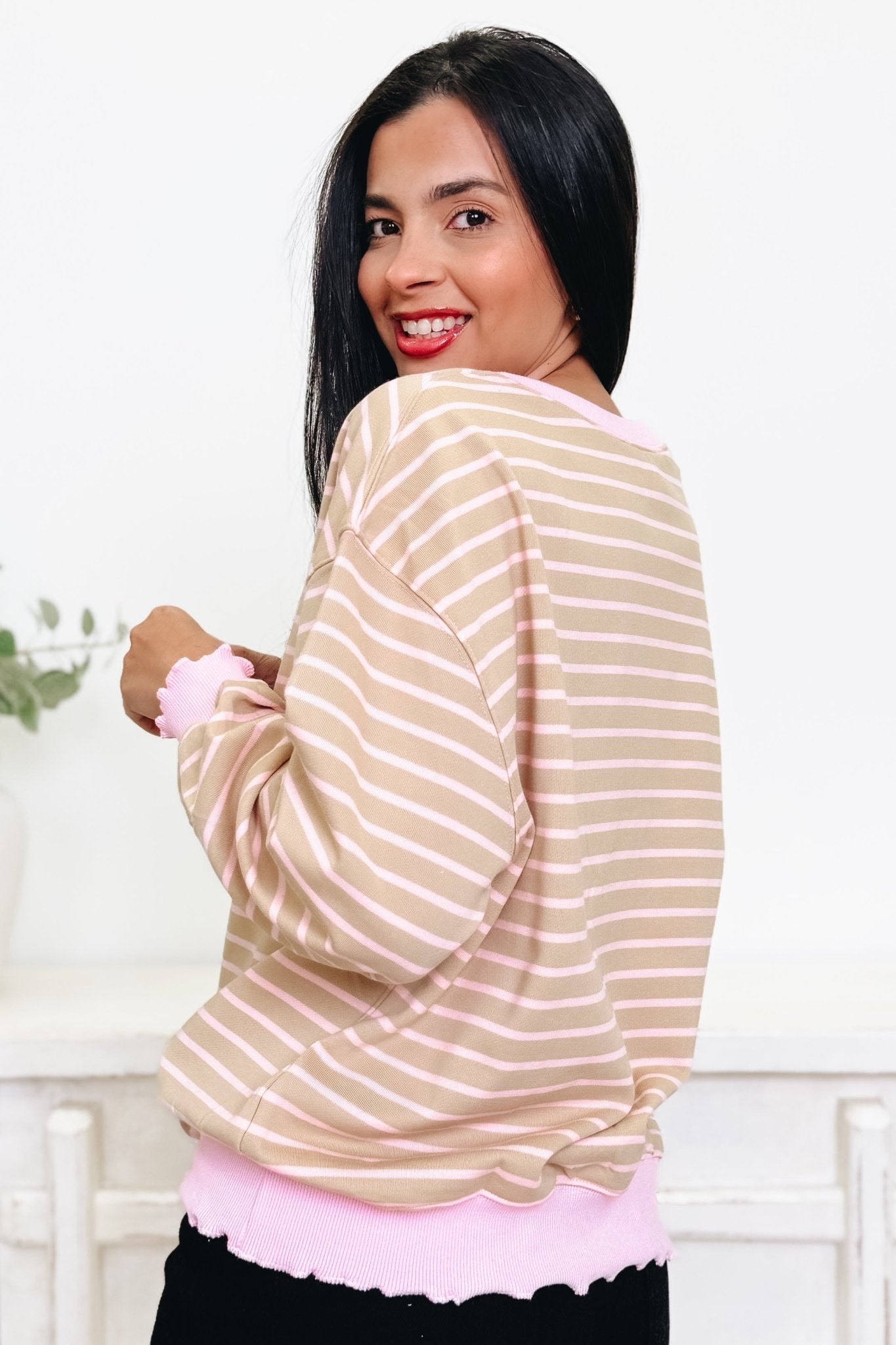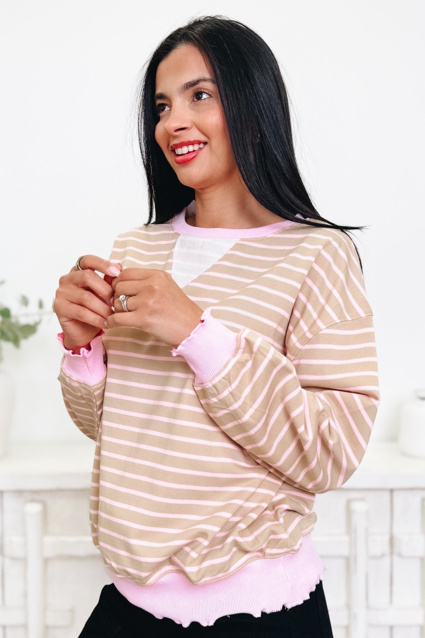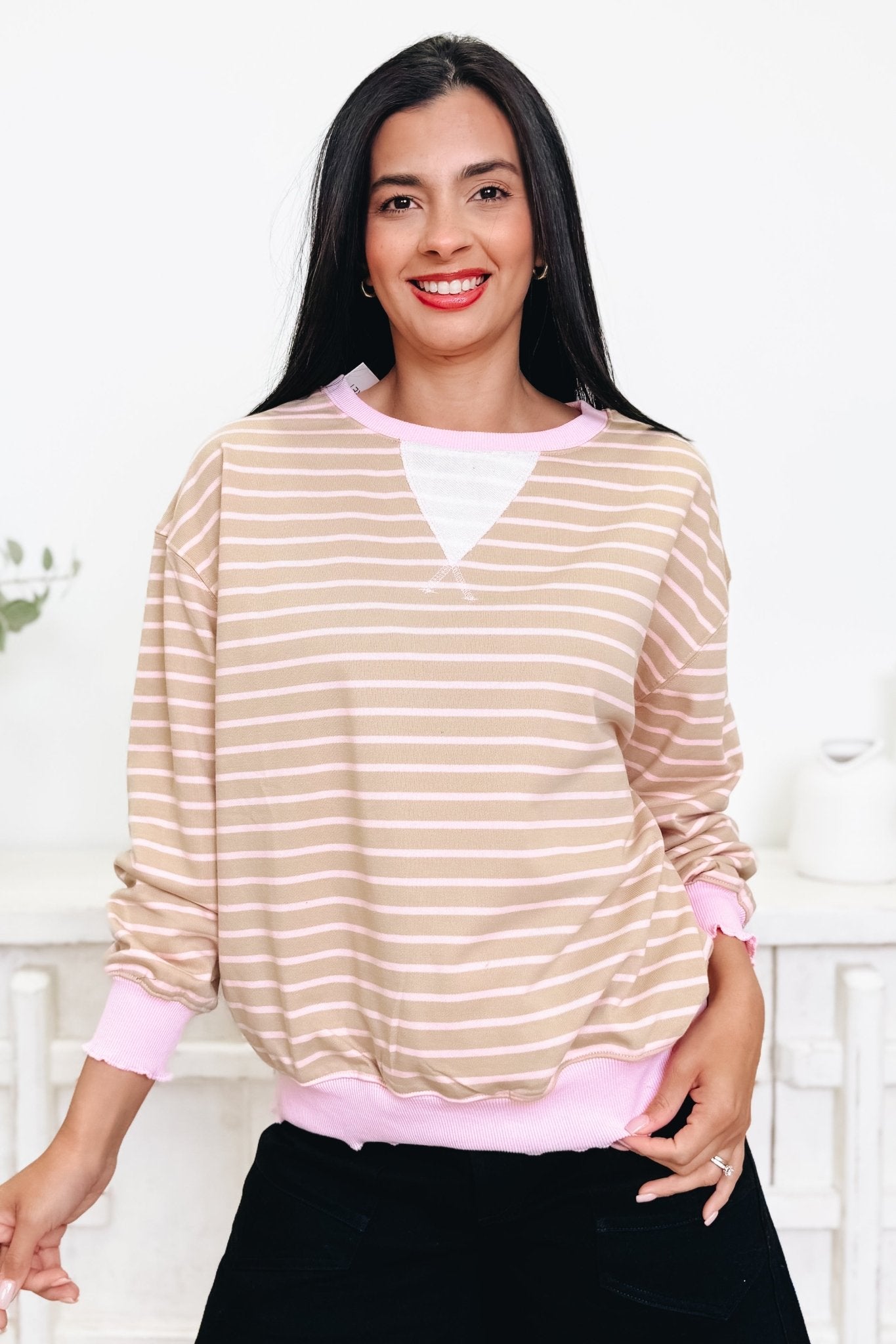 The Like Clock Work Top is your new wardrobe essential! This relaxed-fit beauty rocks gorgeous two-tone coloring with perfectly placed stripe detailing that adds just the right amount of visual interest. Crafted from buttery-soft, stretchy fabric, it's designed to move with you all day long. Sweet, effortless, and undeniably chic—throw it on with your favorite jeans or dress it up for a night out. This is the top that does it all!
