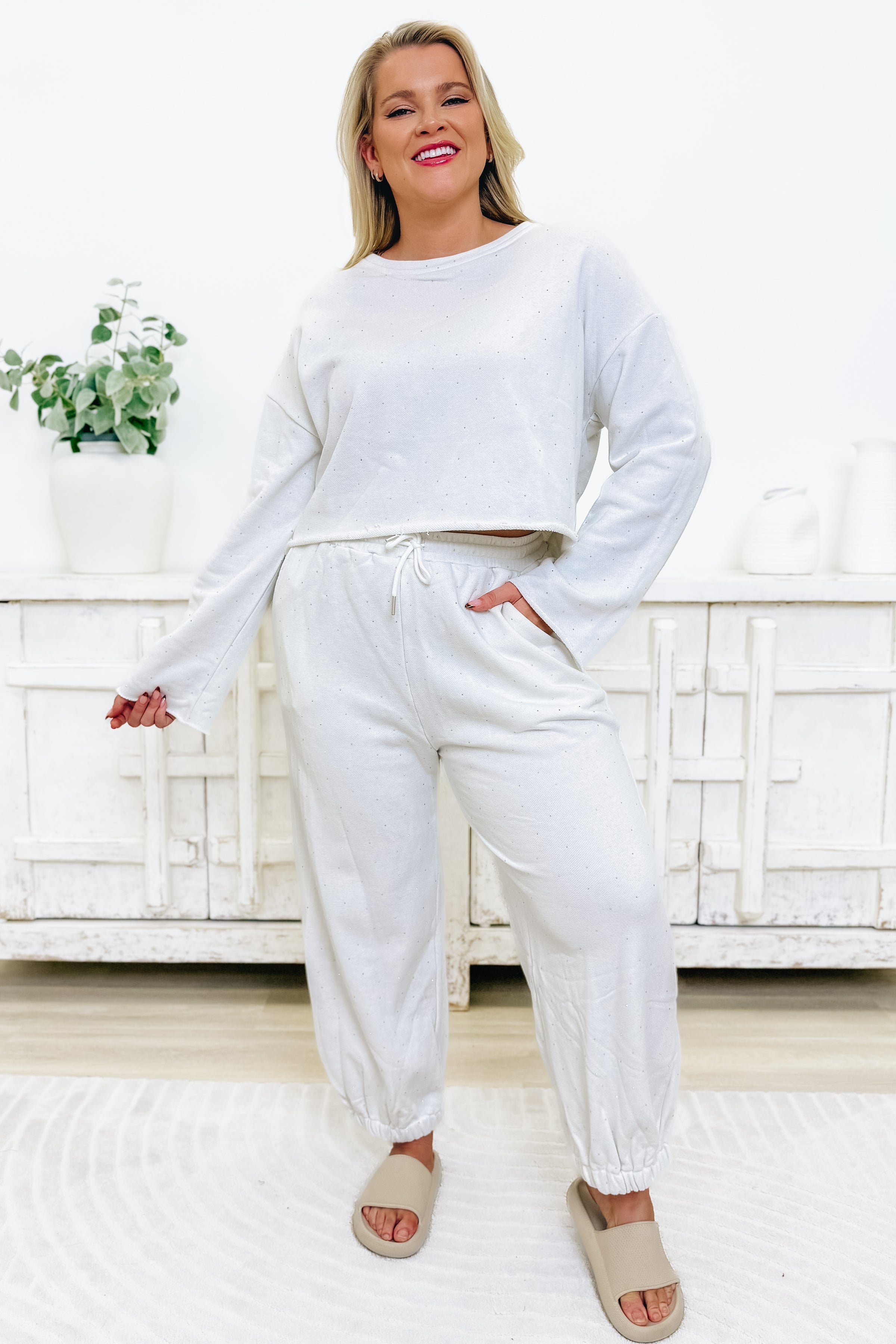 This sparkly pants set is pure perfection! Featuring dazzling rhinestone and sparkle detailing, the gorgeous coloring and subtle sparkle threading make every piece shine. Super soft and stretchy with a raw-hem finish and functioning drawstring waistband, it’s comfy, chic, and versatile. Wear it together for head-to-toe glam or mix-and-match—either way, you’ll be obsessed!