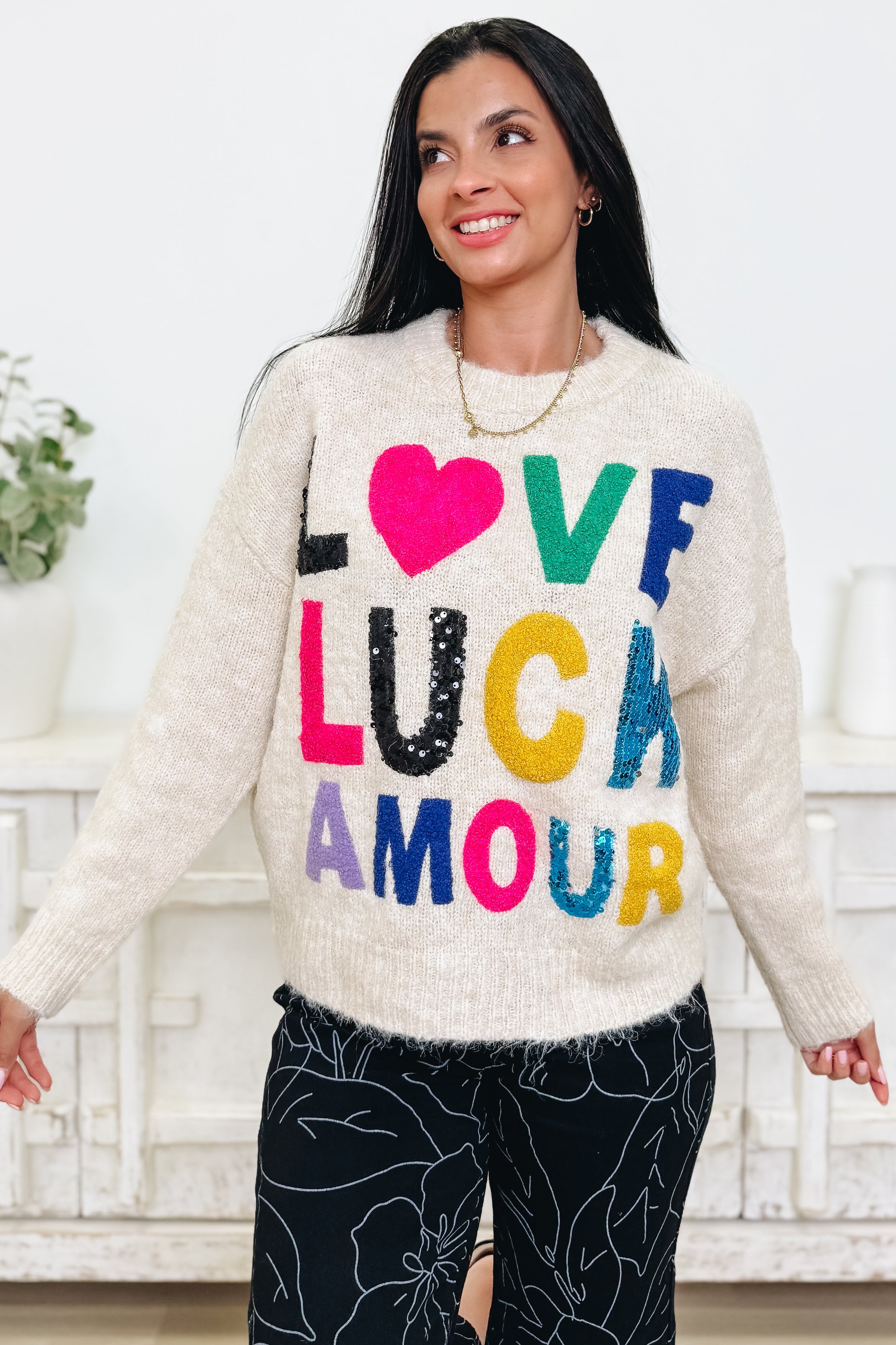 This sweater is pure joy wrapped in cozy softness! With its bold, colorful lettering and touch of sparkle, it brings all the happy vibes while keeping you warm and comfy. The soft knit feels dreamy against the skin, and the playful sequin details make it a total mood-booster. Pair it with denim, leather, or your favorite lounge pants — this one’s made for spreading good energy wherever you go!