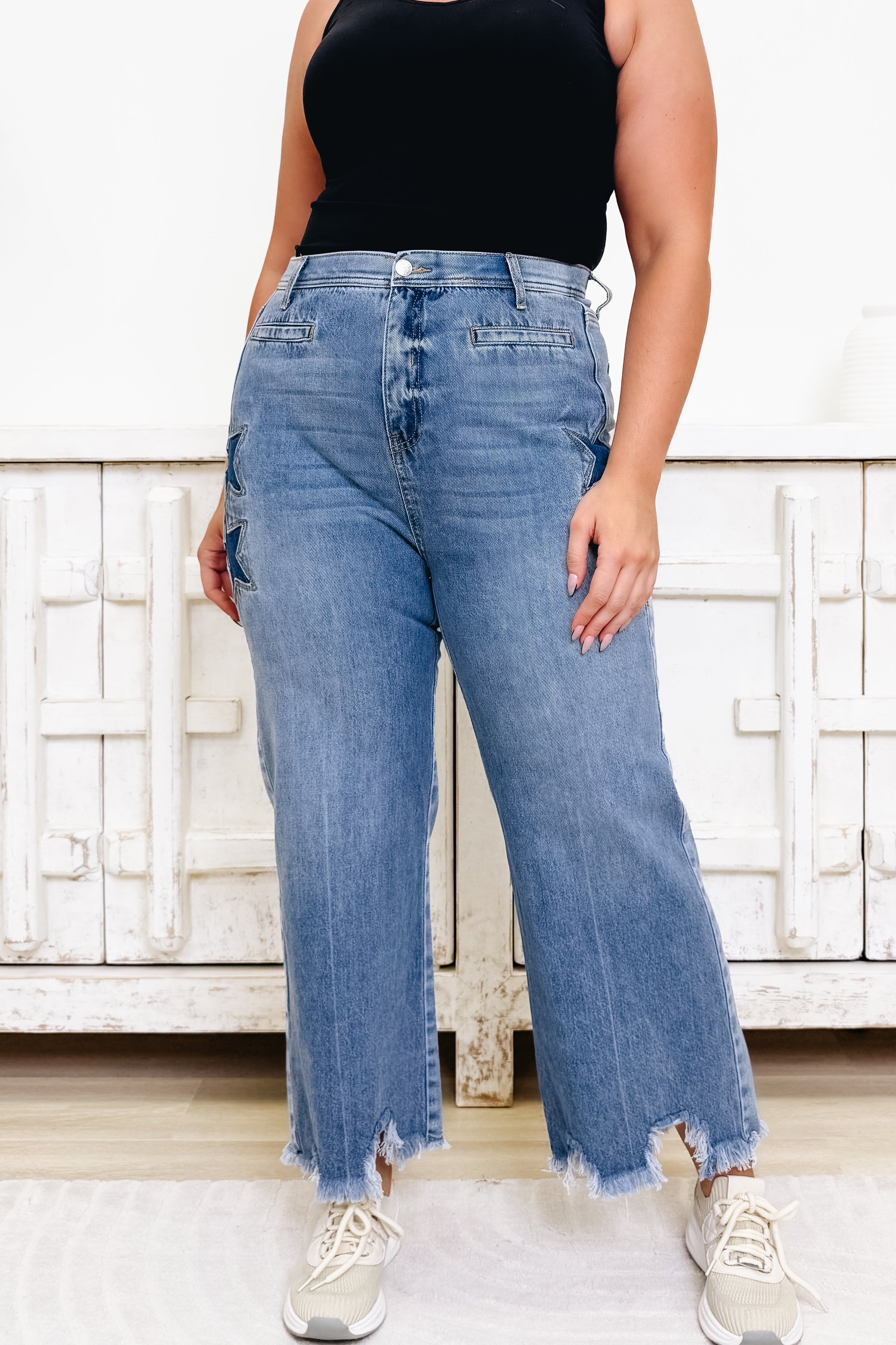 Get ready to turn heads in these Lucky Star jeans! The high-rise wide-leg silhouette pairs perfectly with an edgy raw hem shark bite cut and celestial star embellishments that make a real statement. Dressed in a chic medium light wash, these beauties are made from buttery-soft, stretchy fabric that flexes with your every move. Comfortable enough for all-day wear, stylish enough to steal the spotlight. We're absolutely smitten—and you will be too!
