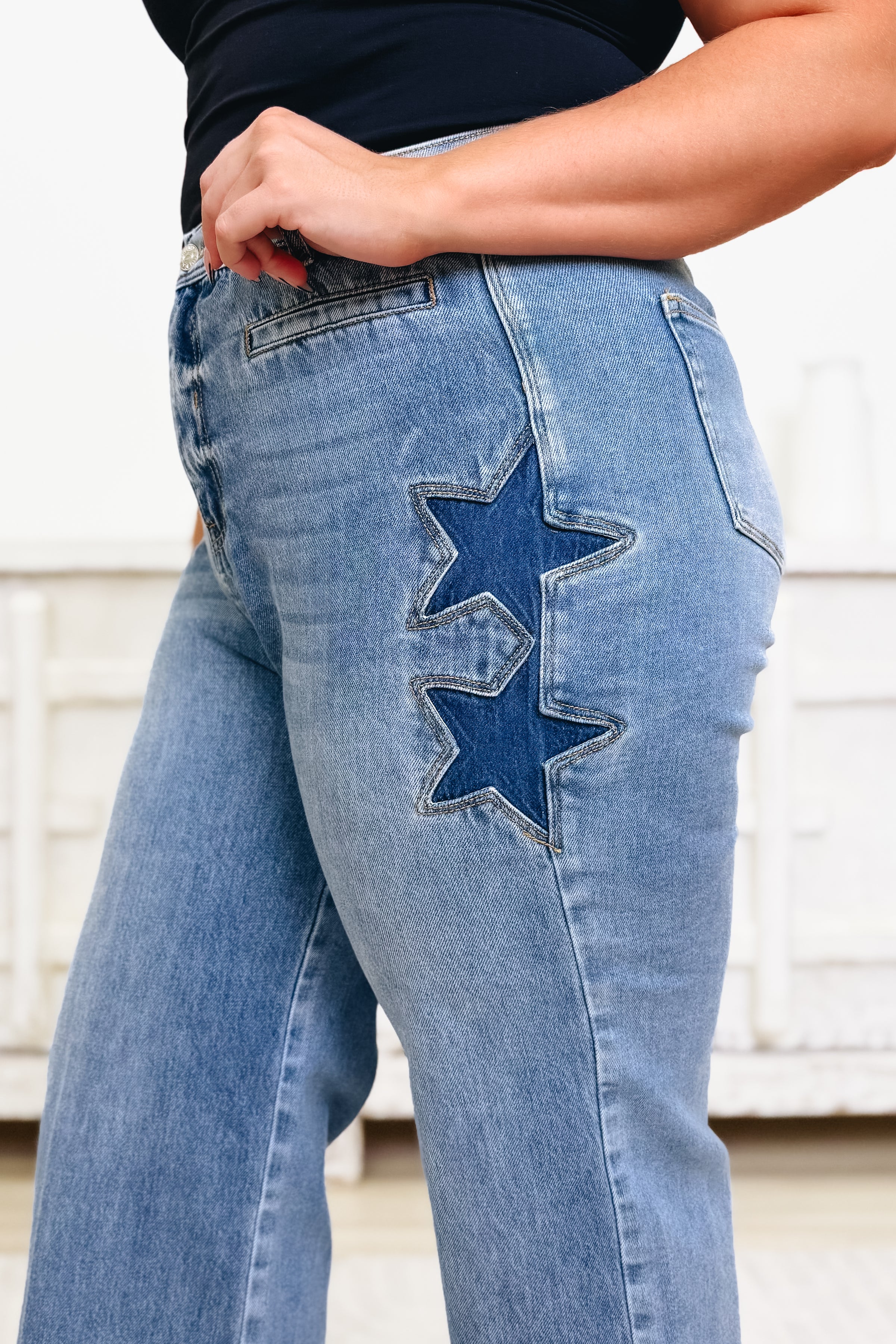 Lucky Star By Saige Denim - High Rise Wide Leg Star Jeans - Medium Light