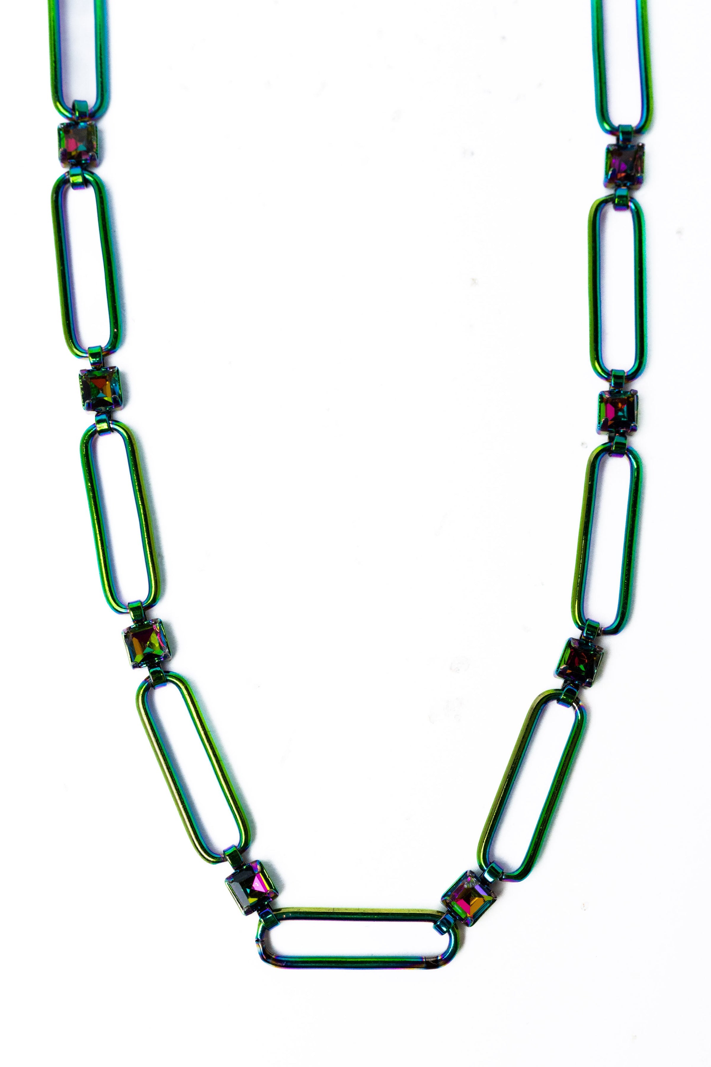 Our Mallie necklace is the ultimate paperclip chain that sits perfectly on your neck, blending sleek mystic rainbow AB coloring with sparkling crystal accents. Featuring a magnetic clasp with a 3" extender for easy wear, this lightweight and stunning piece is the perfect balance of edgy and elegant. We are totally OBSESSED—and you will be too!