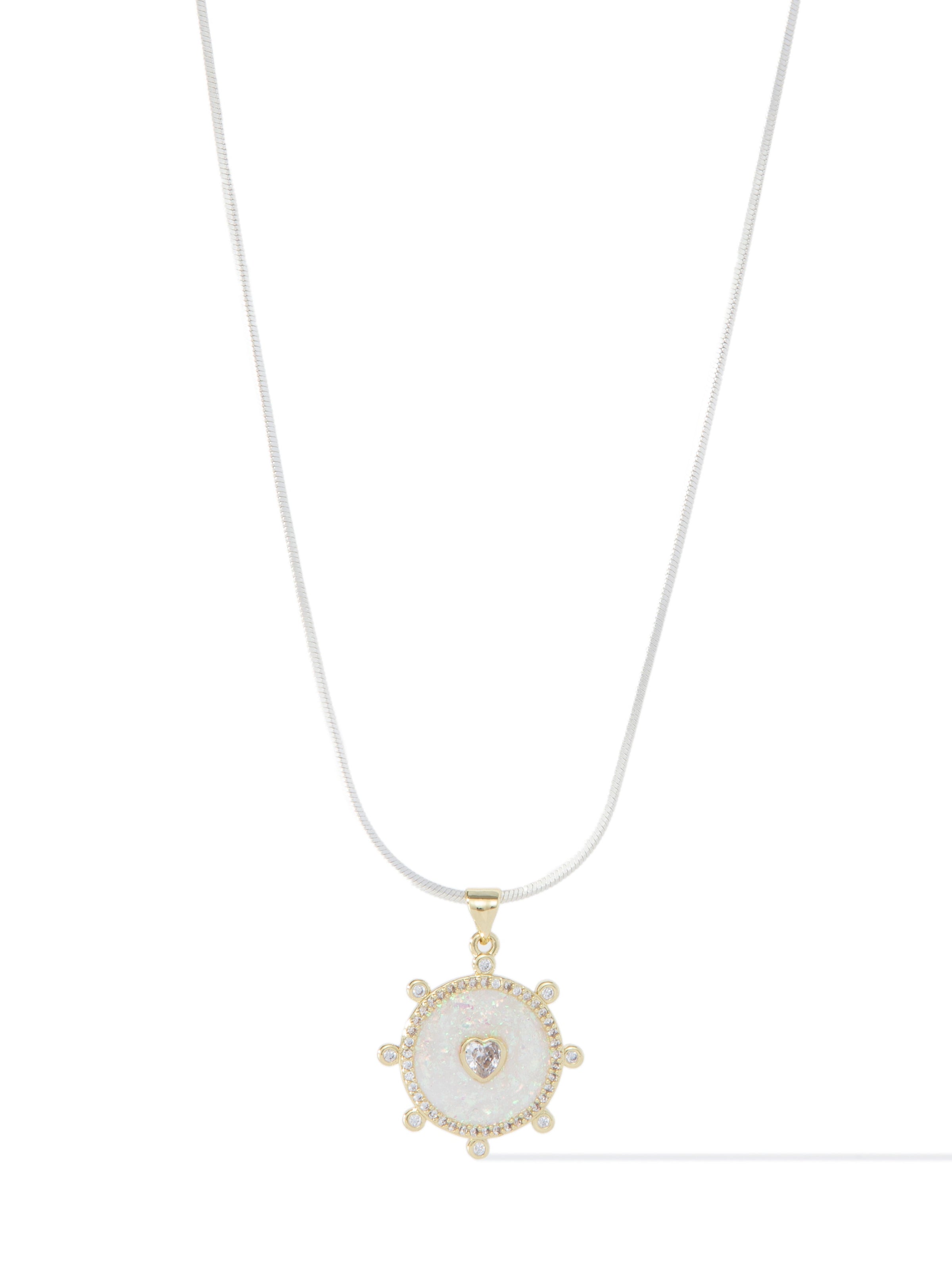 Our Mystic Love necklace is pure magic! Featuring a stunning pendant and an ultra-lightweight feel, it dazzles with a gorgeous metallic pearl white color accented by shimmering Crush Opal and sparkling Cubic Zirconia. Finished with a magnetic clasp and a convenient 3" extender for the perfect fit, this necklace is effortlessly elegant and totally captivating. We are absolutely obsessed!