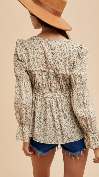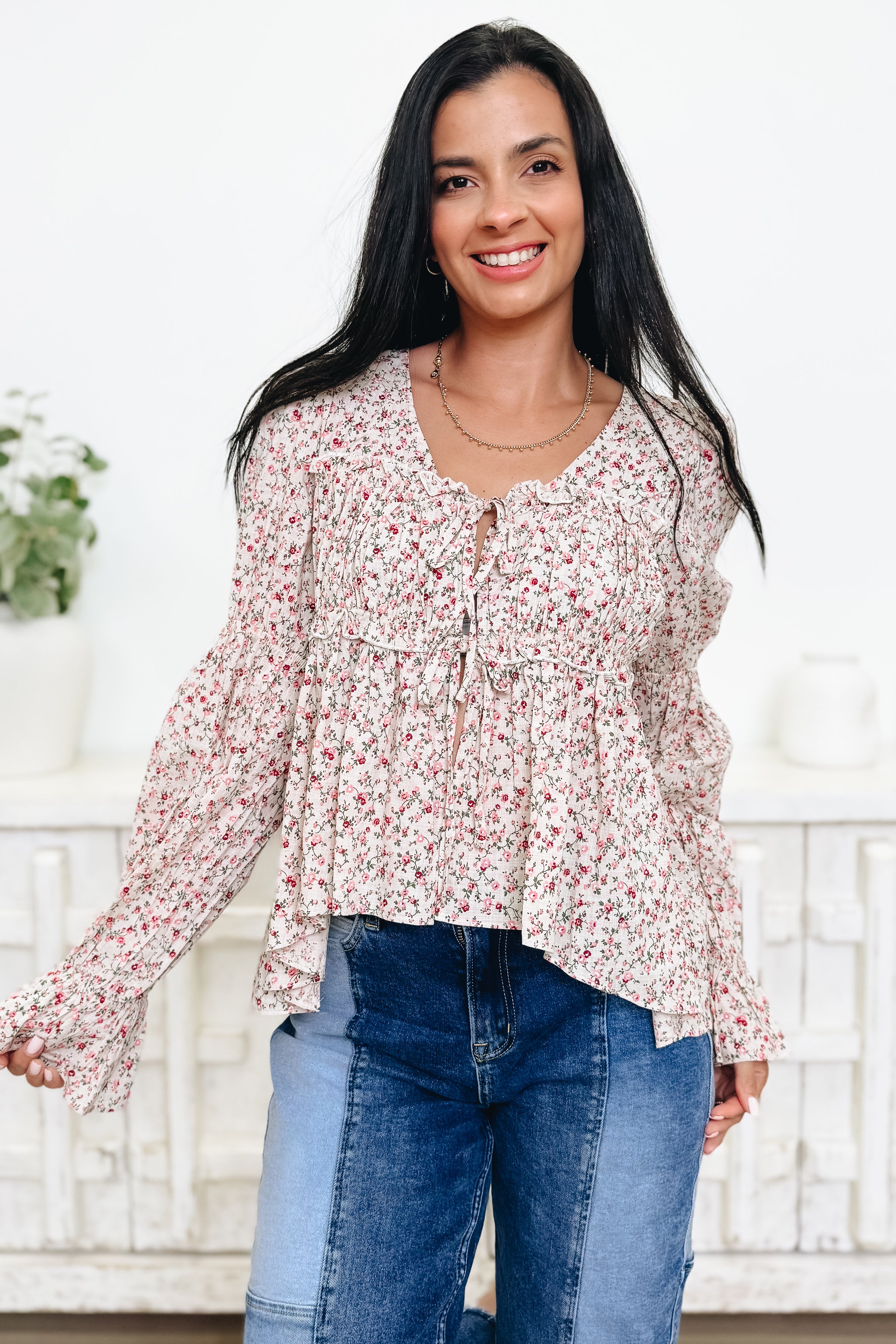 Feminine, flowy, and oh-so-flirty! This floral blouse is the perfect mix of pretty and playful with its ruffled details, dainty tie front, and breezy silhouette. The lightweight fabric and soft print make it ideal for layering or wearing solo on sunny days. Pair it with denim for that effortlessly chic, boho vibe we’re all obsessed with!