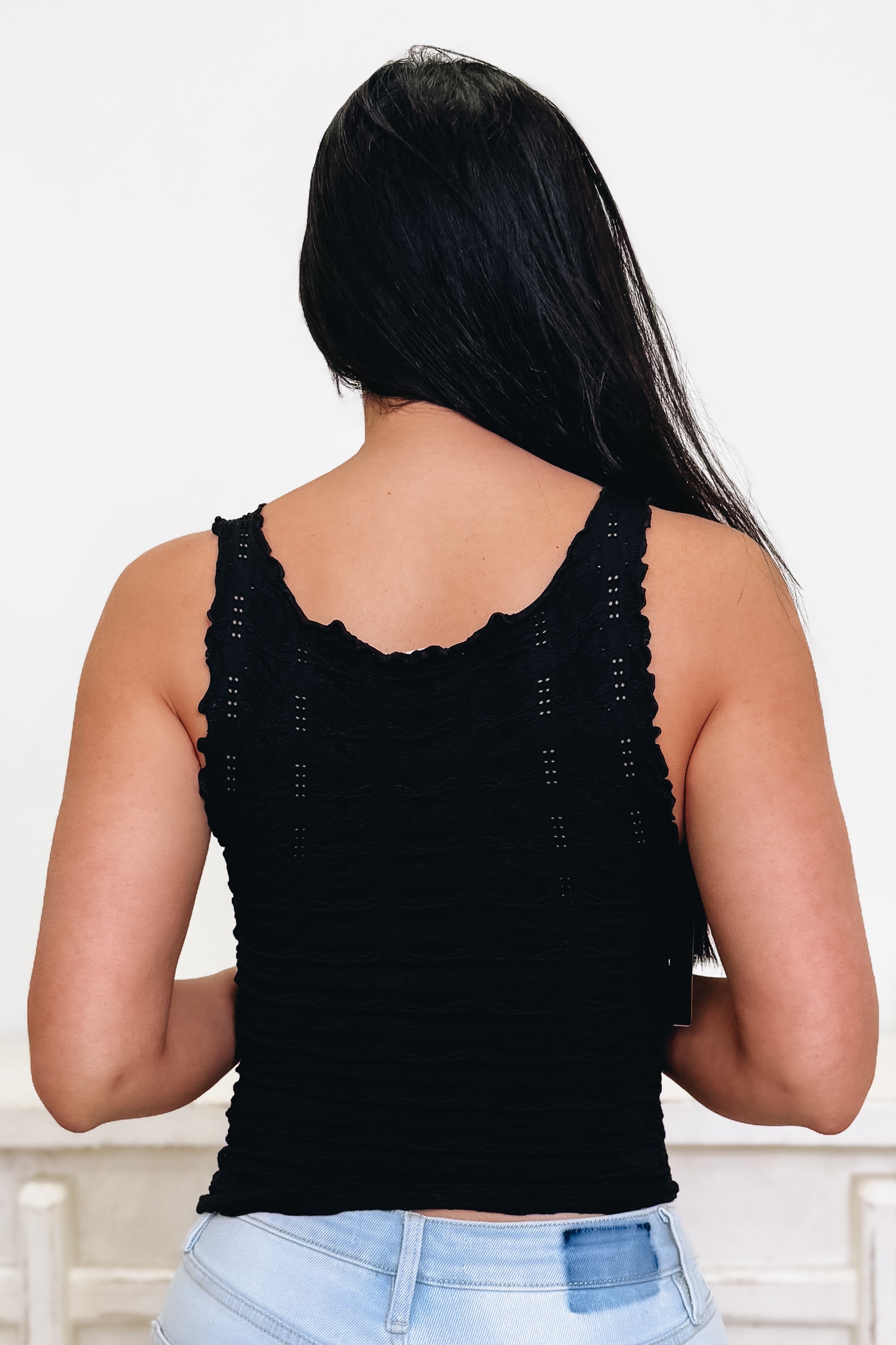 Slip into effortless style with this open knit tank featuring a playful lettuce trim edge. Crafted from super soft, stretchy fabric that moves with you, it's the perfect layering piece or standalone statement. With thoughtfully curated color options and impeccable detailing, this tank delivers that unique vibe you've been searching for. Comfortable, flattering, and undeniably chic—your new go-to is here!