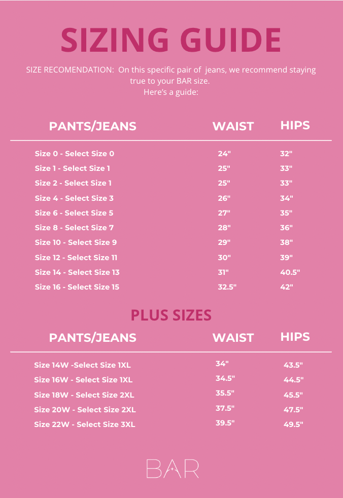 GETTING STARTED: Let us help you find your true BAR jeans size so no matter the brand or fit, we get you in the perfect size jeans for you! To find your true BAR jeans size, simply subtract 1 from your highest-even size. For instance, if you typically wear a department store size 12, your BAR jeans size would be an 11. If you find yourself between two even sizes, opt for the middle size - for example, a 6-8 translates to a BAR size 7. This serves as your baseline for every pair of your BAR jeans! See your tailor-fit tip for this specific pair of jeans!