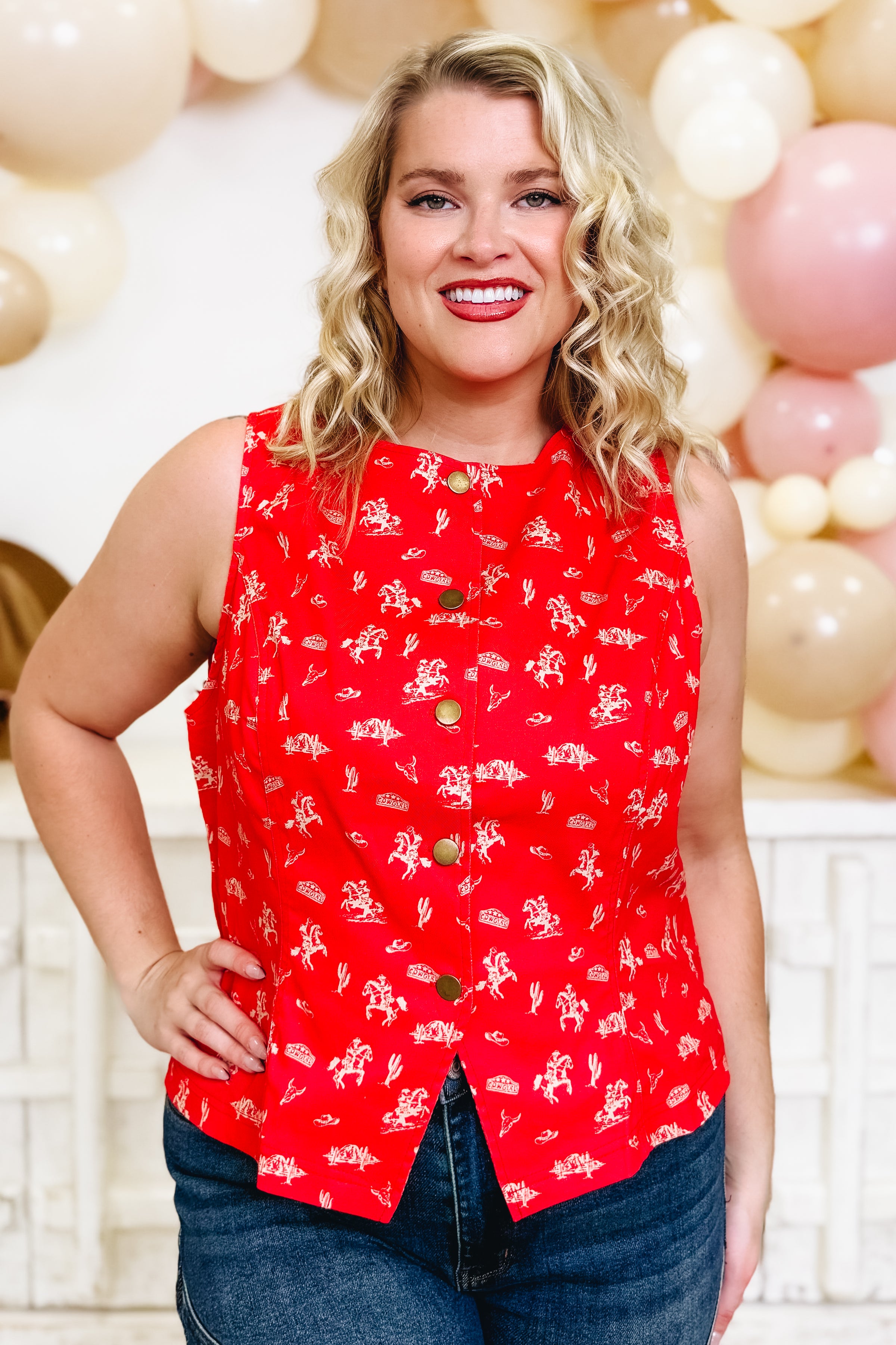 Meet your new obsession: the Saddle Up For A Good Time Vest Top. This functional button vest rocks a killer rodeo design that's equal parts bold and beautiful, all wrapped up in the perfect shade of red. Built to actually work—not just look good—this vest layers like a dream over your favorite tees and tanks. Whether you're channeling western vibes or just want to make a statement, this piece delivers serious style points. Trust us, once you slip it on, you won't want to take it off.