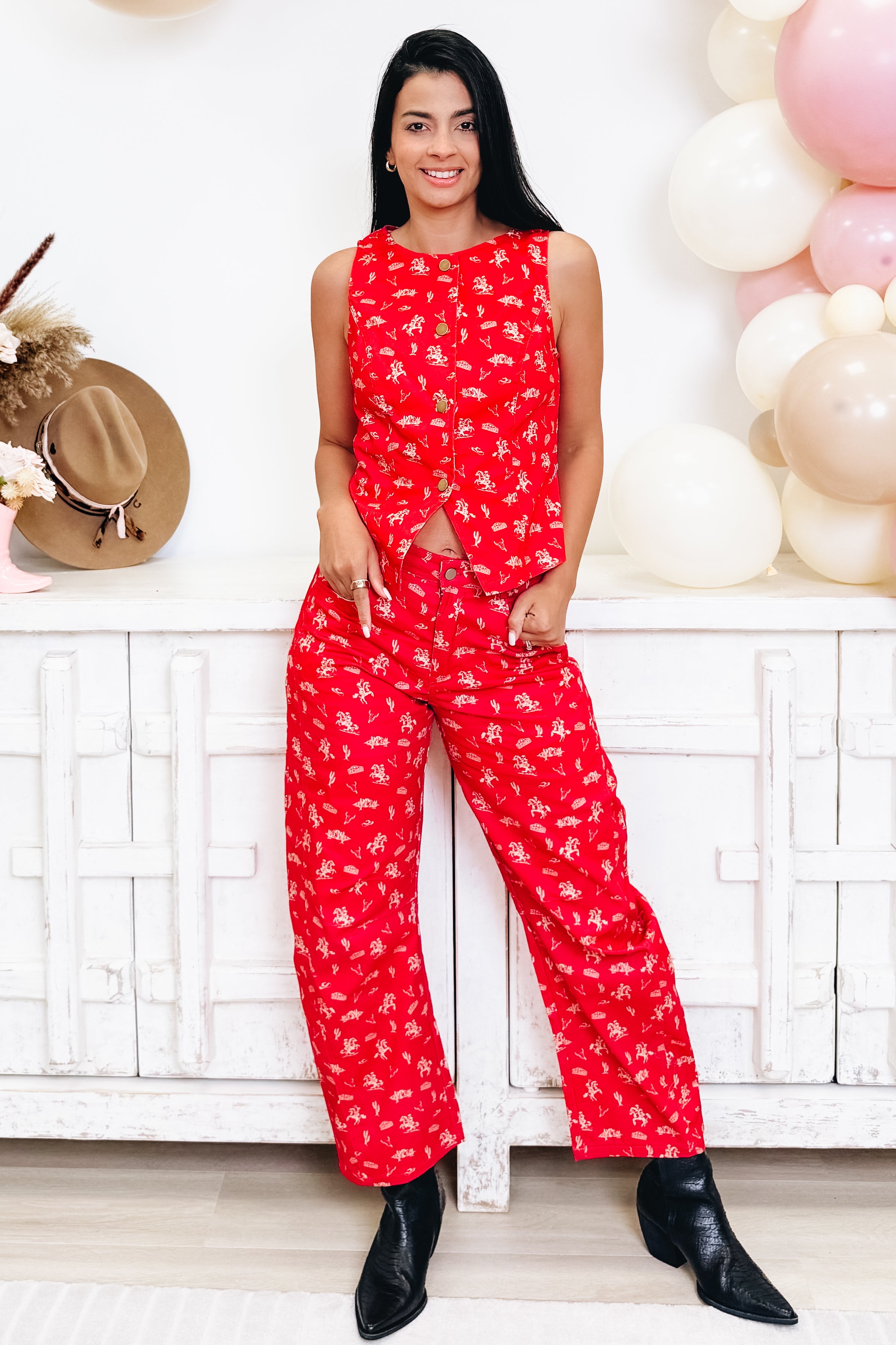 Say hello to your new favorite barrel jeans: the Saddle Up For A Good Western Pants in Red Multi. These beauties are as comfy as they are cute, with a flattering barrel silhouette that's perfect for showing off your western style. Pair them with the matching vest (sold separately) for a coordinated look that'll have everyone asking where you got your outfit. Soft, stretchy, and ready for anything from ranch days to night-out adventures, these jeans are the real deal. We're completely obsessed, and your closet will be too.