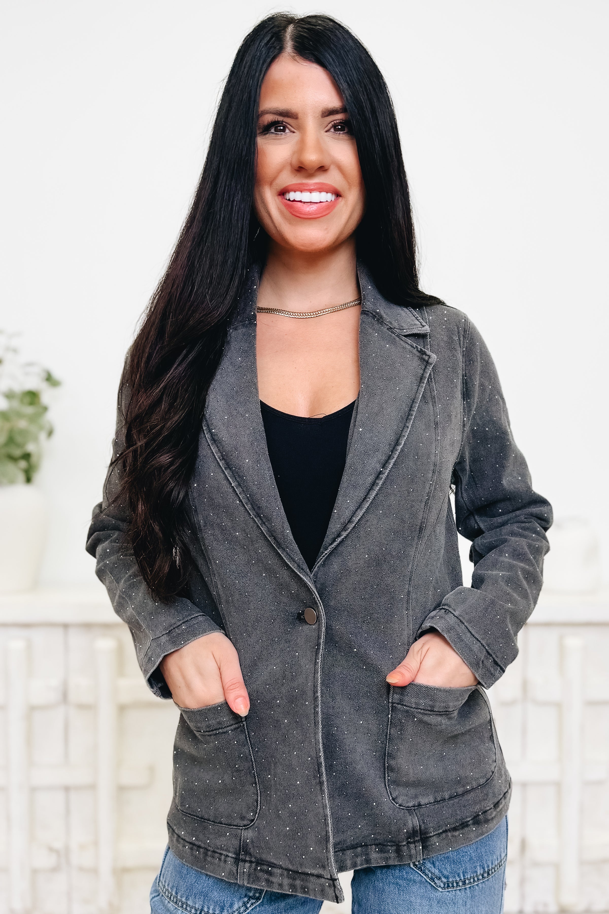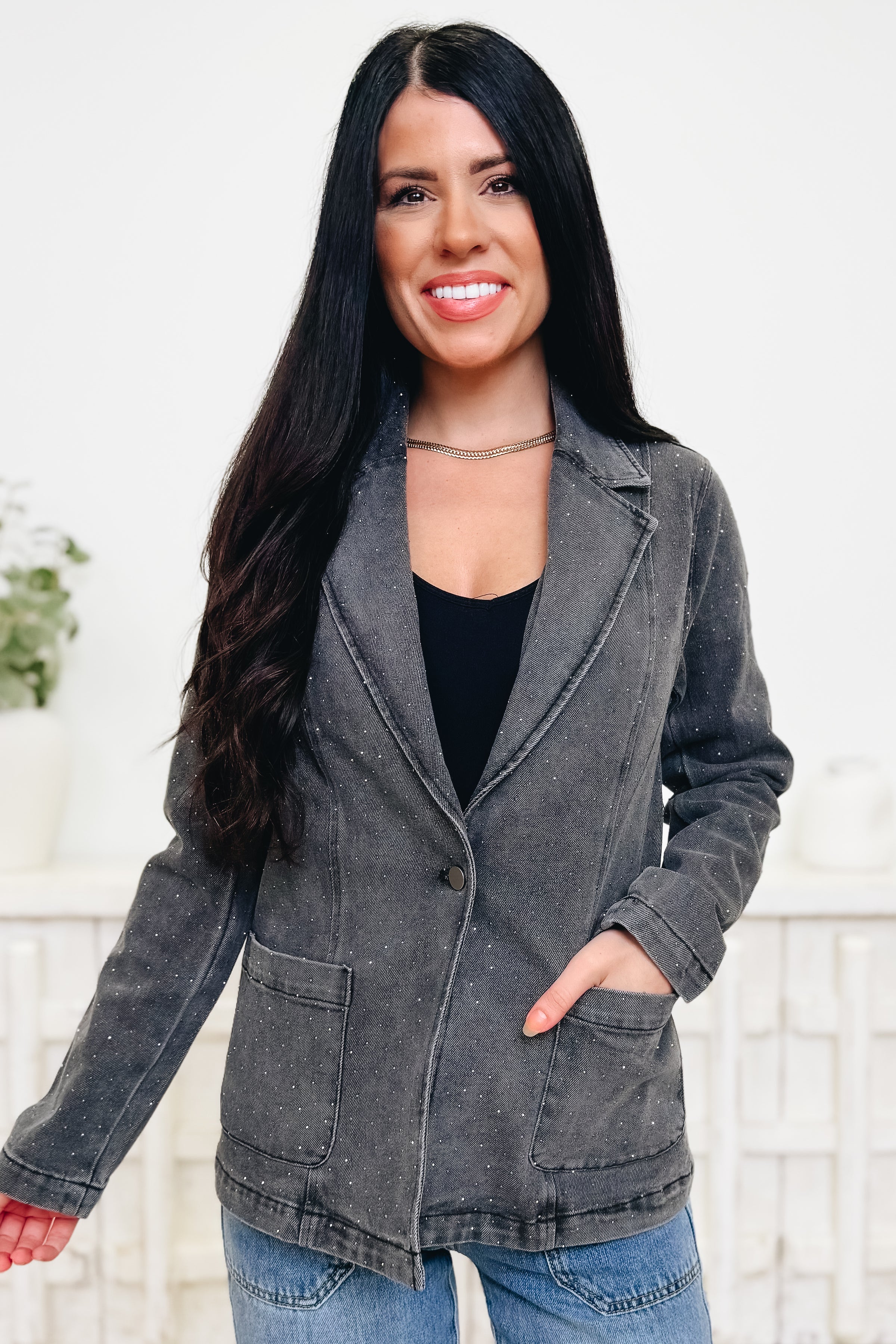 Step into your confident era with this jaw-dropping blazer! ✨ Featuring a sleek gunmetal wash sprinkled with rhinestone shimmer throughout, this piece is where edgy meets elegant. The tailored fit, front button closure, and deep pockets make it as functional as it is fabulous. Whether you’re dressing it up for a night out or adding some glam to your casual denim look, this blazer brings the sparkle in all the right ways. Style tip: Pair it with a graphic tee and heels for the ultimate cool-girl vibe — because you were born to shine.