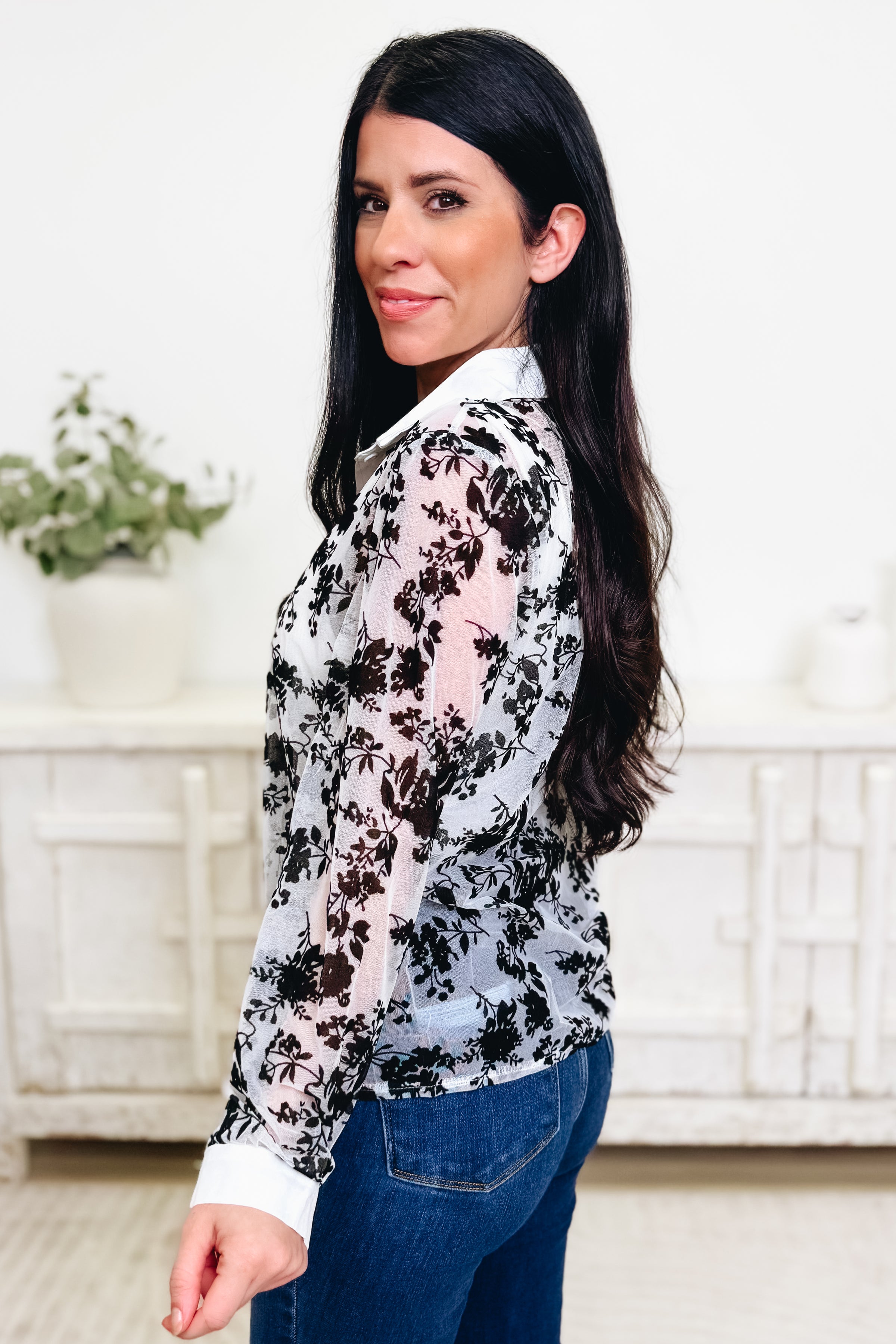 This is the most perfect sheer button down with the prettiest velvety-feel floral print in the most perfect colors. It’s super lightweight and breathable, giving you that effortless, airy feel while still looking polished. Wear it buttoned up for a chic statement or layered open over a tank for an easy, elevated look—this one is pure chic.