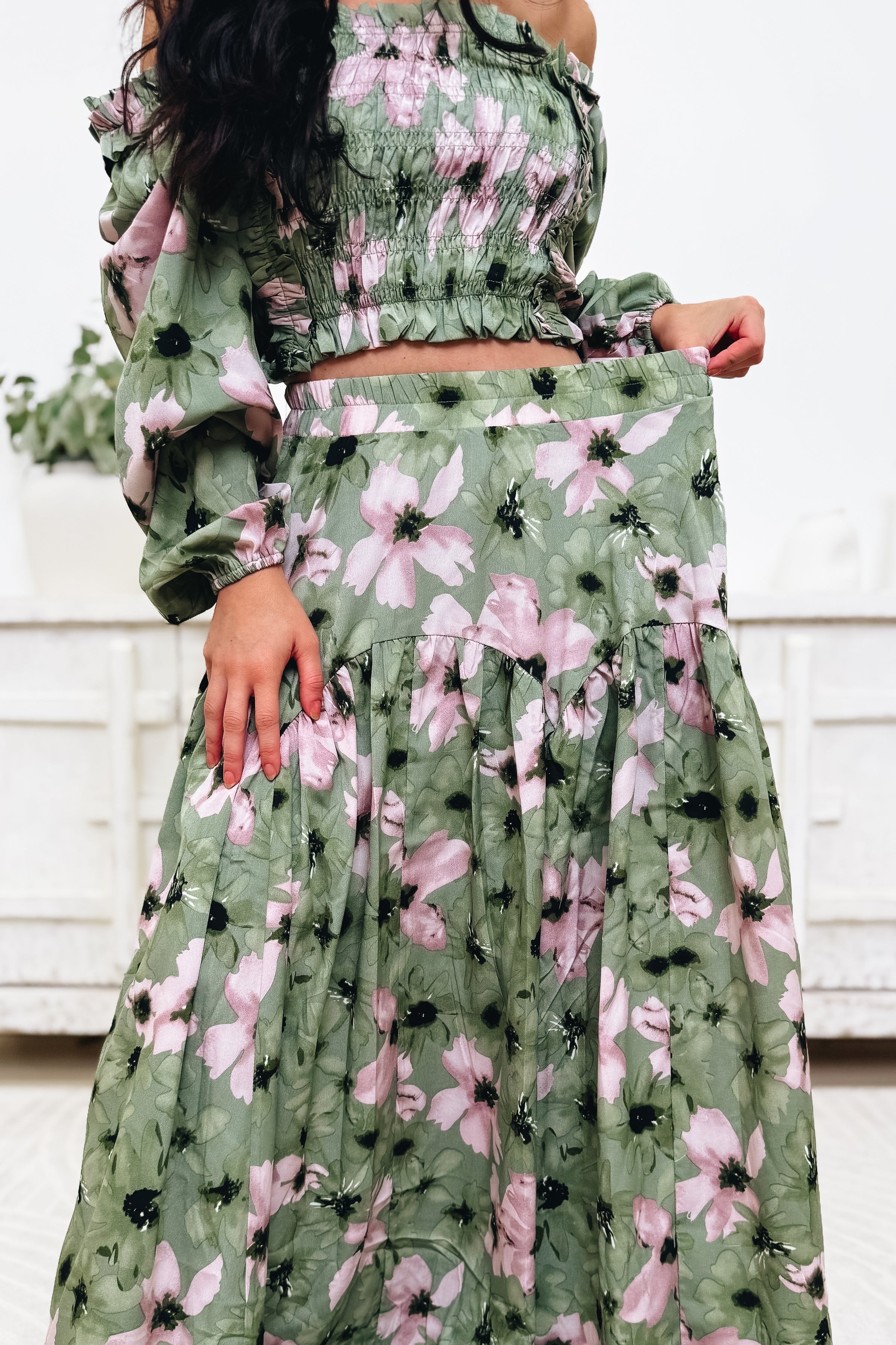 The perfect floral maxi skirt twirls like a dream with its flowy silhouette and tiered design. The elastic waistband adds a comfy fit while keeping that effortless, boho-chic look.
