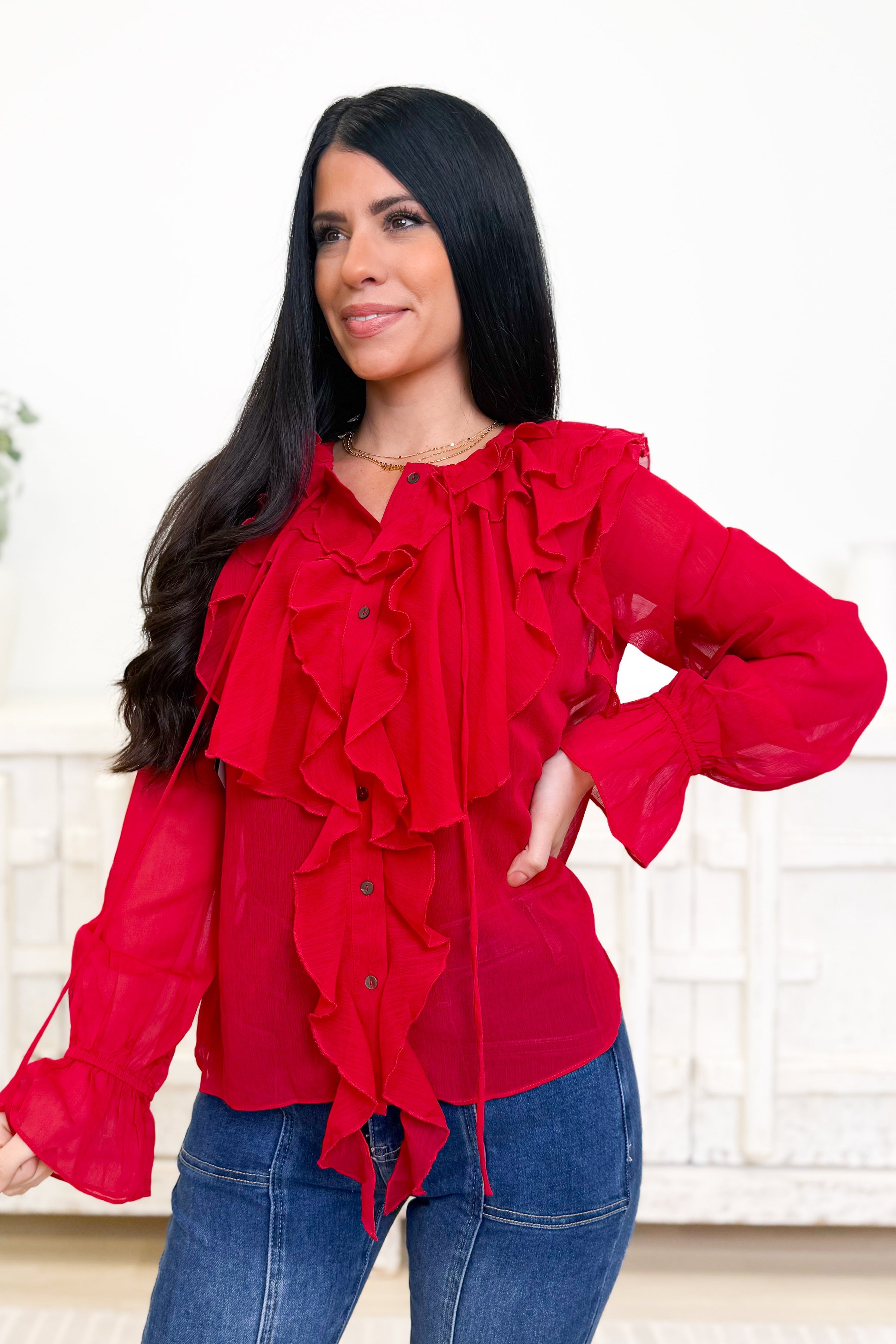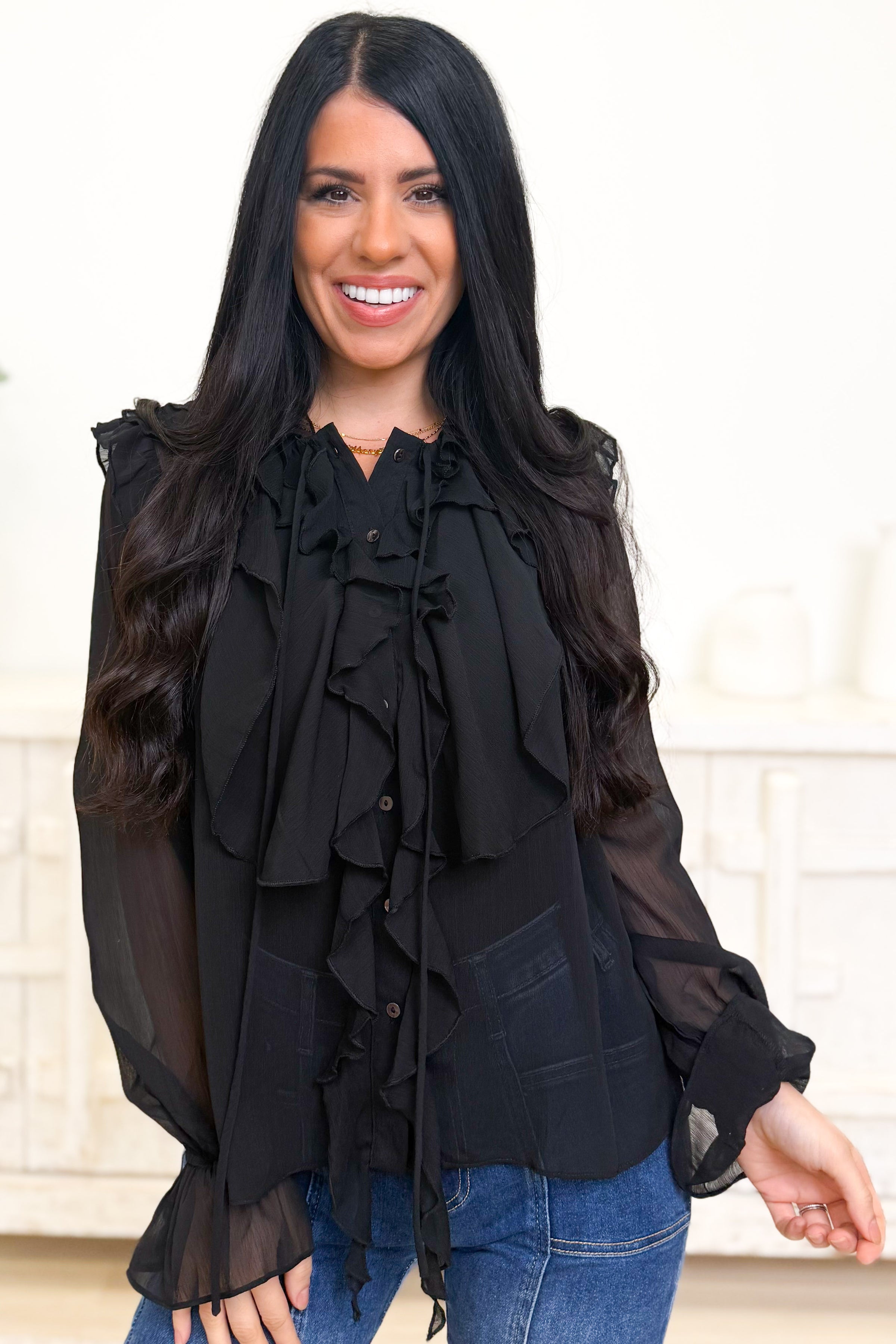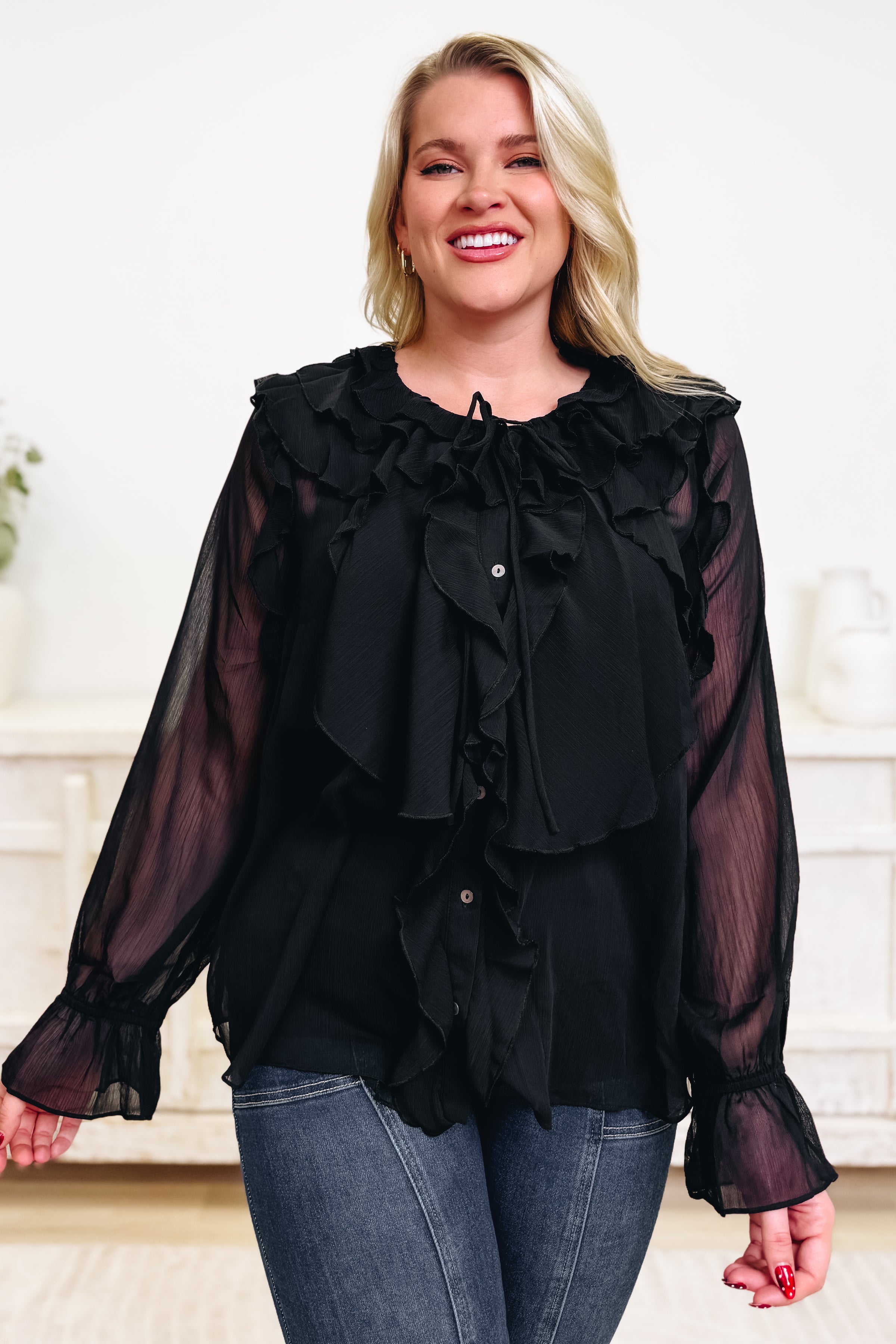 This ruffle-front blouse is made for those “dress it up” moments while still feeling light and effortless. Designed with a flowy, slightly sheer fabric, it features a statement cascade of ruffles down the front with a button-up detail and an optional tie at the neckline for a soft, feminine finish. The long sleeves have a relaxed shape with ruffled cuffs that add a little extra drama in the best way, and the easy fit makes it super flattering whether you wear it tucked or left loose. Pair it with denim for a chic elevated casual look, or style it with trousers and heels when you want a polished, night-out vibe.