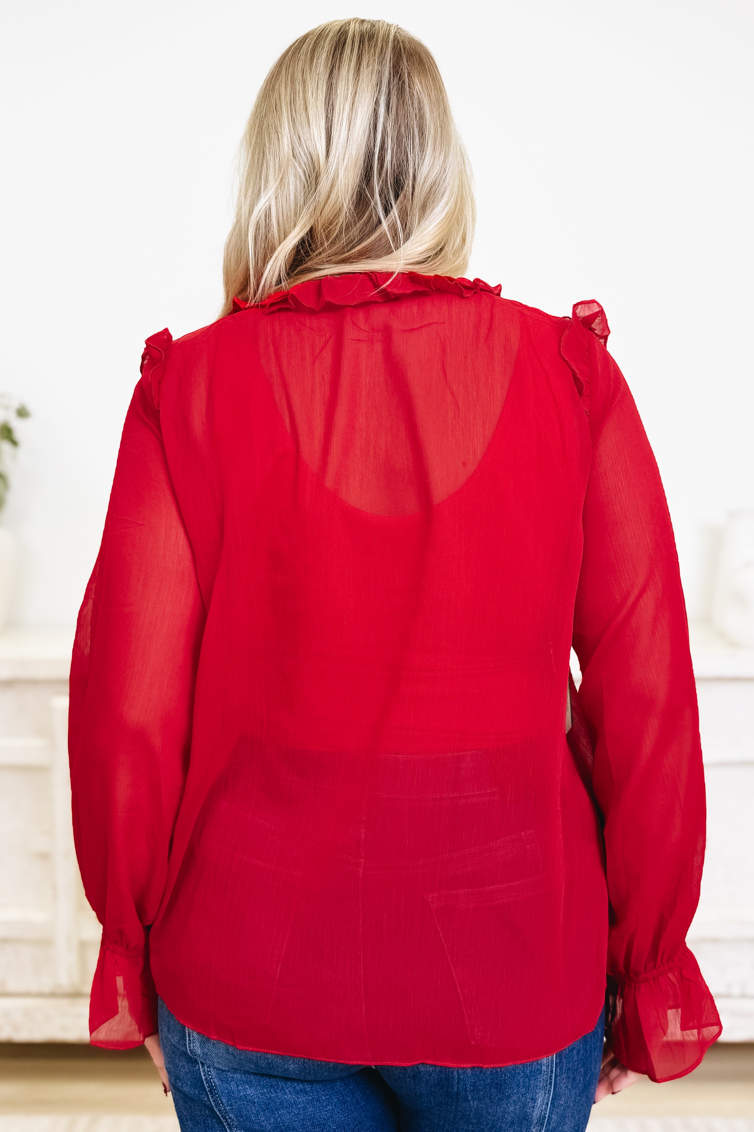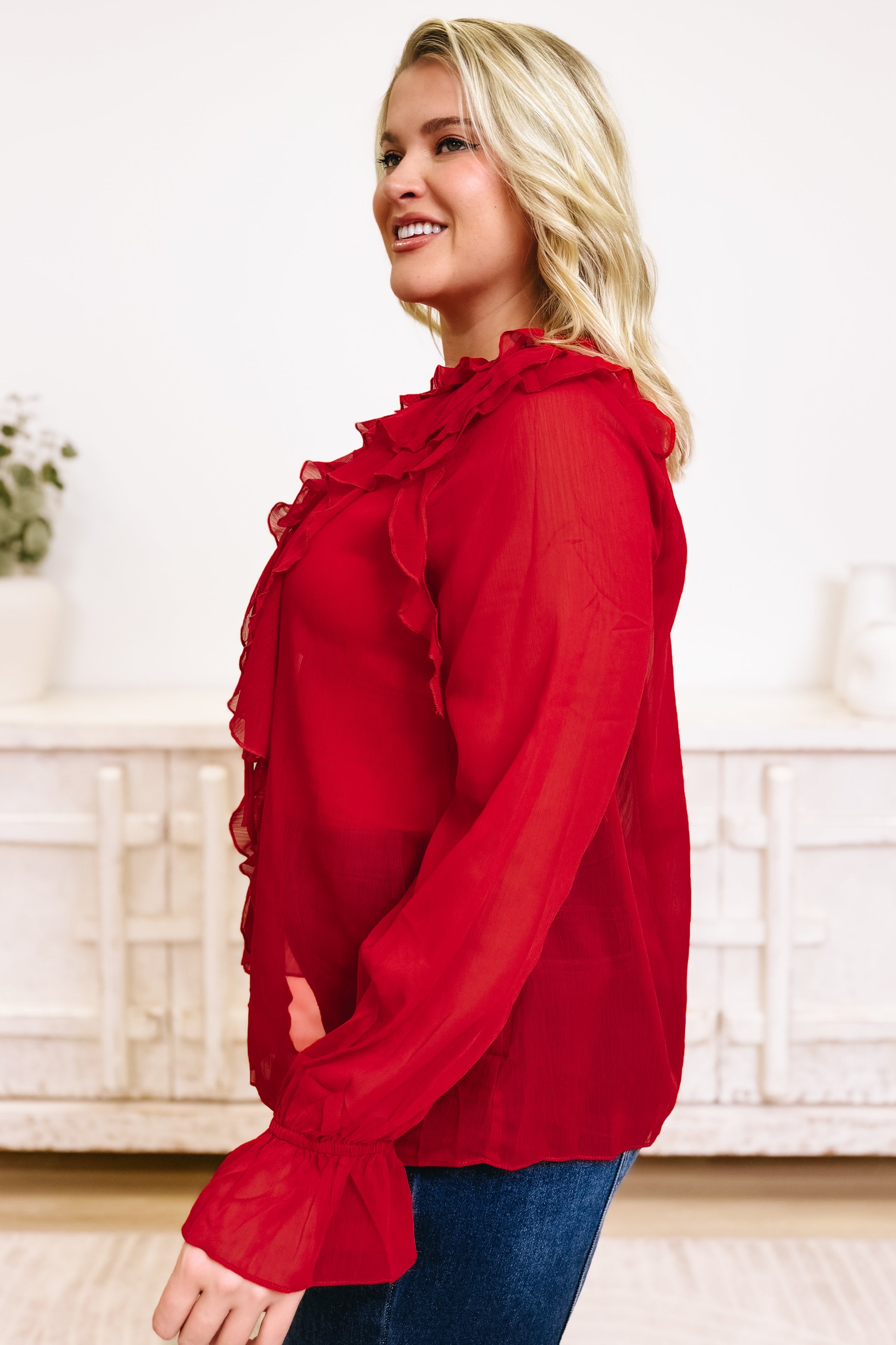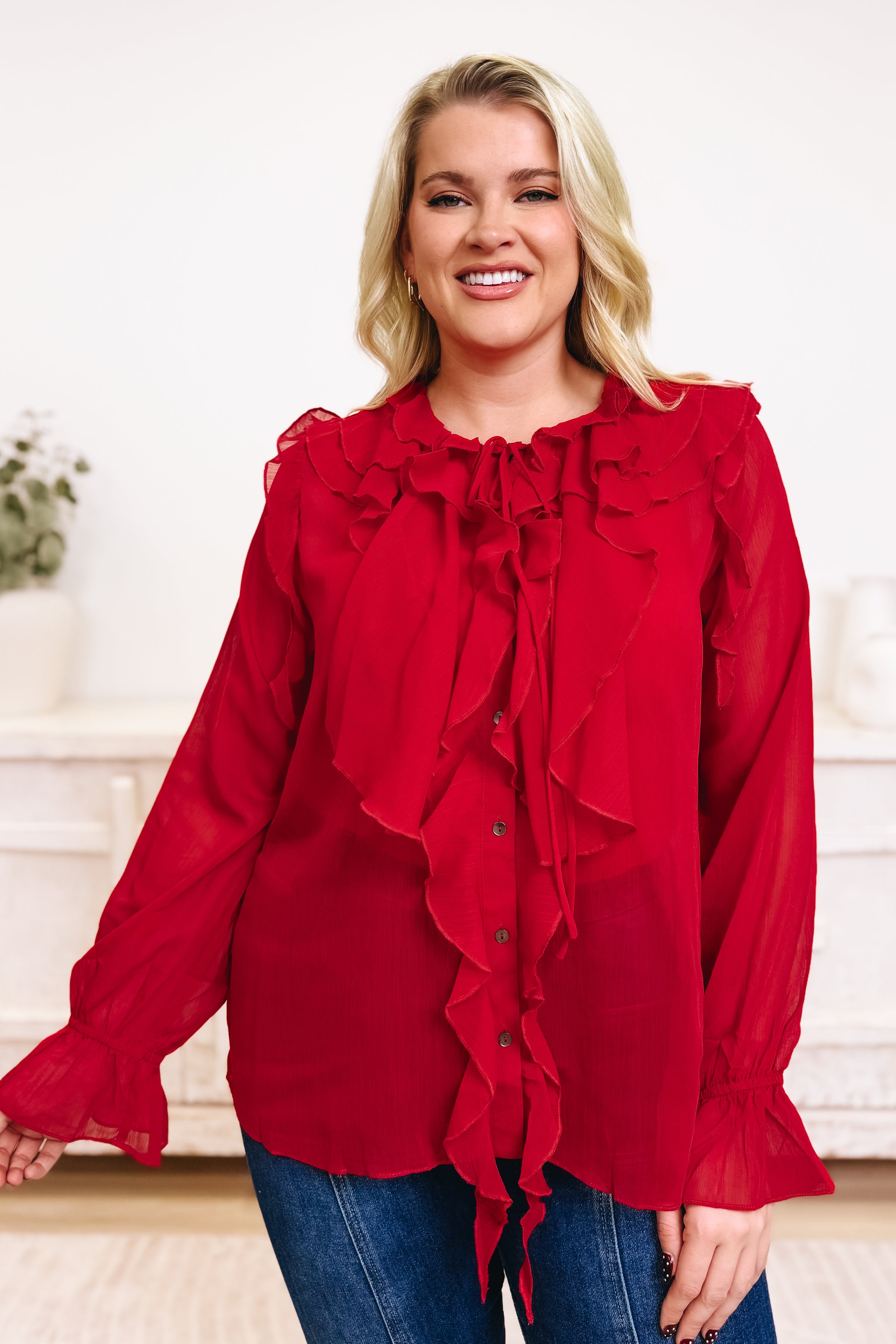 This ruffle-front blouse is made for those “dress it up” moments while still feeling light and effortless. Designed with a flowy, slightly sheer fabric, it features a statement cascade of ruffles down the front with a button-up detail and an optional tie at the neckline for a soft, feminine finish. The long sleeves have a relaxed shape with ruffled cuffs that add a little extra drama in the best way, and the easy fit makes it super flattering whether you wear it tucked or left loose. Pair it with denim for a chic elevated casual look, or style it with trousers and heels when you want a polished, night-out vibe.