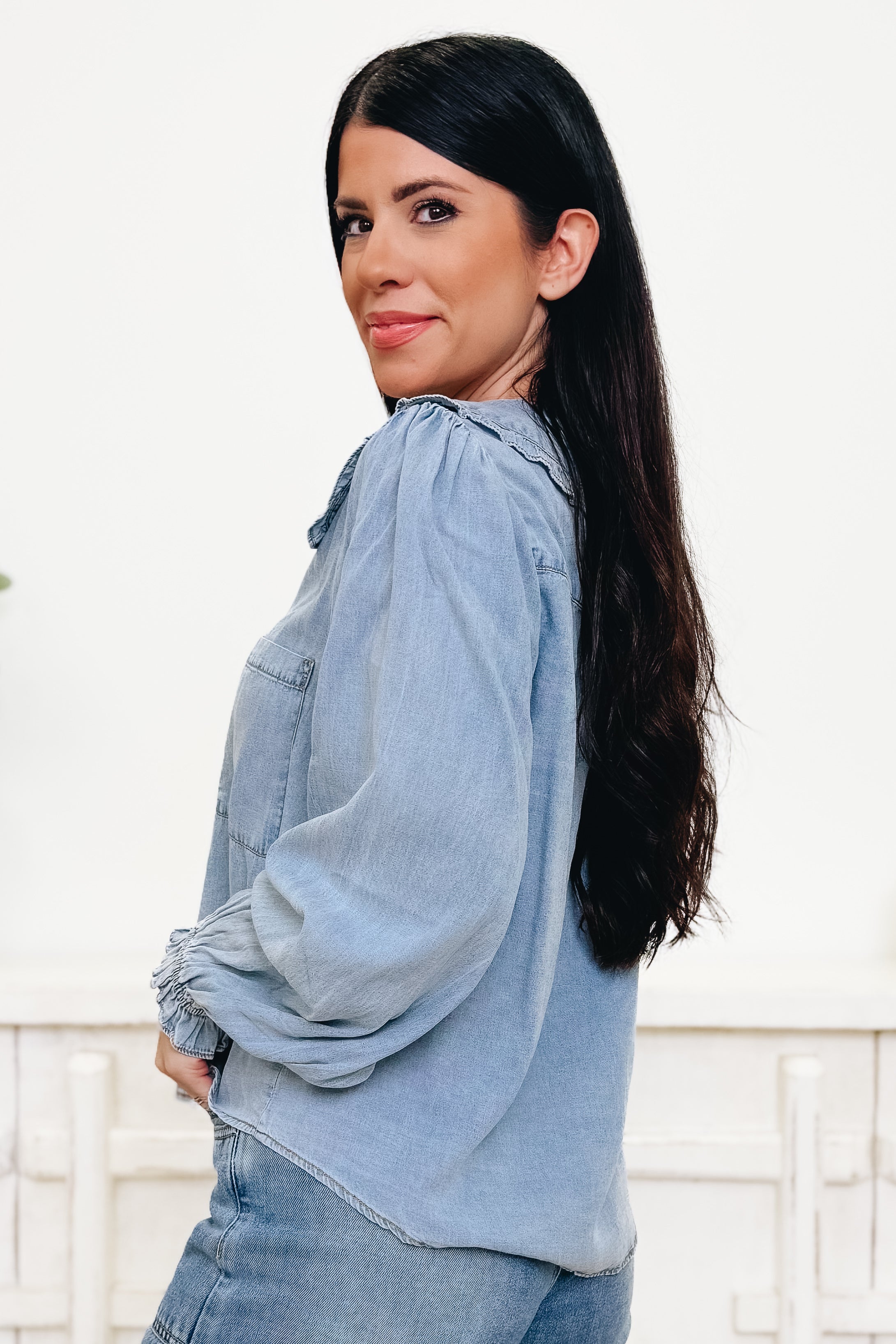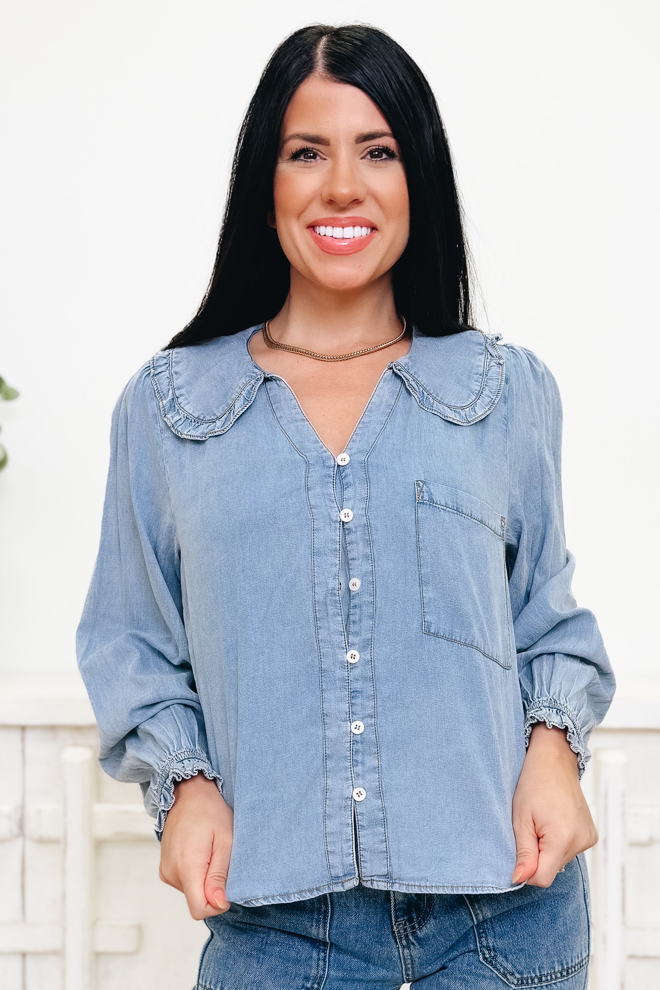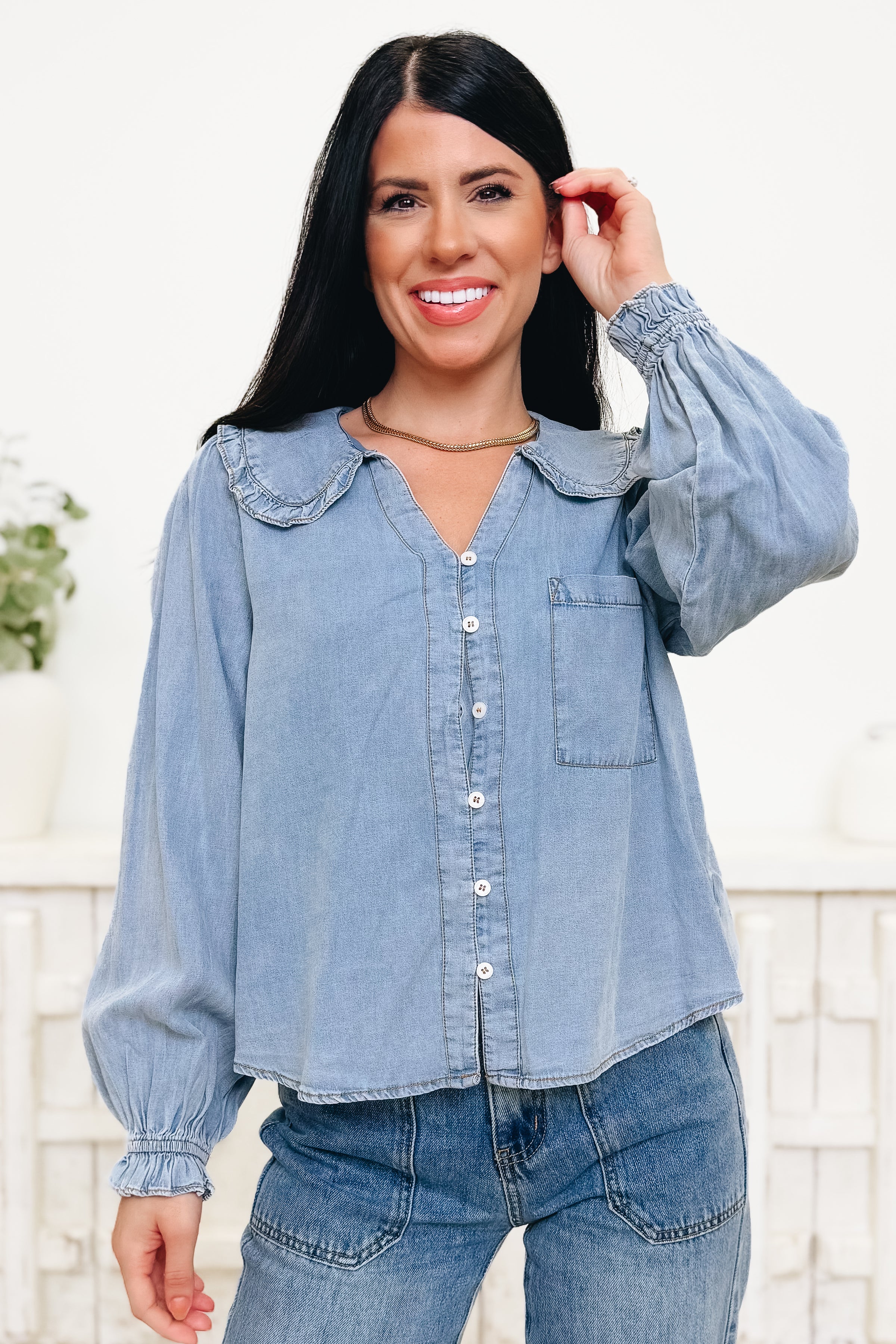 Sweet meets casual in this darling denim top! Featuring a soft mineral wash finish and the cutest scalloped collar detail, this blouse gives off major vintage-chic vibes. The button-down front and relaxed fit make it easy to style, while the gathered sleeves add just the right touch of feminine flair. Perfect for pairing with your favorite jeans or a cute skirt — this top is a total must for your everyday wardrobe!